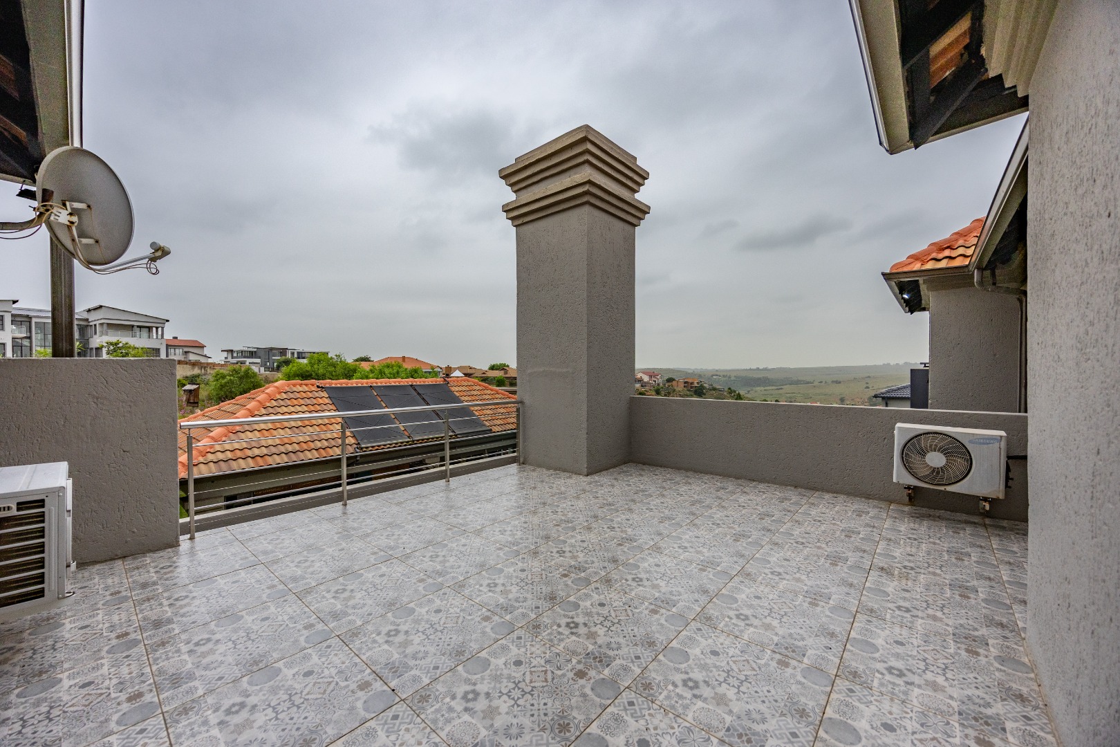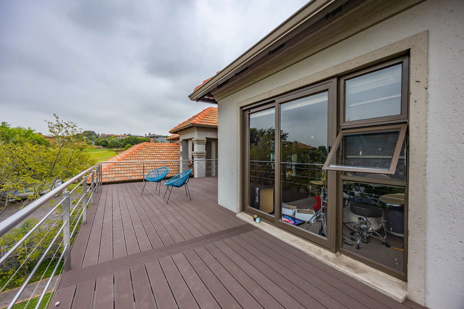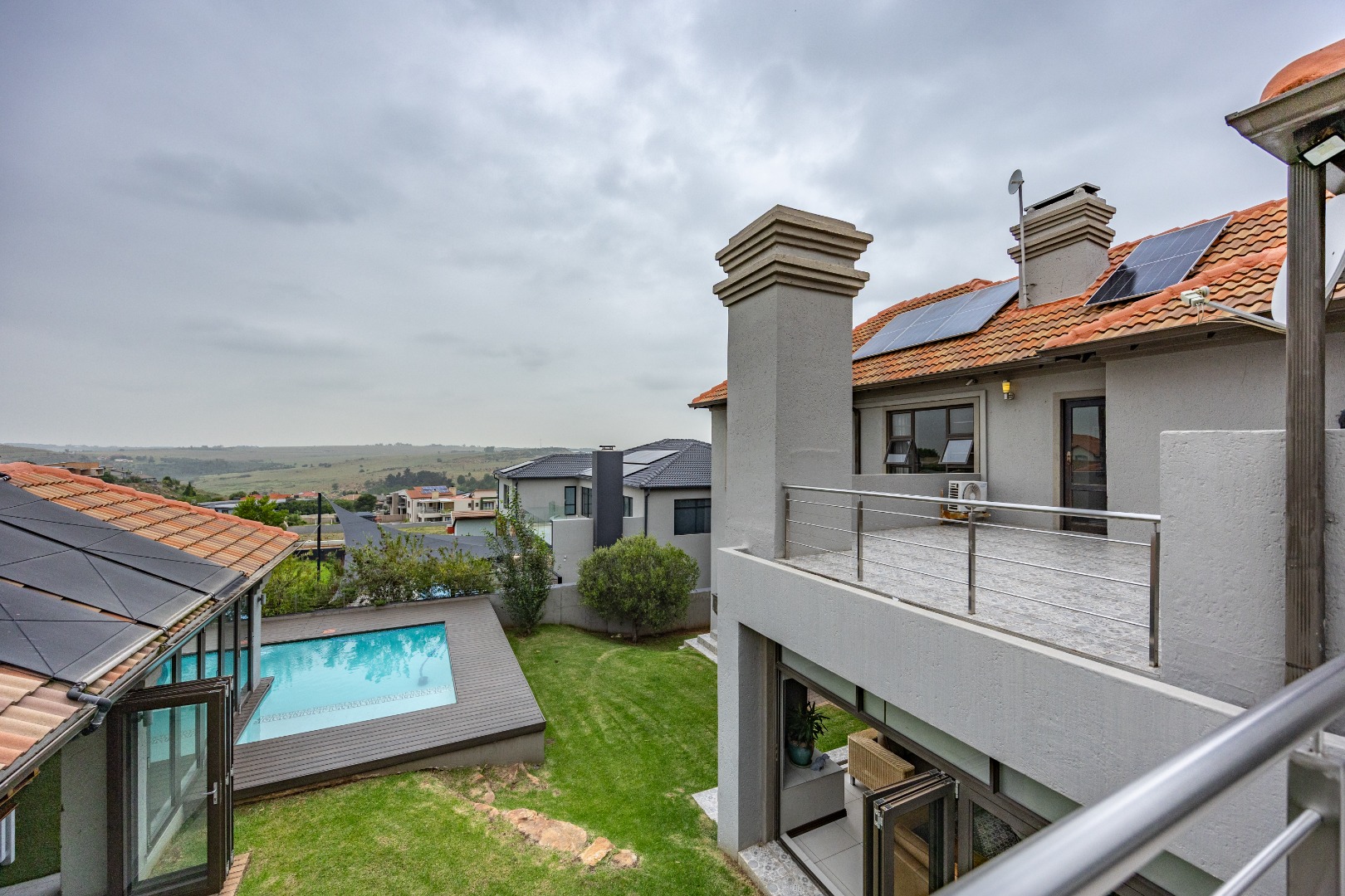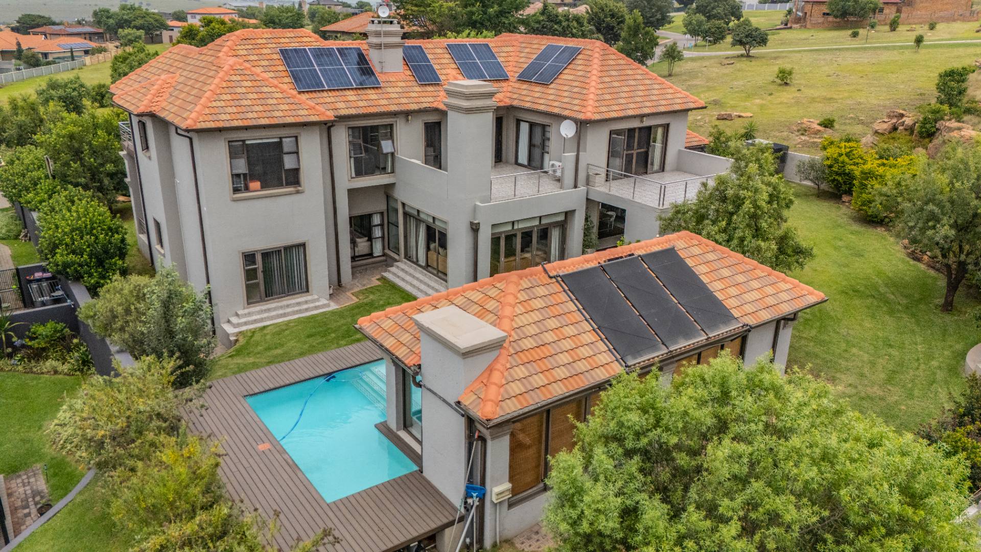 Upstairs features another pajama lounge with fireplace, a built-in bookshelf at the top of the stairs, and a large balcony overlooking the backyard. Bedroom 1 has ample cupboards, Bedroom 2 opens onto a massive deck with dam views and has a full bathroom, and the main bedroom offers a private balcony to the backyard, walk-in closet, and a full en-suite bathroom. All upstairs bedrooms are fitted with air-conditioning. The home is powered by a solar system with 2 inverters and 15kVA batteries, adding serious value and peace of mind. A permanent greenbelt surrounds the home, ensuring no future building nearby—privacy guaranteed.