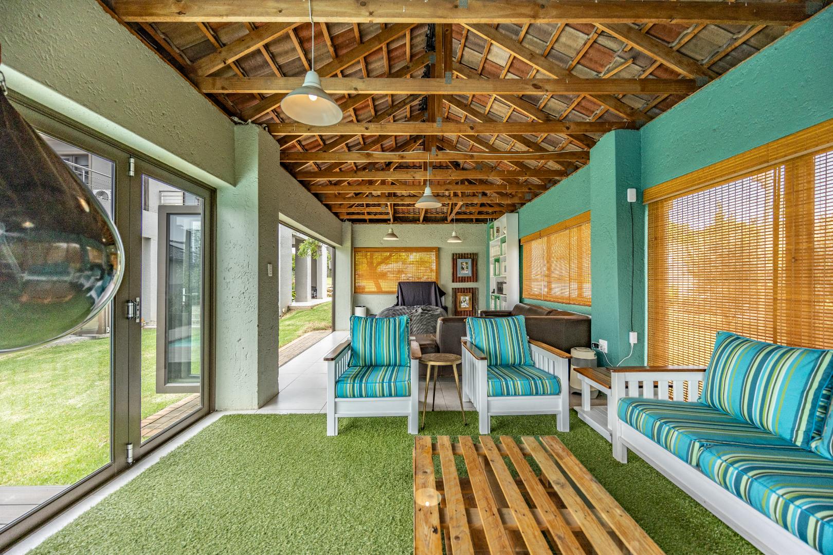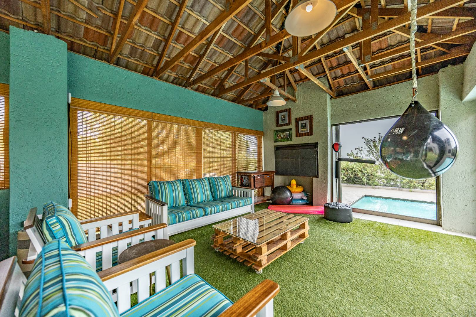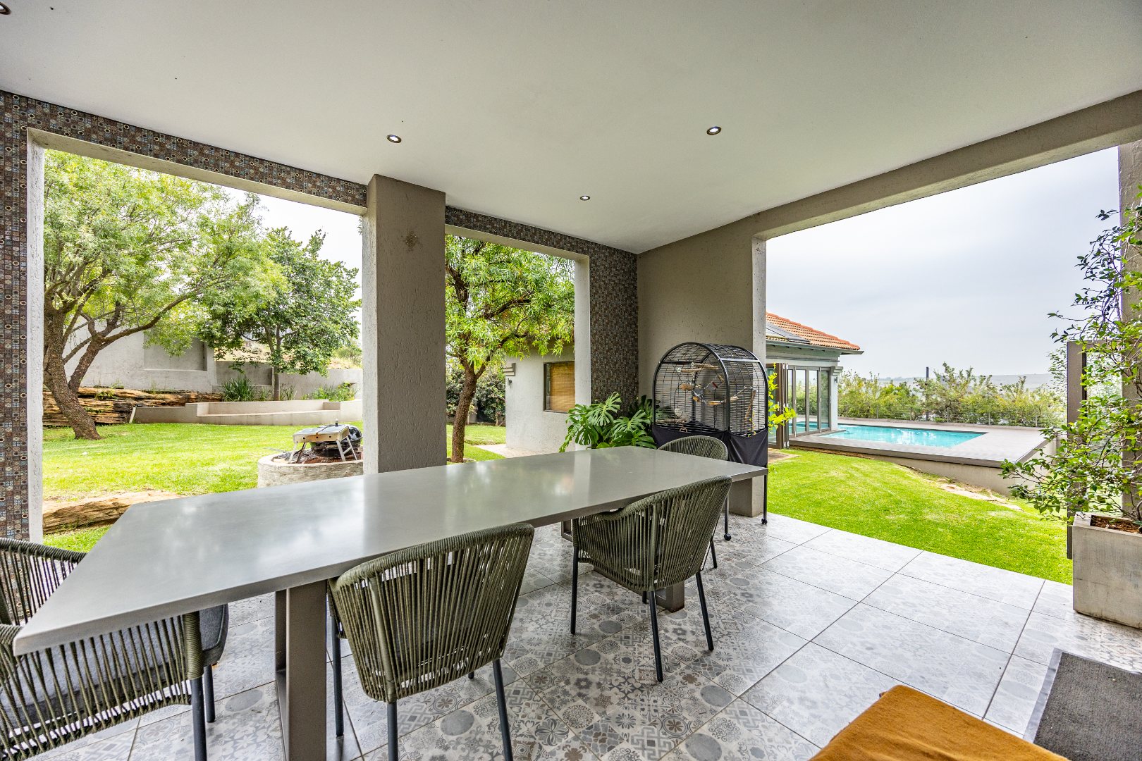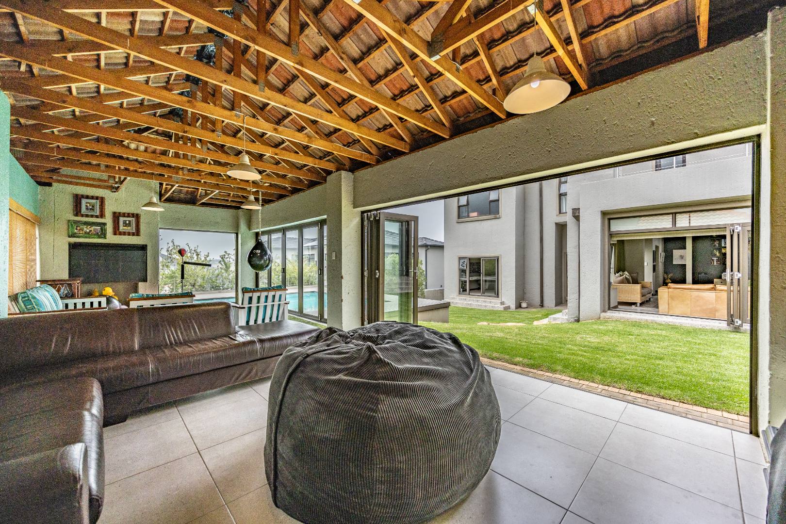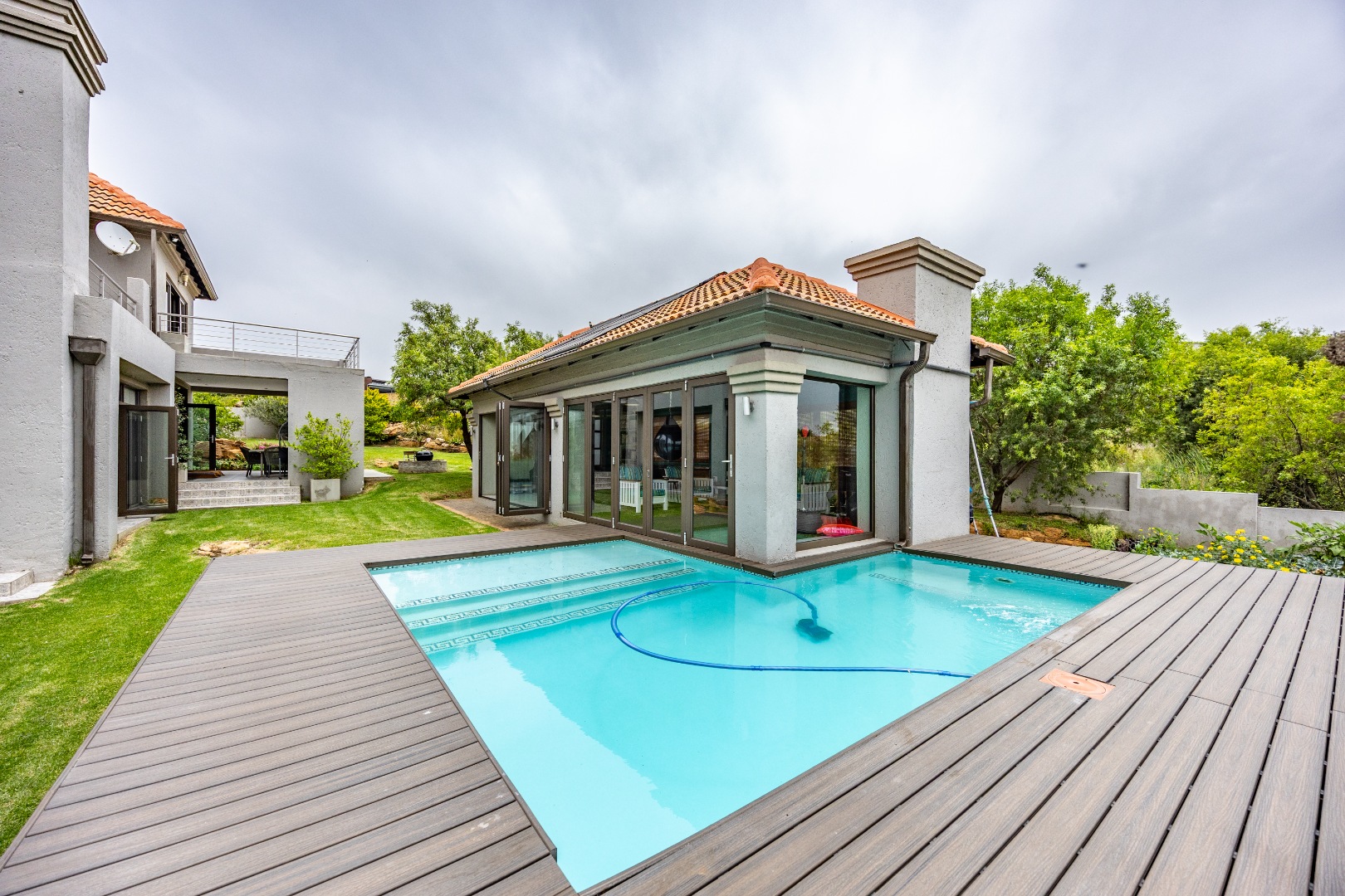 The heart of the home is the open-plan kitchen and dining area, complemented by a striking built-in bookshelf. The kitchen offers a walk-in pantry and separate scullery, flowing effortlessly to the double garages, which provide direct access into the scullery and outside. Outdoors you’ll find domestic quarters with a bathroom, a laundry positioned between the room and bathroom, and an additional storeroom. The covered patio with quality tiling leads onto a landscaped garden with irrigation, while the entertainment area with built-in braai opens onto the pool and wooden deck, making it perfect for hosting.