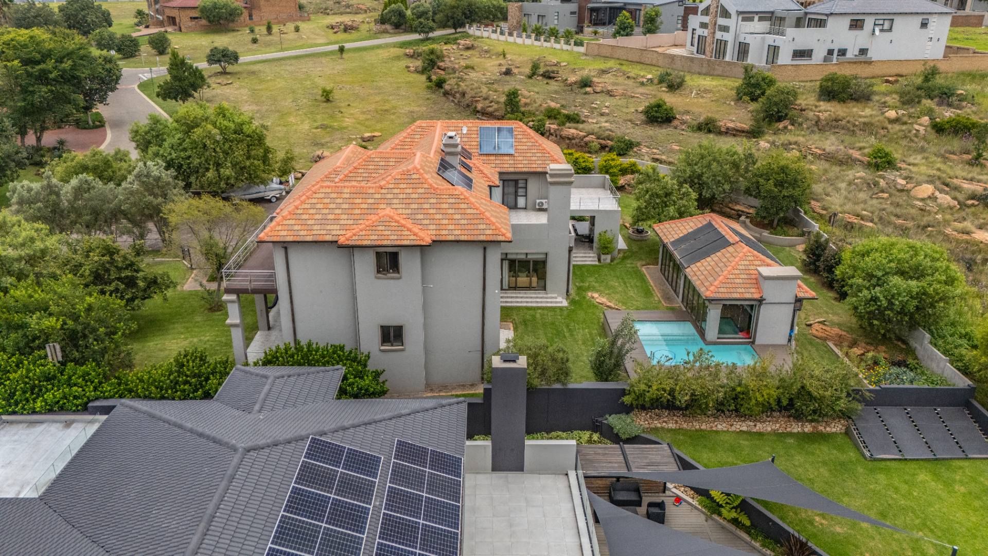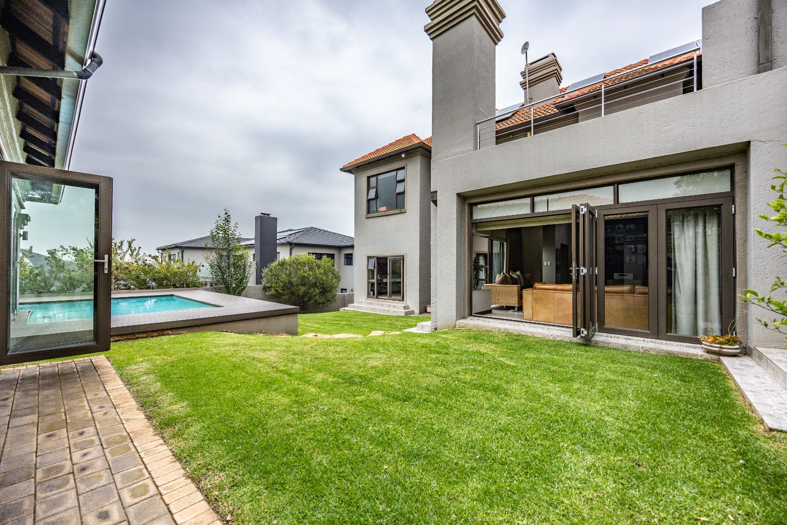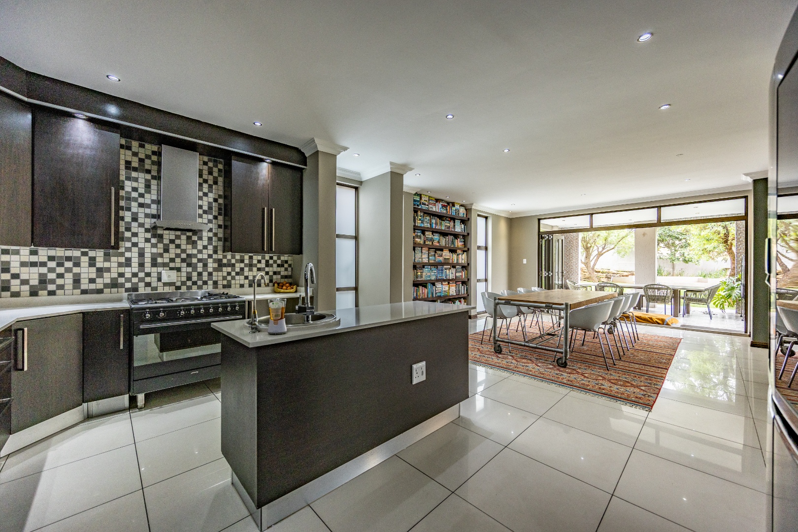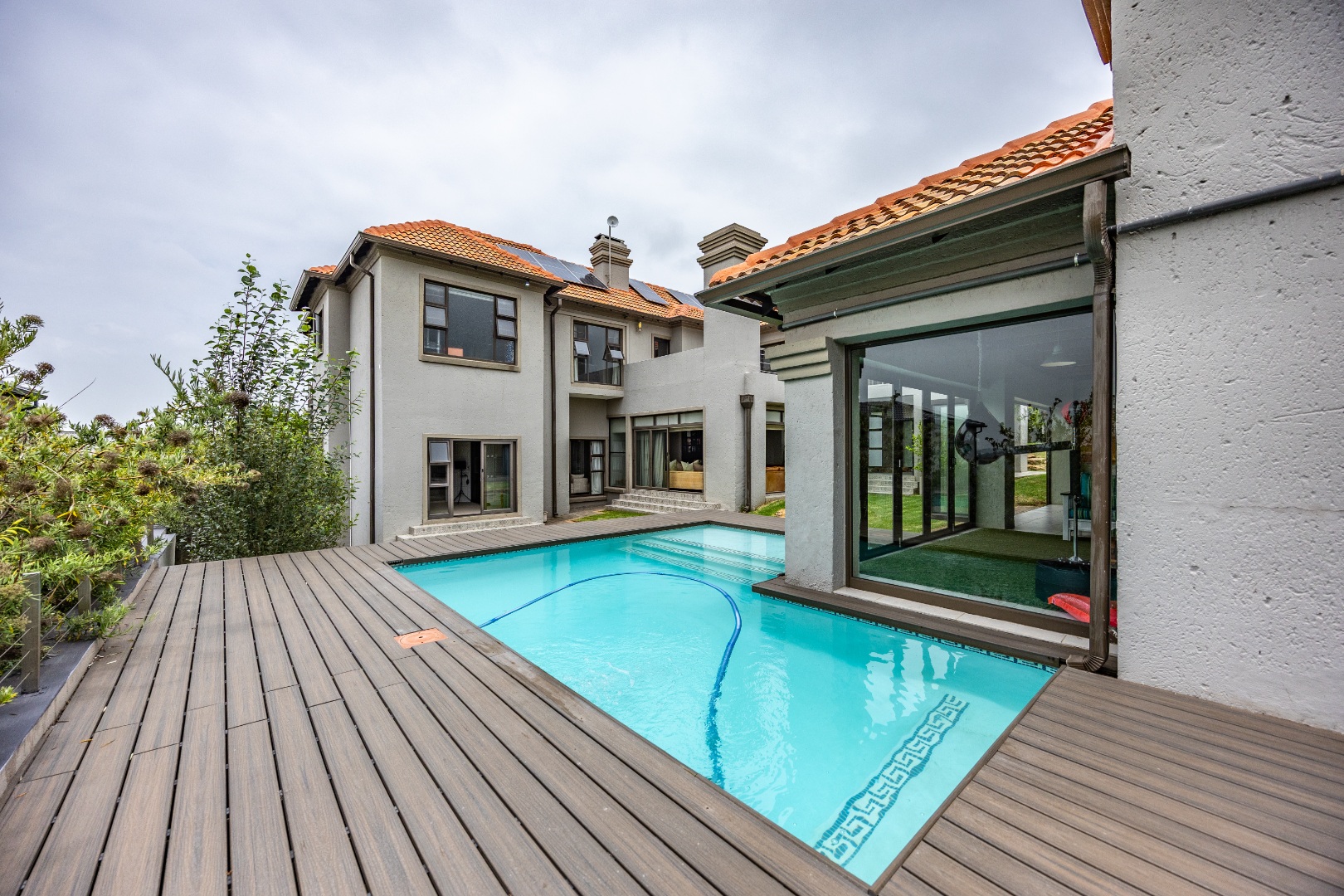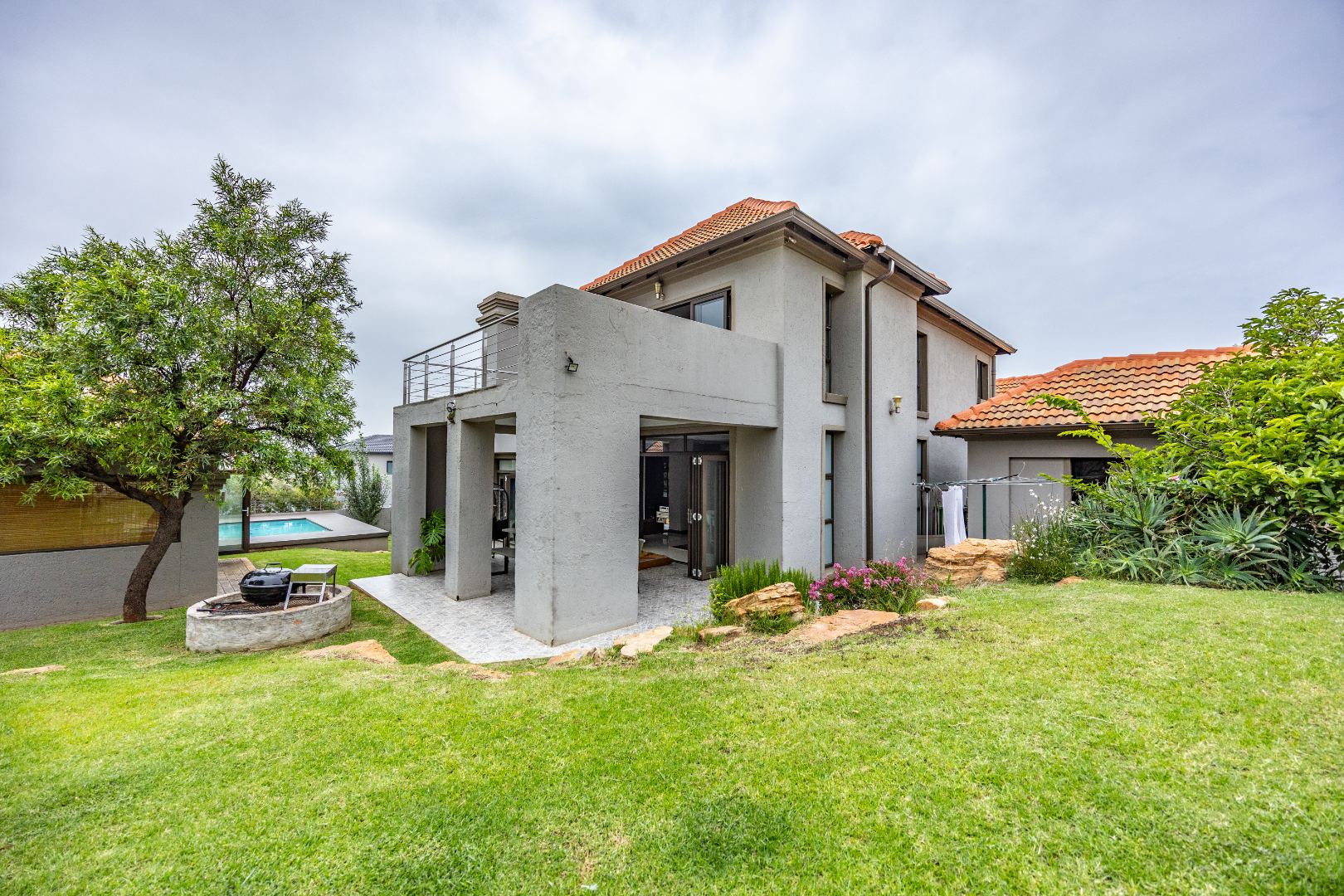 The heart of the home is the open-plan kitchen and dining area, complemented by a striking built-in bookshelf. The kitchen offers a walk-in pantry and separate scullery, flowing effortlessly to the double garages, which provide direct access into the scullery and outside. Outdoors you’ll find domestic quarters with a bathroom, a laundry positioned between the room and bathroom, and an additional storeroom. The covered patio with quality tiling leads onto a landscaped garden with irrigation, while the entertainment area with built-in braai opens onto the pool and wooden deck, making it perfect for hosting.
