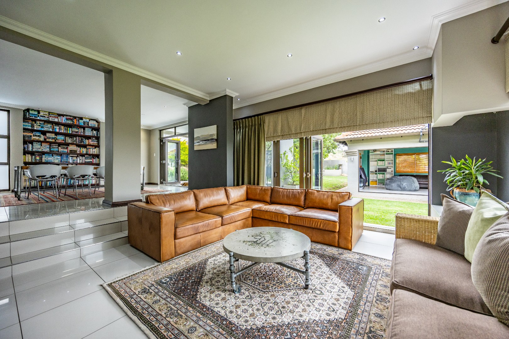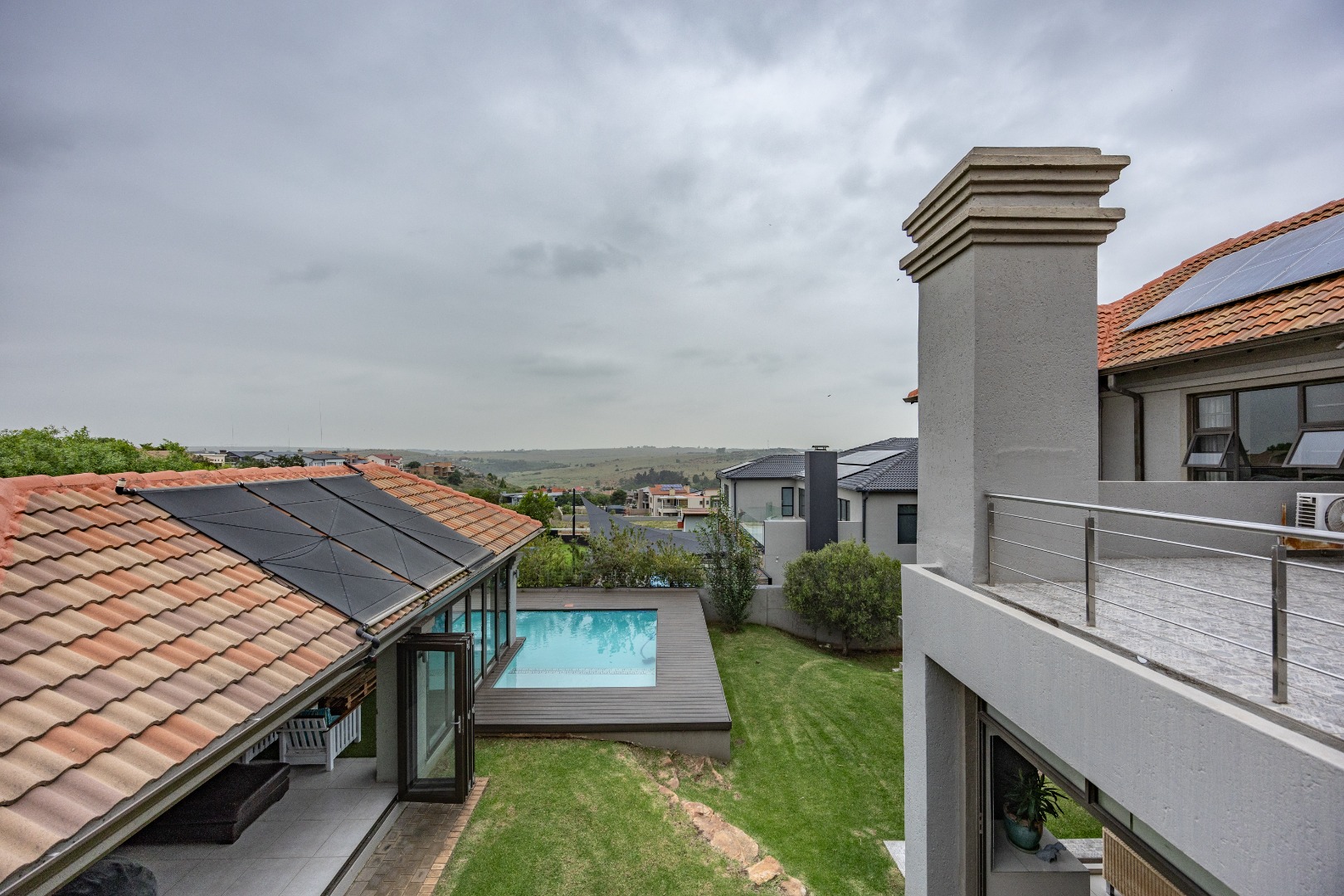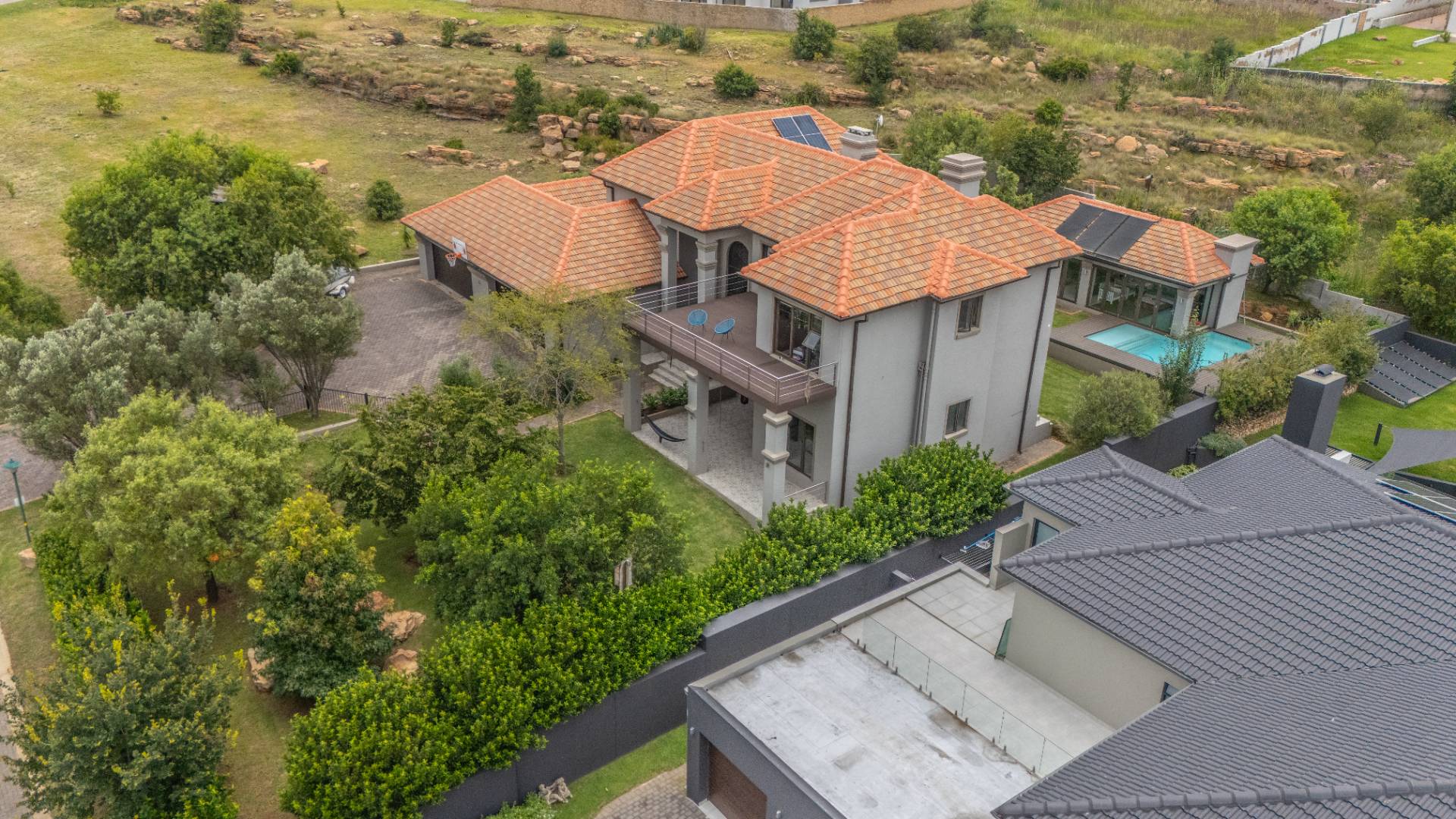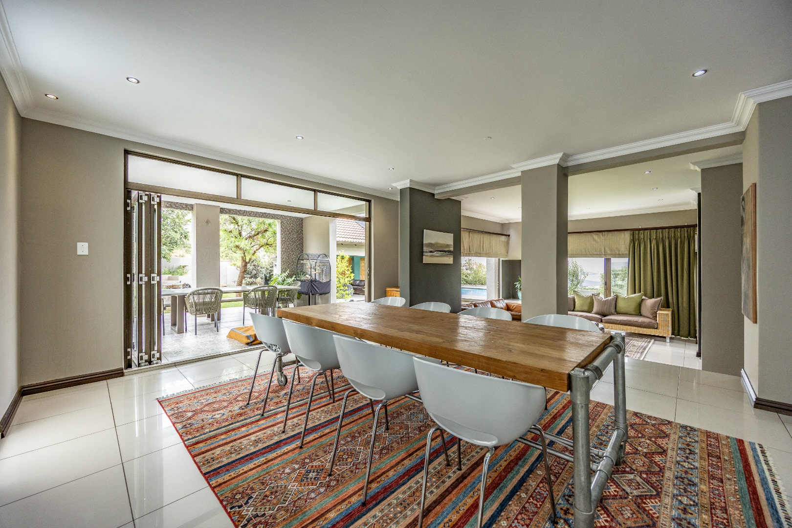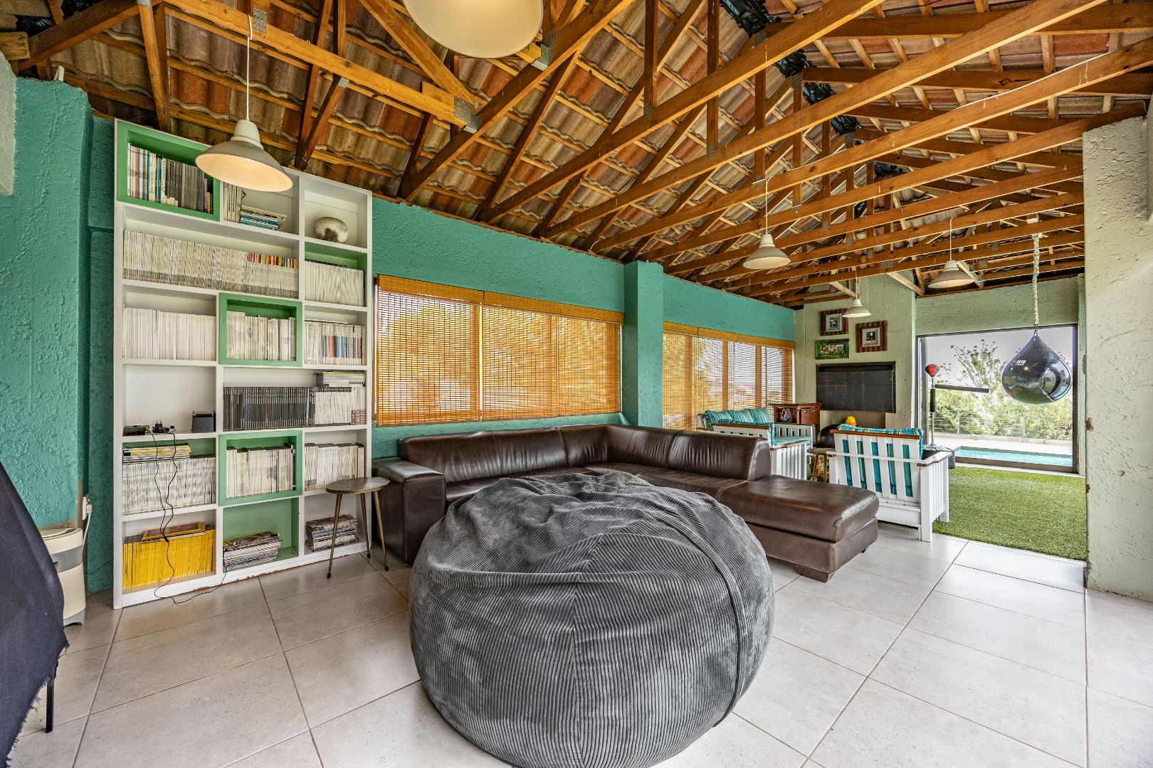 The heart of the home is the open-plan kitchen and dining area, complemented by a striking built-in bookshelf. The kitchen offers a walk-in pantry and separate scullery, flowing effortlessly to the double garages, which provide direct access into the scullery and outside. Outdoors you’ll find domestic quarters with a bathroom, a laundry positioned between the room and bathroom, and an additional storeroom. The covered patio with quality tiling leads onto a landscaped garden with irrigation, while the entertainment area with built-in braai opens onto the pool and wooden deck, making it perfect for hosting.