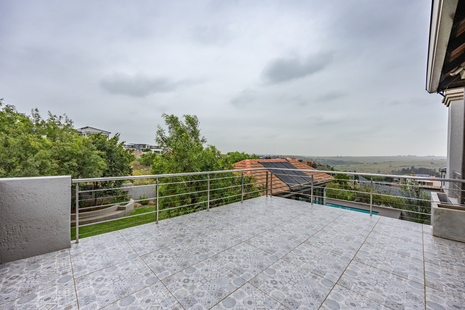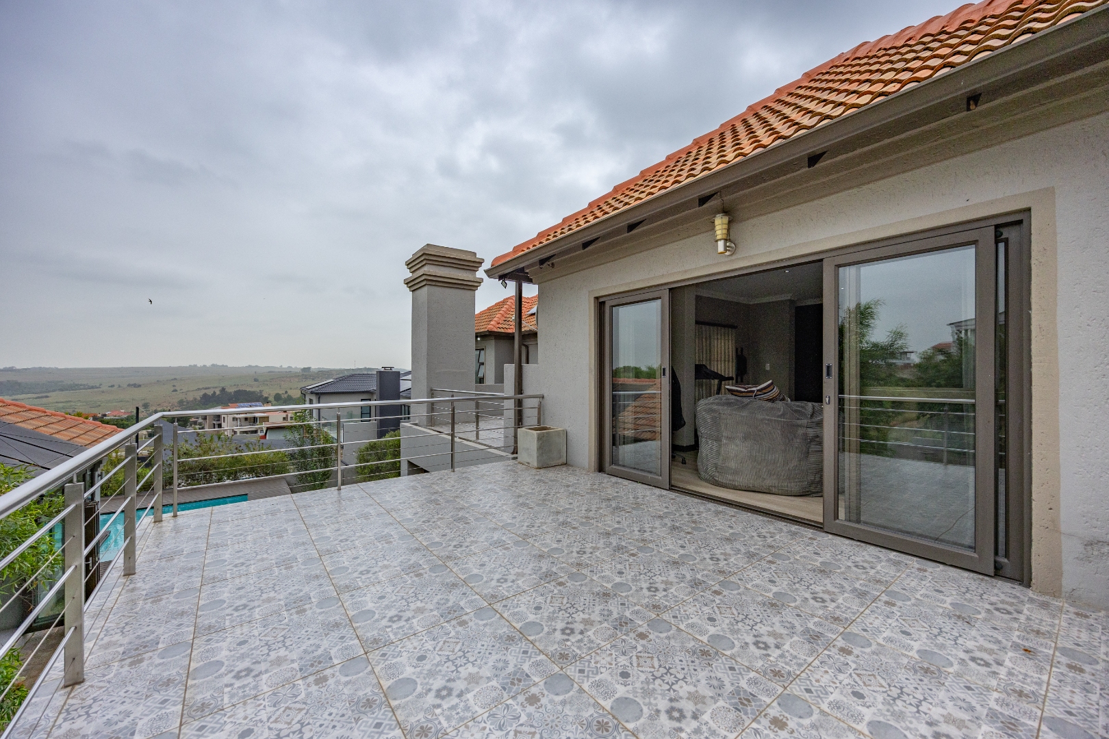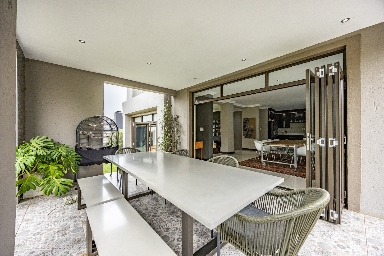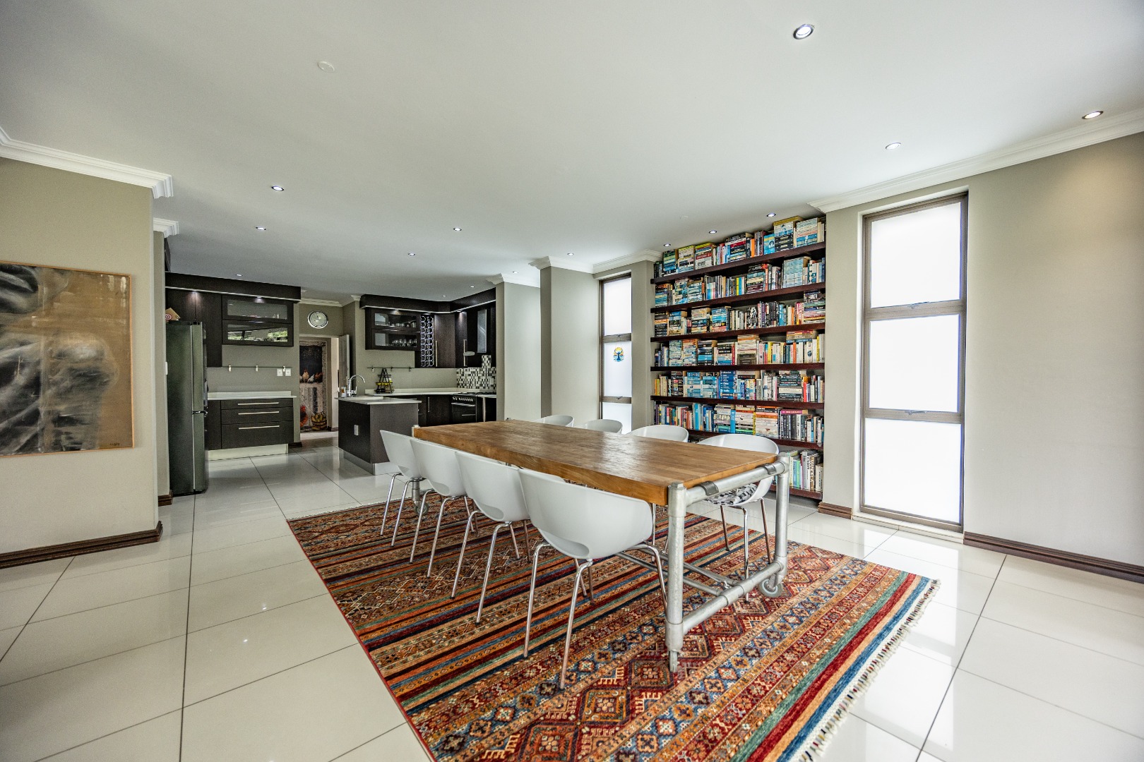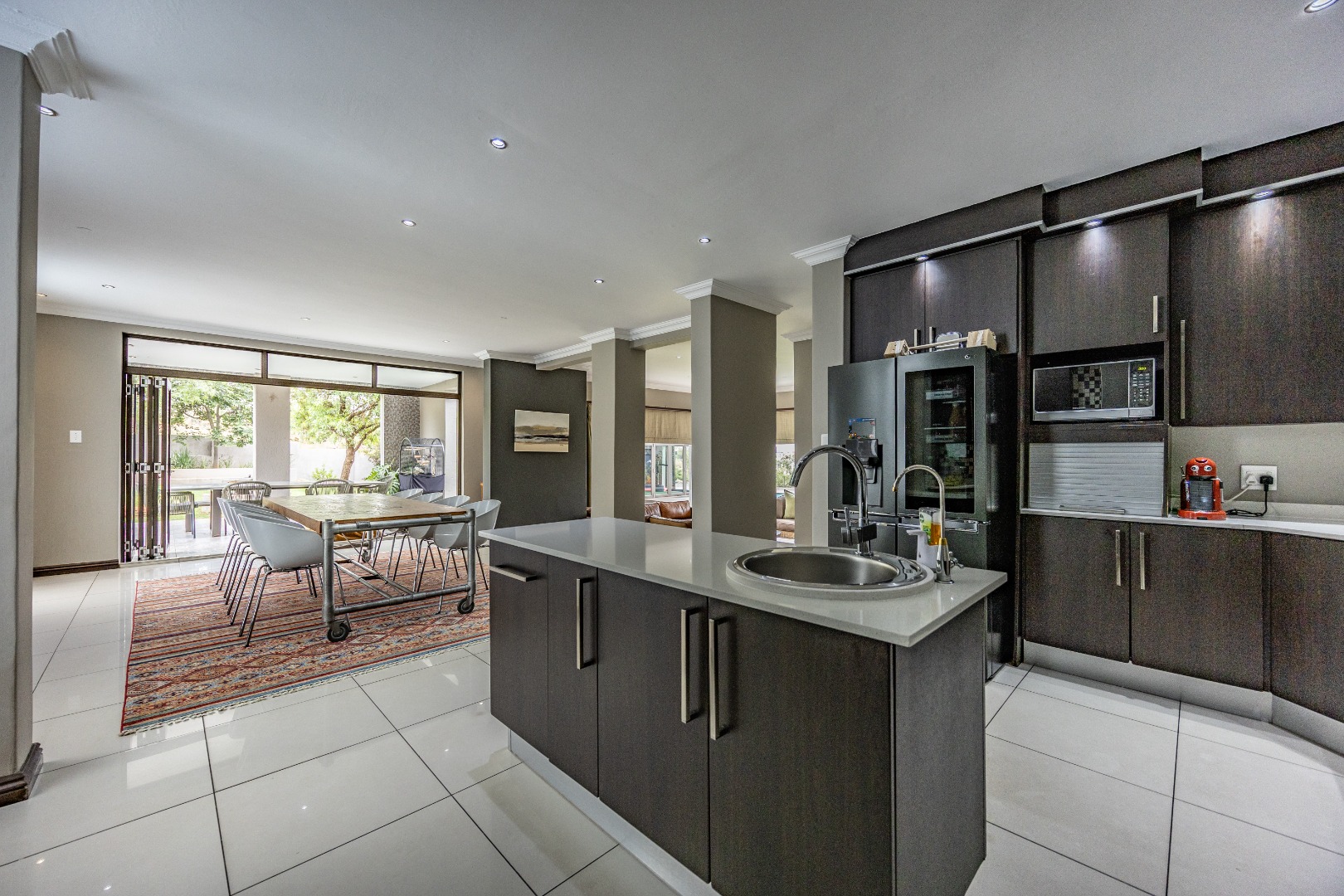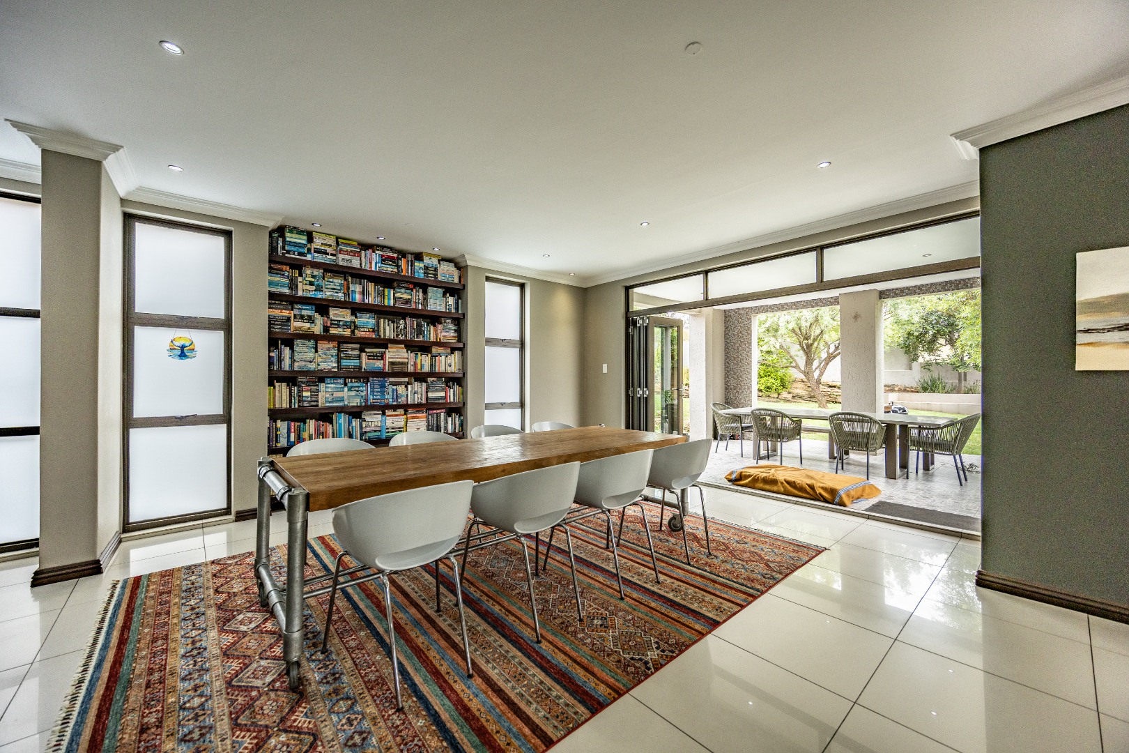 The heart of the home is the open-plan kitchen and dining area, complemented by a striking built-in bookshelf. The kitchen offers a walk-in pantry and separate scullery, flowing effortlessly to the double garages, which provide direct access into the scullery and outside. Outdoors you’ll find domestic quarters with a bathroom, a laundry positioned between the room and bathroom, and an additional storeroom. The covered patio with quality tiling leads onto a landscaped garden with irrigation, while the entertainment area with built-in braai opens onto the pool and wooden deck, making it perfect for hosting.