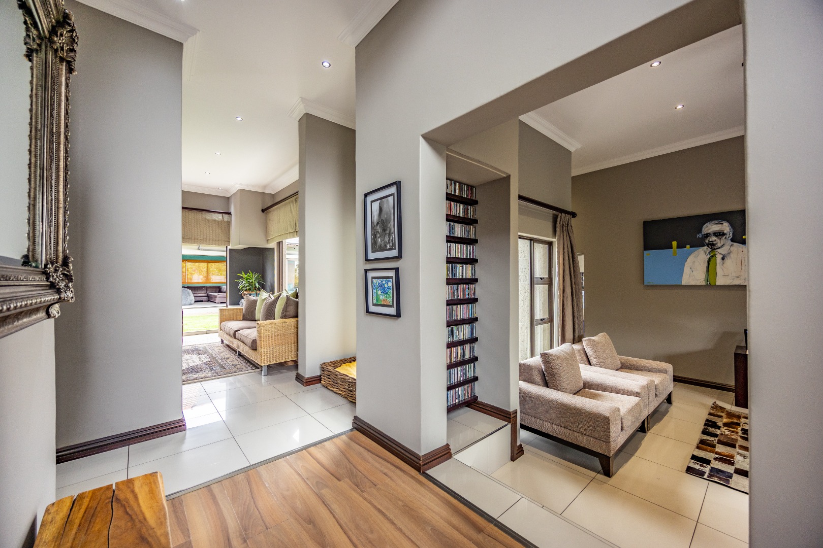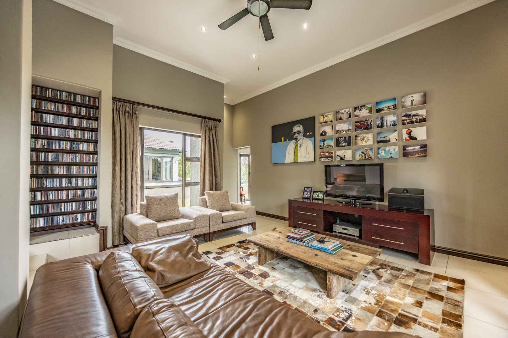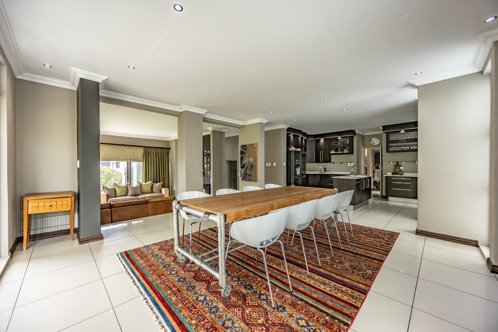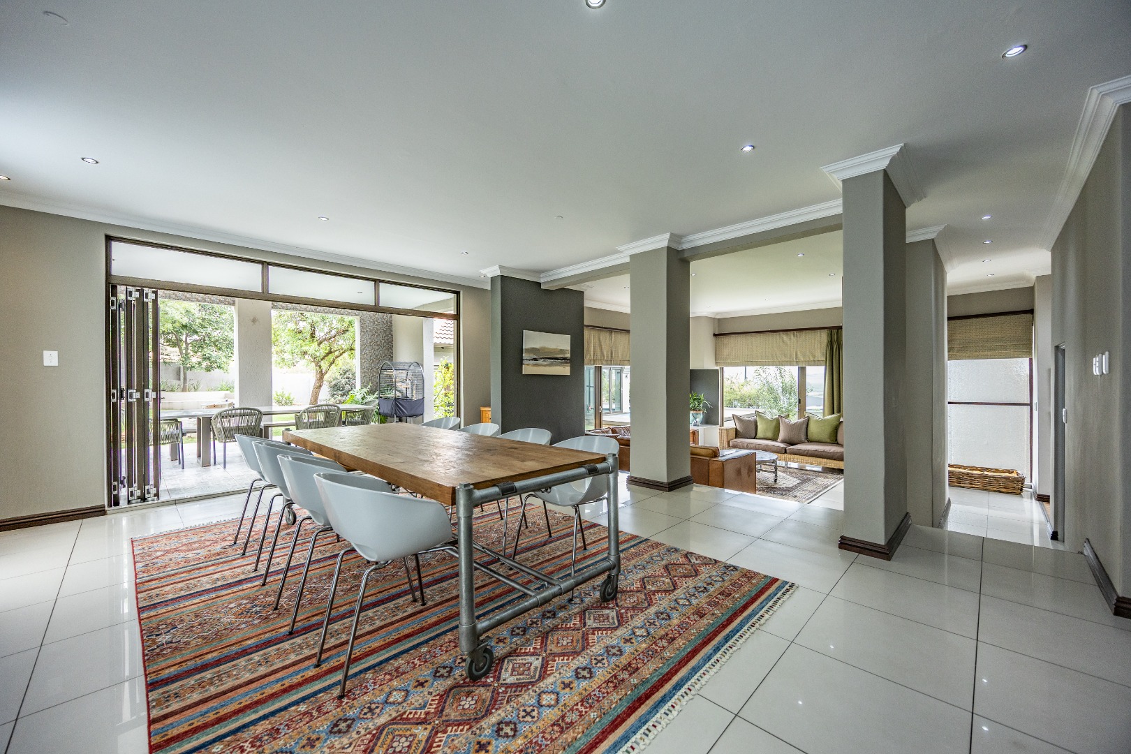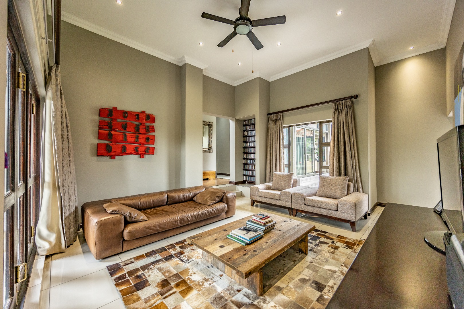 The heart of the home is the open-plan kitchen and dining area, complemented by a striking built-in bookshelf. The kitchen offers a walk-in pantry and separate scullery, flowing effortlessly to the double garages, which provide direct access into the scullery and outside. Outdoors you’ll find domestic quarters with a bathroom, a laundry positioned between the room and bathroom, and an additional storeroom. The covered patio with quality tiling leads onto a landscaped garden with irrigation, while the entertainment area with built-in braai opens onto the pool and wooden deck, making it perfect for hosting.