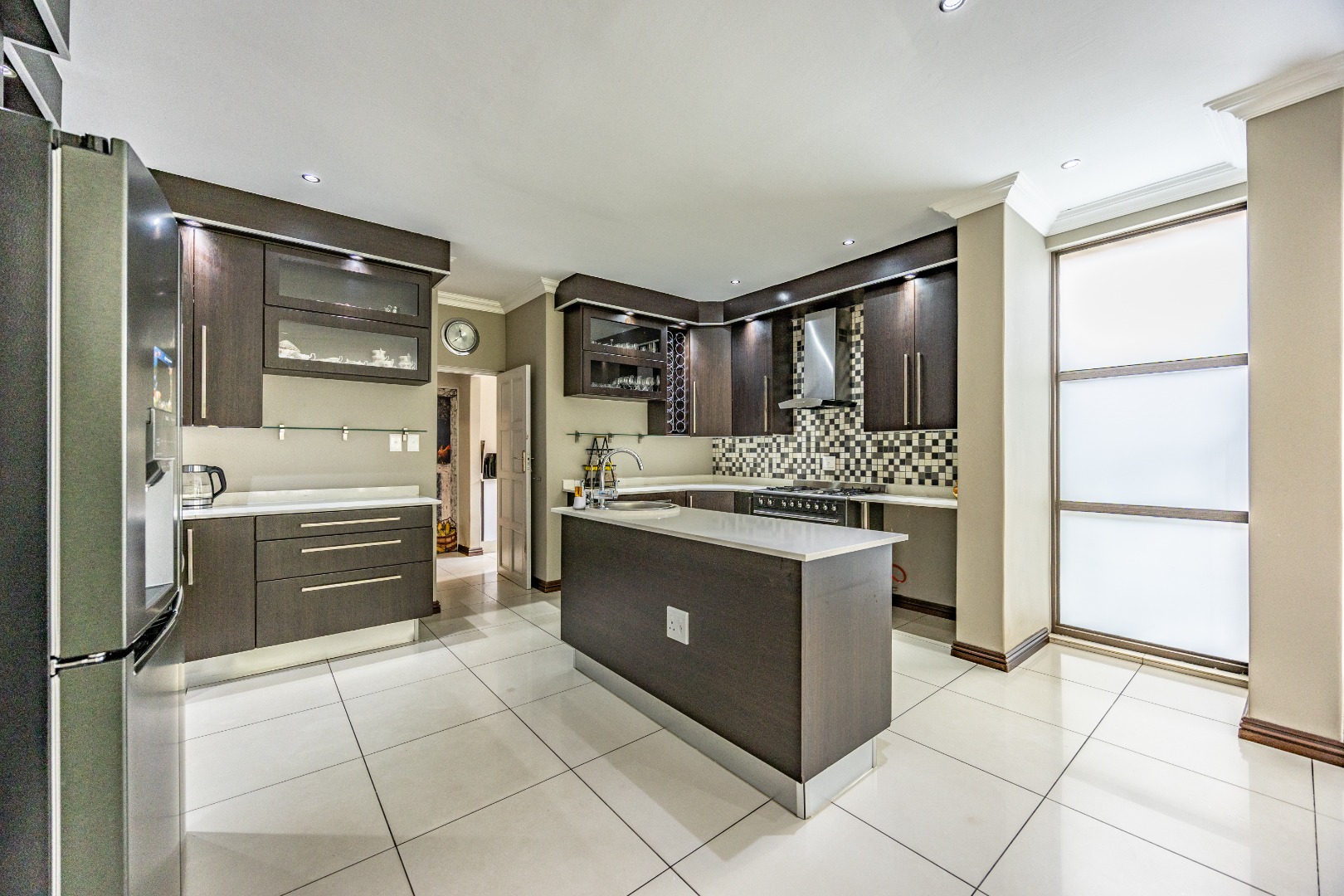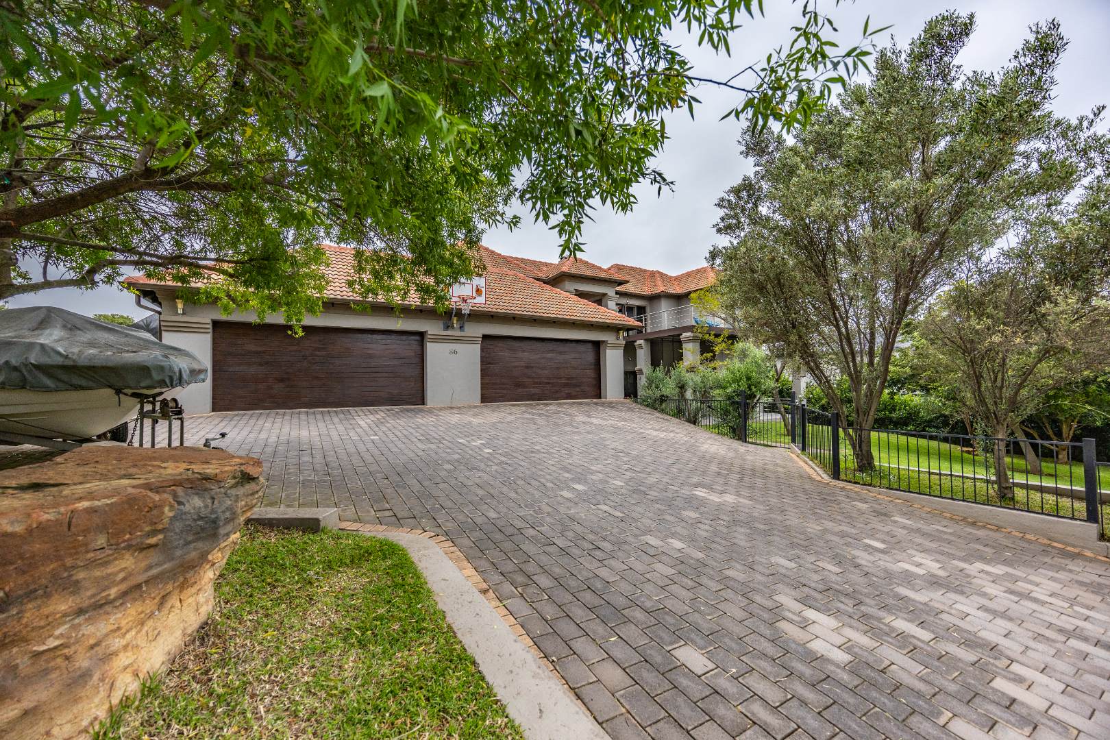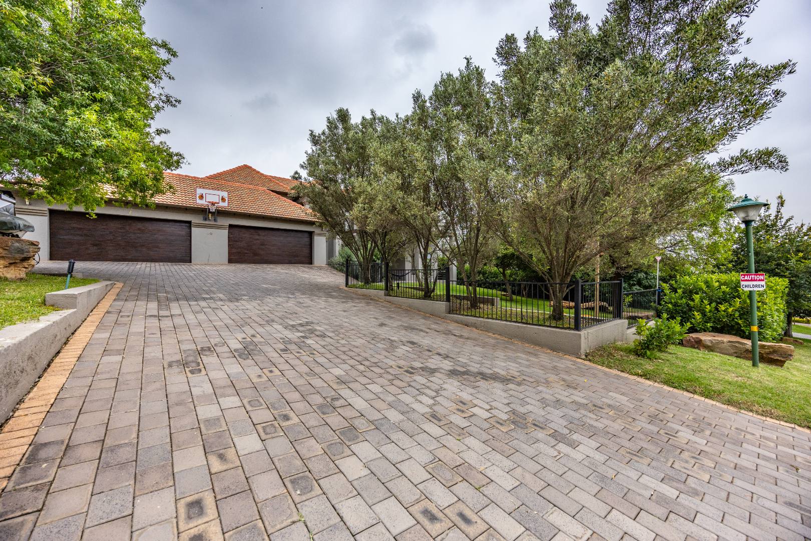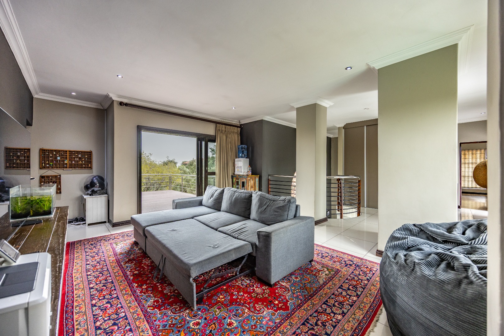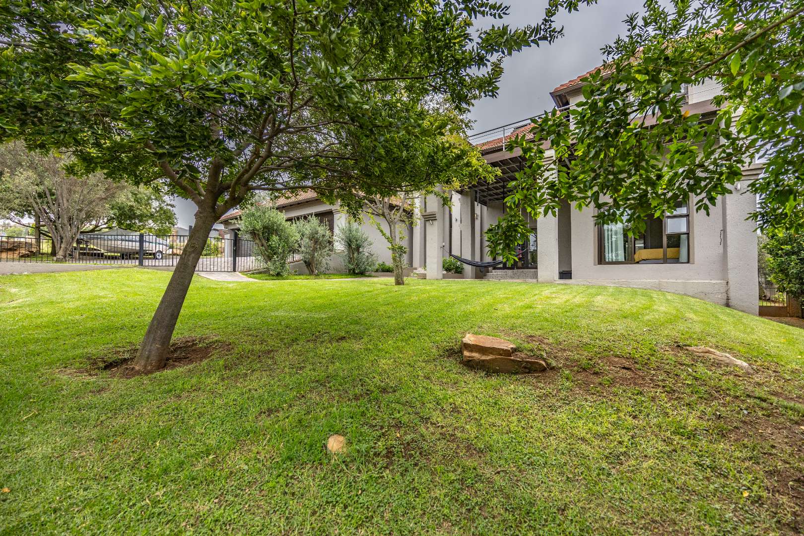 The heart of the home is the open-plan kitchen and dining area, complemented by a striking built-in bookshelf. The kitchen offers a walk-in pantry and separate scullery, flowing effortlessly to the double garages, which provide direct access into the scullery and outside. Outdoors you’ll find domestic quarters with a bathroom, a laundry positioned between the room and bathroom, and an additional storeroom. The covered patio with quality tiling leads onto a landscaped garden with irrigation, while the entertainment area with built-in braai opens onto the pool and wooden deck, making it perfect for hosting.
