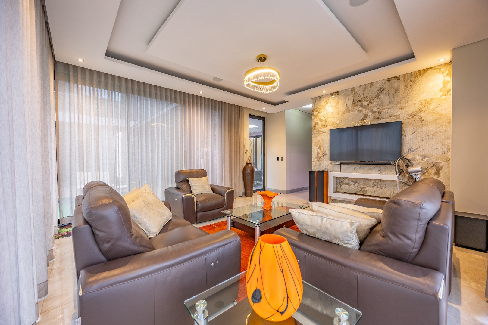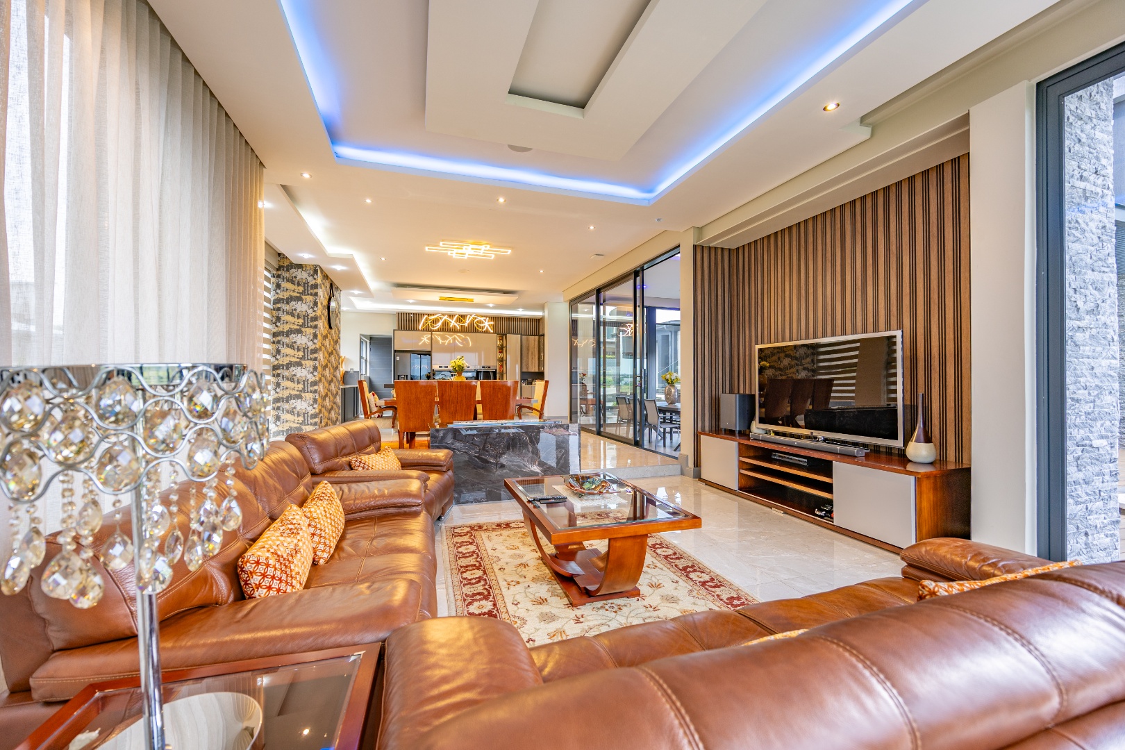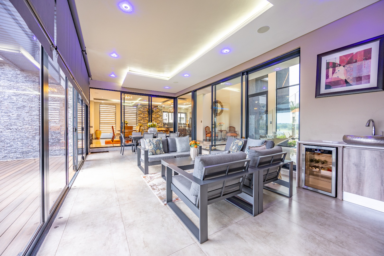 Adjacent to the dining area, the first living room exudes warmth provided by the elegant fireplace and style, with plush seating and contemporary decor that invites relaxation. Large stack doors open up to the undercover entertainment area, a true highlight of the home. This space features easy access to a sparkling infinity pool surrounded by wooden decking and stylish outdoor seating, perfect for soaking up the South African sun while enjoying seamless indoor-outdoor living.