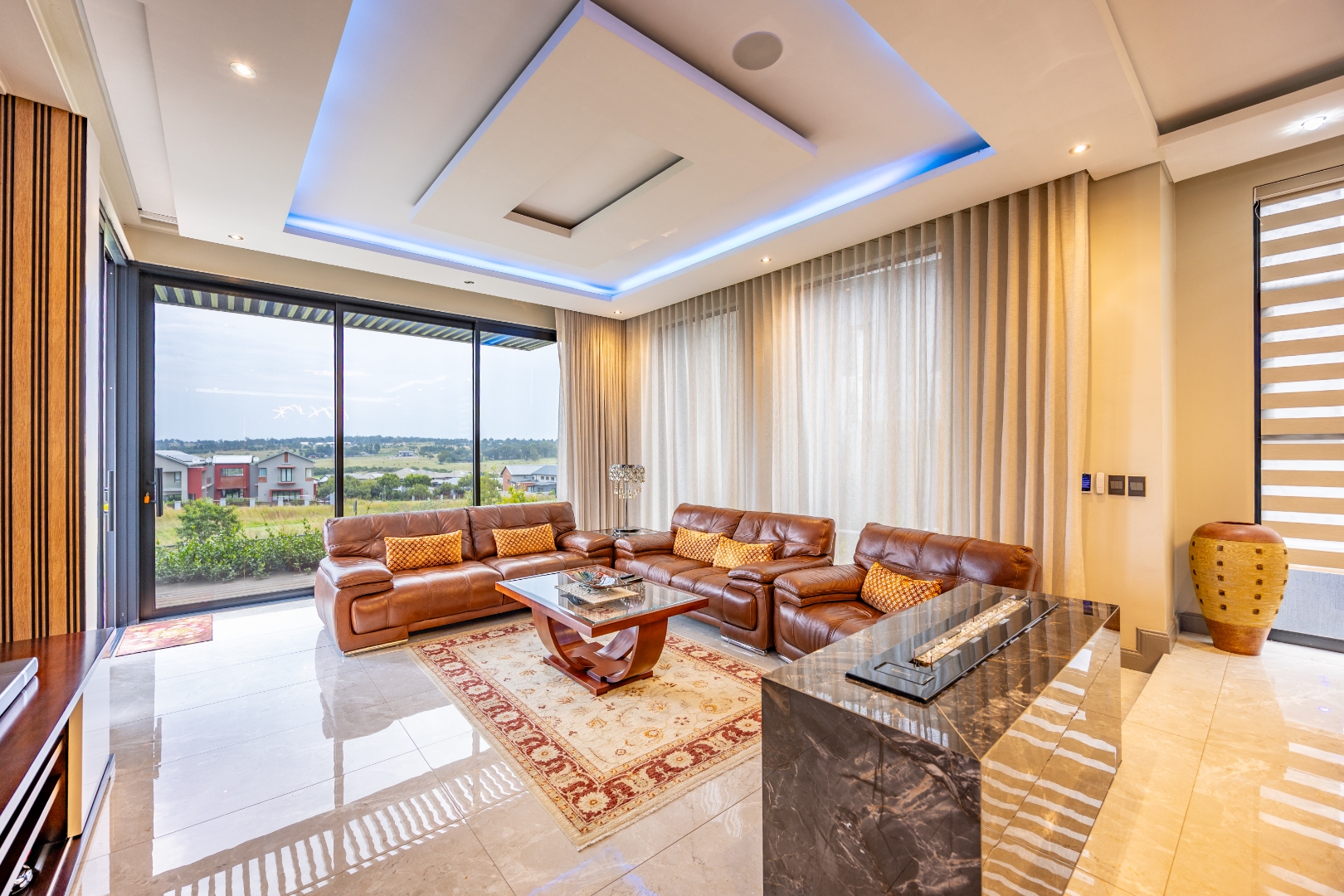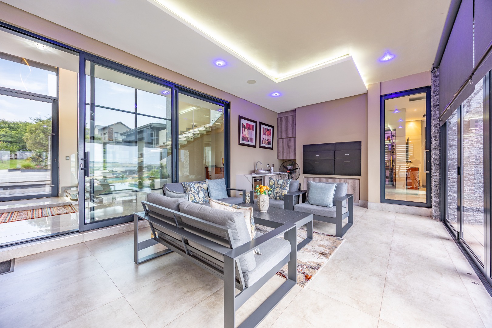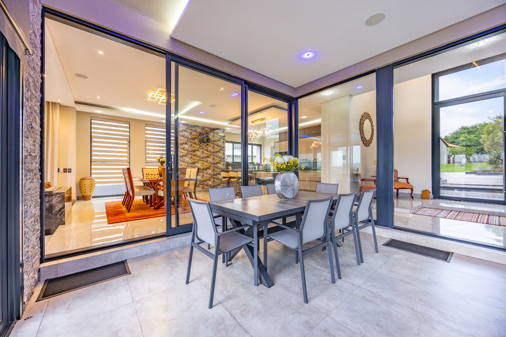 Adjacent to the dining area, the first living room exudes warmth provided by the elegant fireplace and style, with plush seating and contemporary decor that invites relaxation. Large stack doors open up to the undercover entertainment area, a true highlight of the home. This space features easy access to a sparkling infinity pool surrounded by wooden decking and stylish outdoor seating, perfect for soaking up the South African sun while enjoying seamless indoor-outdoor living.