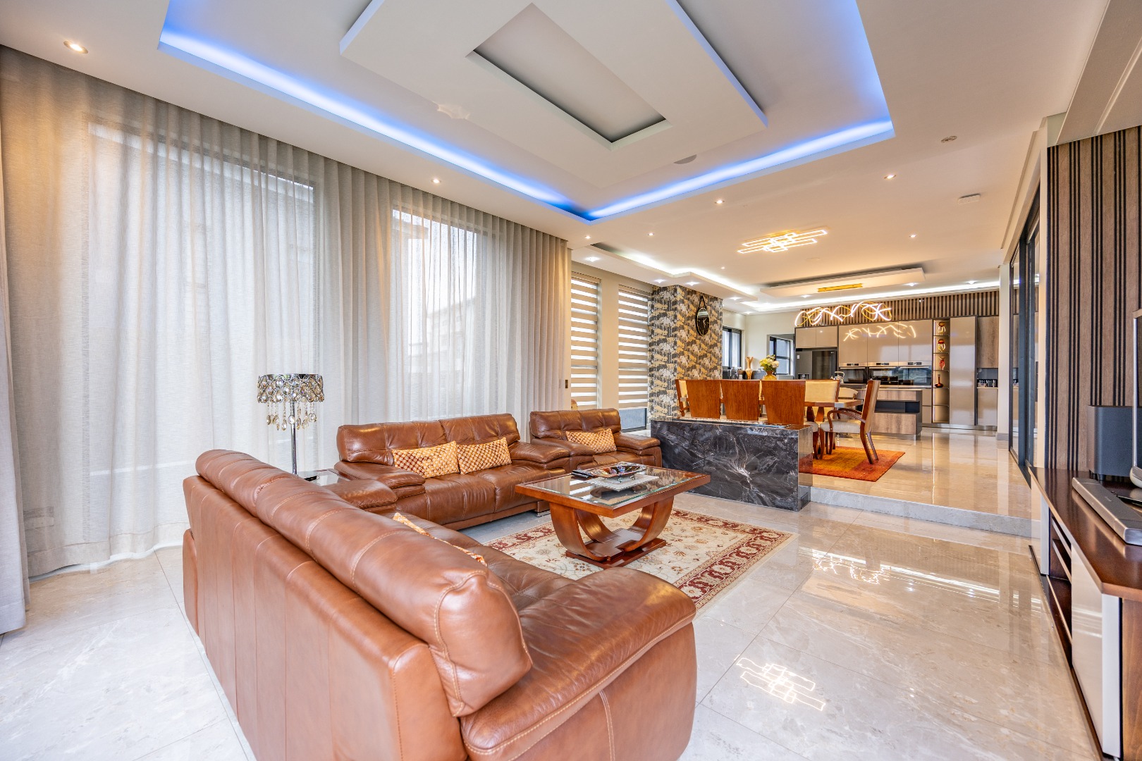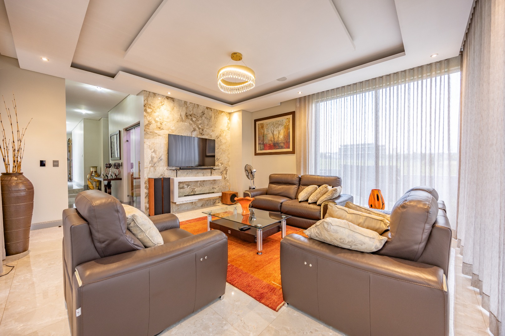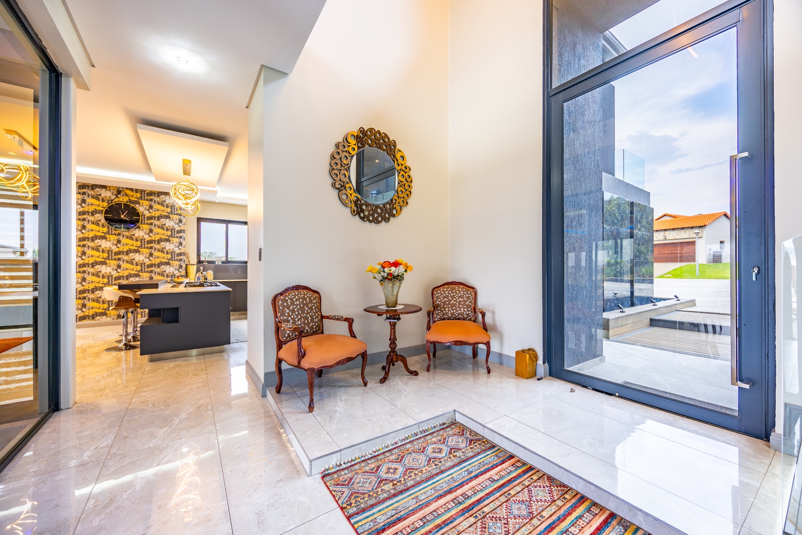 This home is also equipped with a 16kVA solar system, including 4 batteries, 16 panels, and a solar-powered geyser, ensuring energy efficiency and sustainability. Additional features include staff quarters with a separate bathroom, two double automated garages, a guest toilet conveniently located near the entrance, and high-end finishes throughout, such as marble flooring, modern lighting fixtures, and elegant rugs that add a touch of timeless charm.