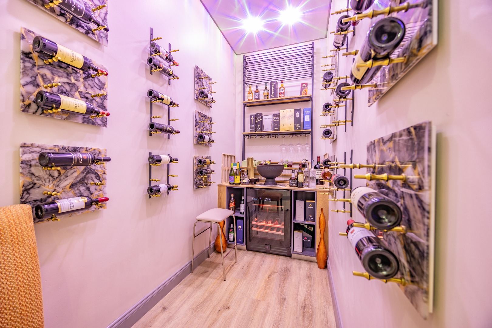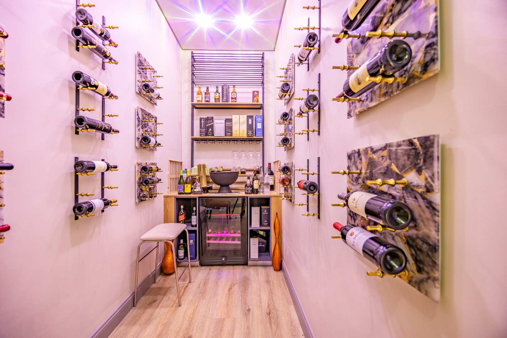For those who appreciate the finer things, the dedicated wine cellar is a standout feature. With modern shelving, ambient lighting, and a curated selection of bottles on display, it’s the perfect spot to store and showcase your collection. The second living area offers a cozy retreat with another gas fireplace, creating a warm ambiance for family evenings or quiet nights in. The downstairs area also boasts 1 bedroom that comes en-suite with a shower.