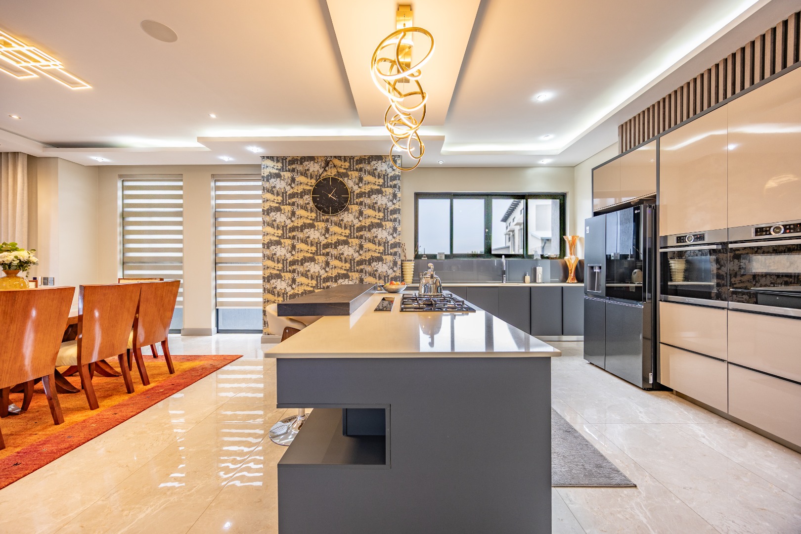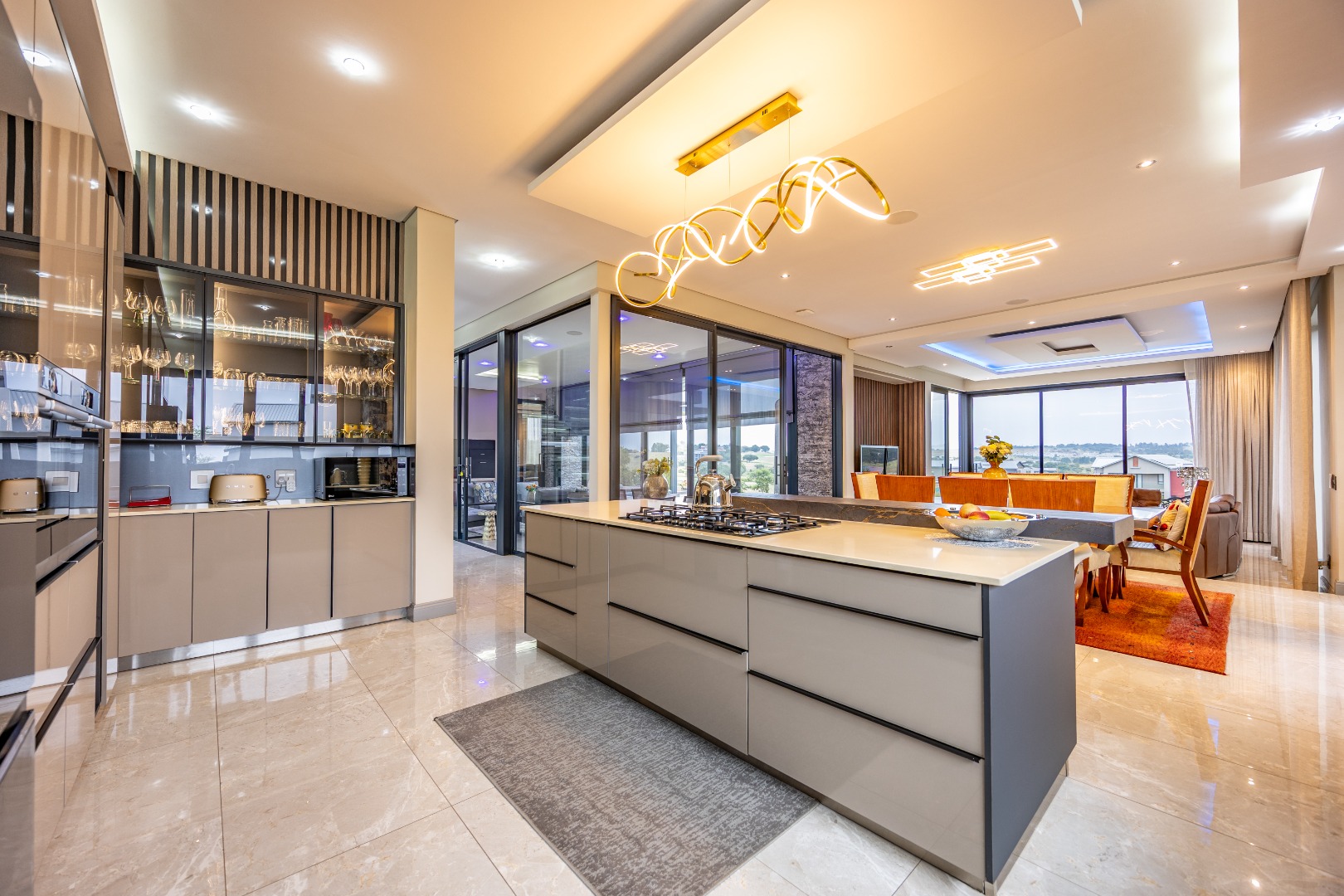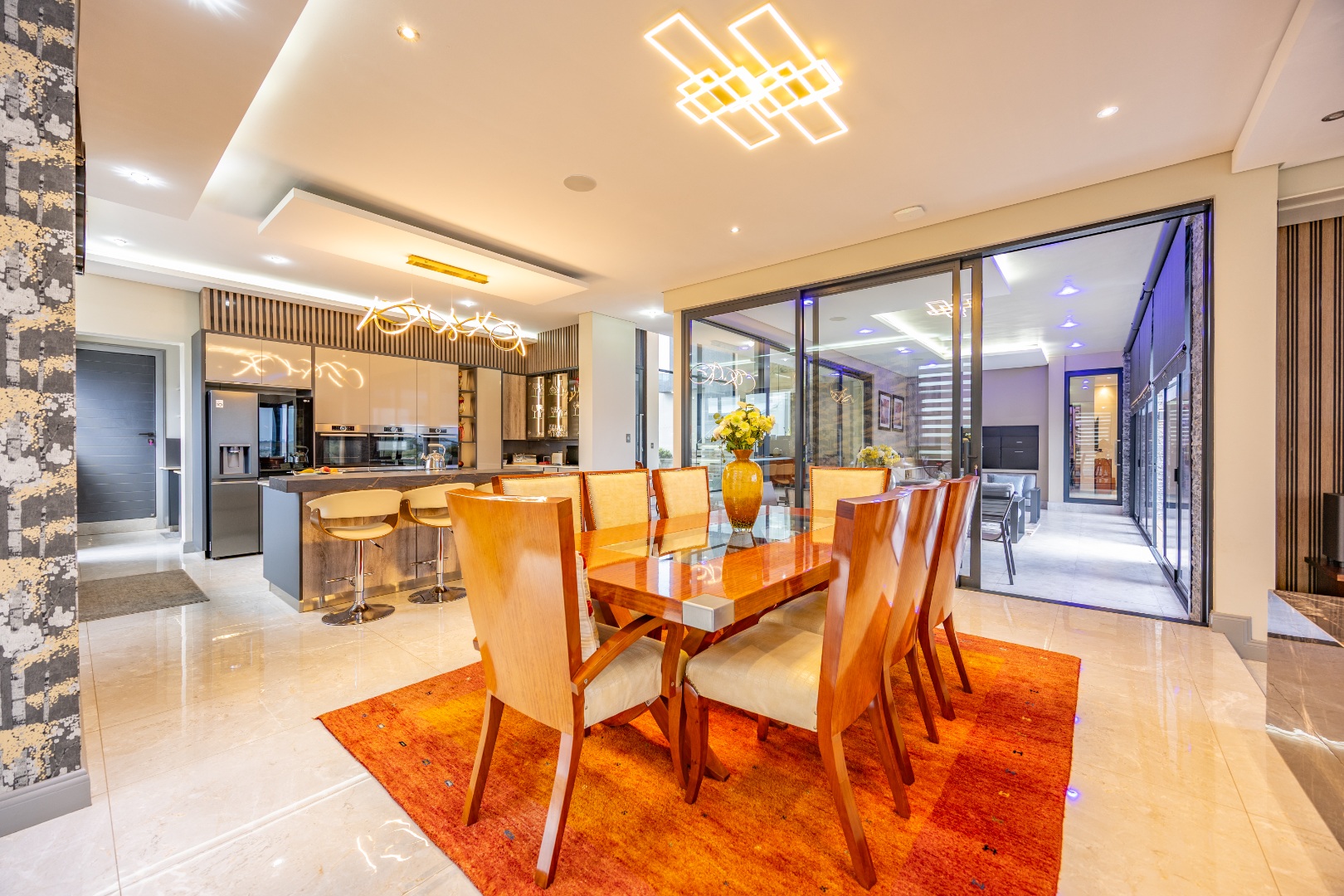 Step through the grand entrance hall and be welcomed into a world of elegance. Our journey begins with the gourmet kitchen, a chef’s dream featuring built-in appliances, a scullery, and ample storage space—perfect for culinary enthusiasts. Flowing seamlessly from the kitchen is the spacious dining area, where a sleek wooden table sits beneath a striking modern lighting, ideal for hosting intimate dinners or lively gatherings with panoramic views of the estate through large glass windows.