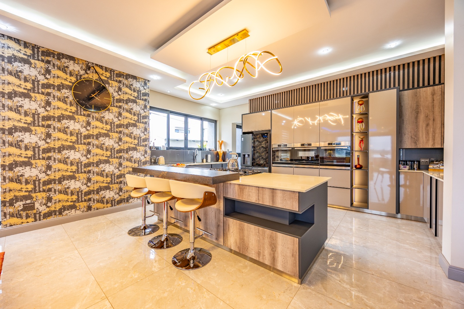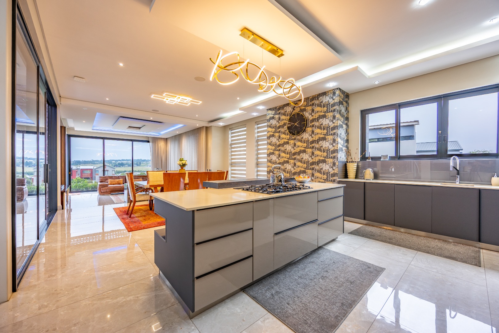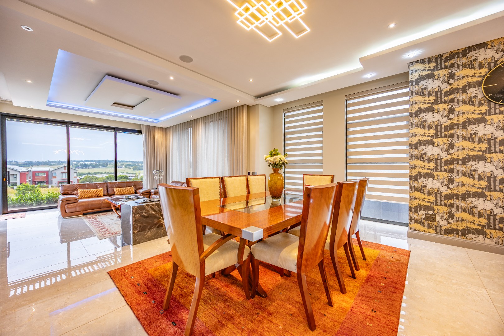 Step through the grand entrance hall and be welcomed into a world of elegance. Our journey begins with the gourmet kitchen, a chef’s dream featuring built-in appliances, a scullery, and ample storage space—perfect for culinary enthusiasts. Flowing seamlessly from the kitchen is the spacious dining area, where a sleek wooden table sits beneath a striking modern lighting, ideal for hosting intimate dinners or lively gatherings with panoramic views of the estate through large glass windows.