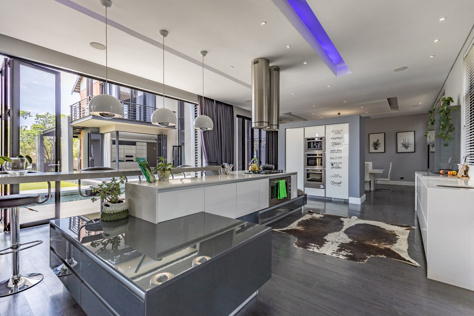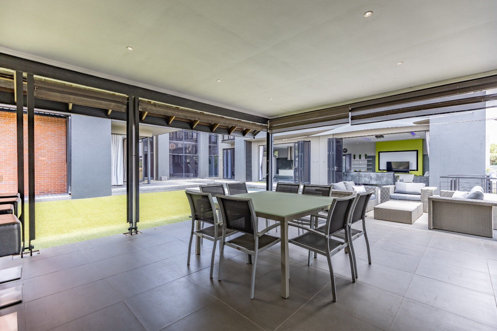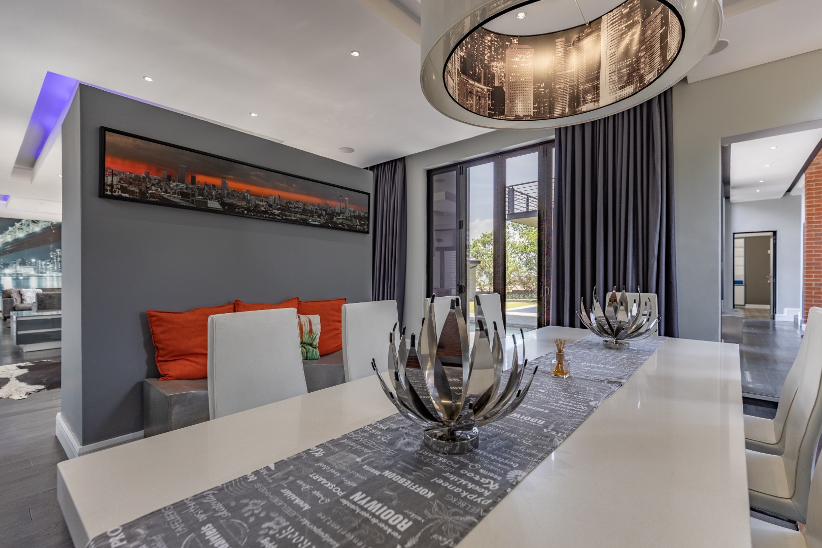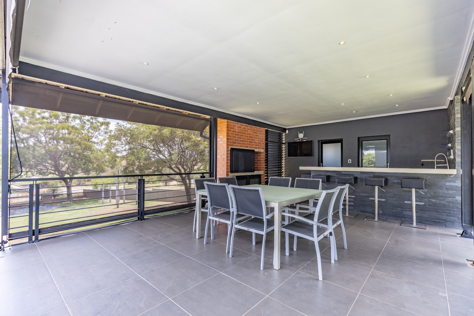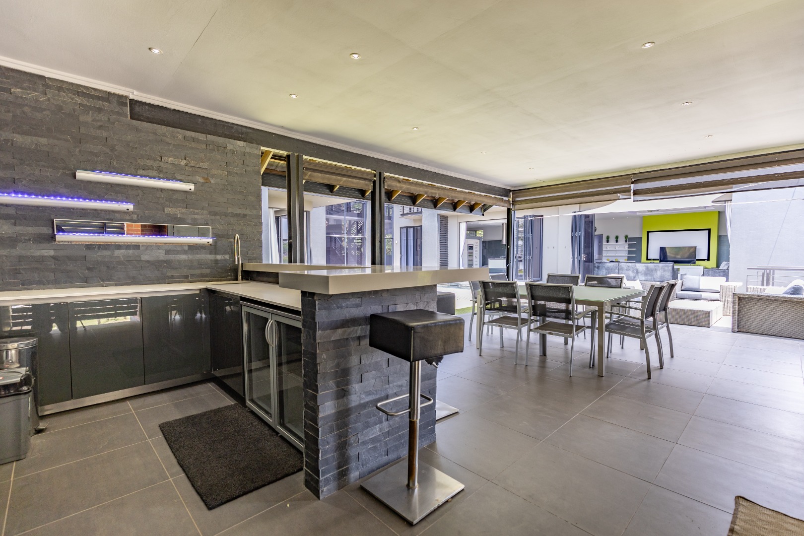 The home’s grand entrance, featuring a fitted server, sets the tone for its sophisticated interior, showcasing meticulous craftsmanship and attention to detail. The kitchen, fitted with Eurotrend-built cupboards and built-in fridge/freezers, flows seamlessly into a living room equipped with a projector and screen, complete with a TV stand and table included in the sale. A 10-seater dining area, complemented by tailor-made curtains, creates an elegant space for gatherings. The residence boasts two spacious living rooms, a cozy pyjama lounge, underfloor heating in dining areas, fireplaces for added warmth, and air-conditioned bedrooms, all enhanced by wall-to-wall carpets for comfort. A beam-built vacuum system adds convenience, while practical amenities include a staff quarter with a kitchenette, 2.5 garages, a storeroom, and a laundry chute. The home’s sustainability features extend to an evacuate tube solar geyser and a heat pump, with a comprehensive security camera system providing peace of mind. Outside, entertaining is elevated with a well-appointed bar, a sauna, a toilet, and a gas braai, creating an inviting space for guests.