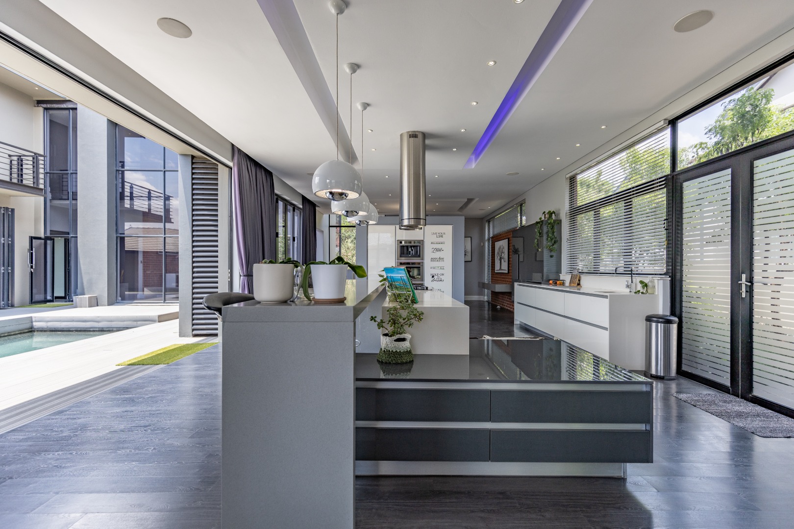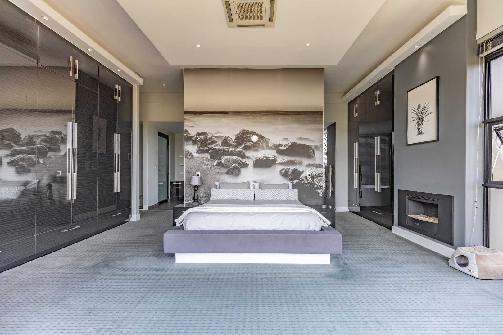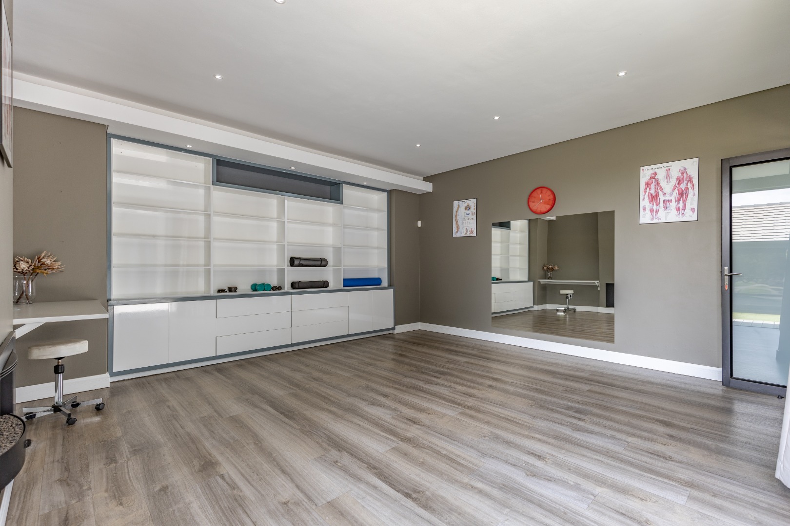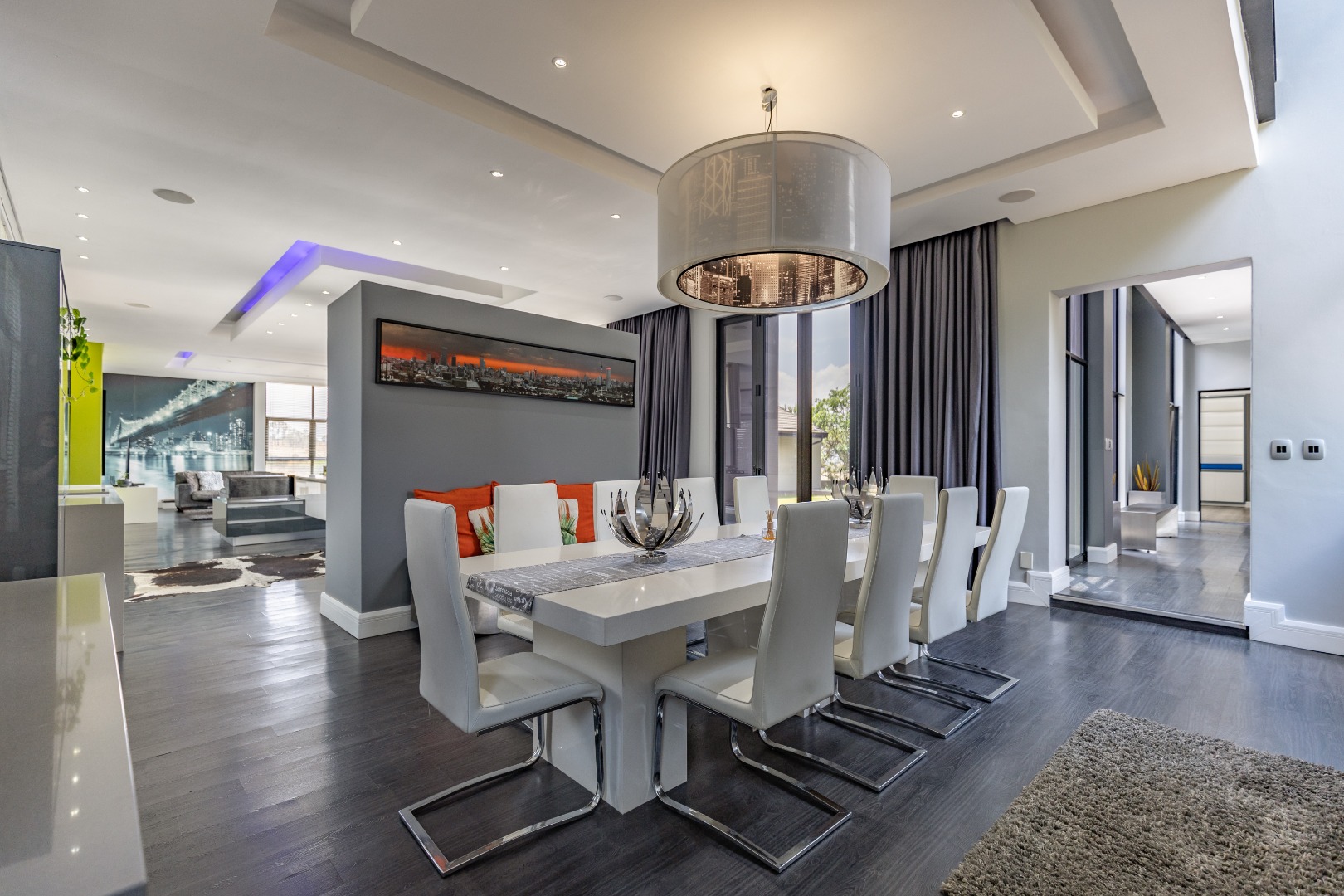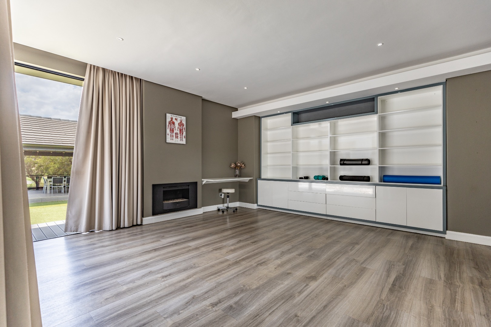 The home’s grand entrance, featuring a fitted server, sets the tone for its sophisticated interior, showcasing meticulous craftsmanship and attention to detail. The kitchen, fitted with Eurotrend-built cupboards and built-in fridge/freezers, flows seamlessly into a living room equipped with a projector and screen, complete with a TV stand and table included in the sale. A 10-seater dining area, complemented by tailor-made curtains, creates an elegant space for gatherings. The residence boasts two spacious living rooms, a cozy pyjama lounge, underfloor heating in dining areas, fireplaces for added warmth, and air-conditioned bedrooms, all enhanced by wall-to-wall carpets for comfort. A beam-built vacuum system adds convenience, while practical amenities include a staff quarter with a kitchenette, 2.5 garages, a storeroom, and a laundry chute. The home’s sustainability features extend to an evacuate tube solar geyser and a heat pump, with a comprehensive security camera system providing peace of mind. Outside, entertaining is elevated with a well-appointed bar, a sauna, a toilet, and a gas braai, creating an inviting space for guests.