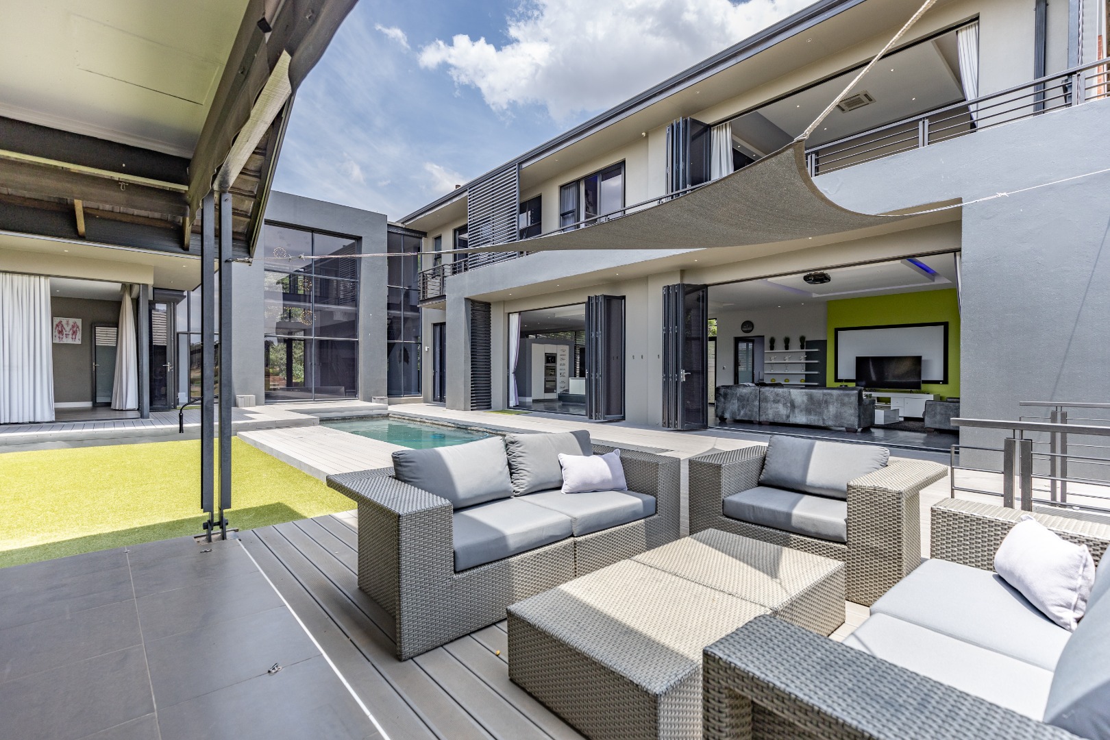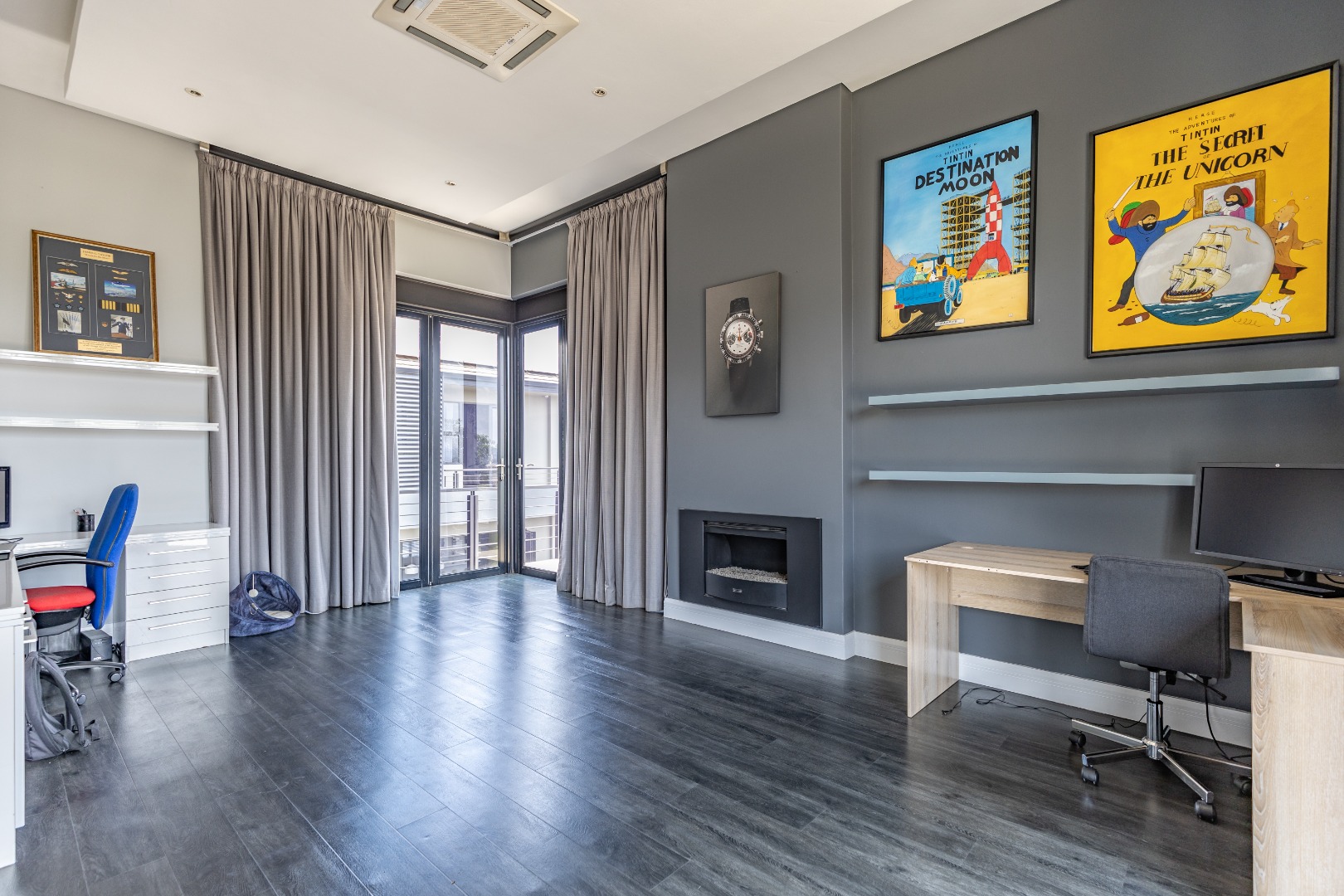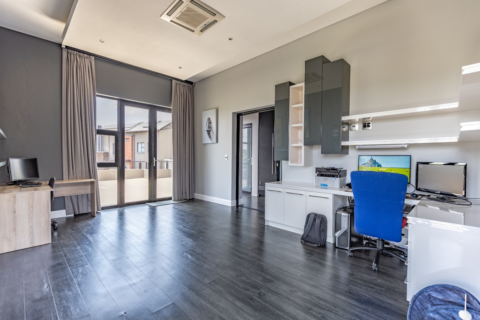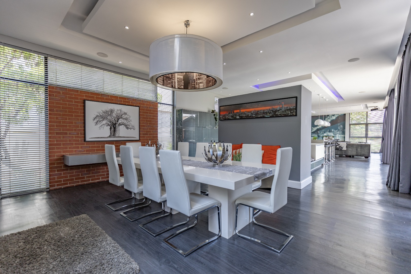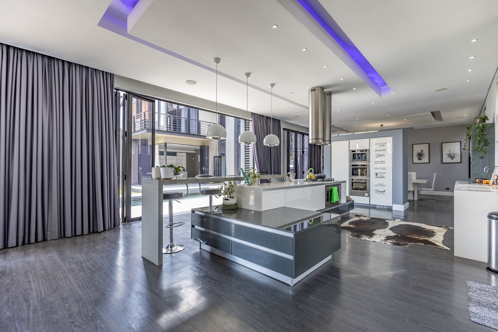 The home’s grand entrance, featuring a fitted server, sets the tone for its sophisticated interior, showcasing meticulous craftsmanship and attention to detail. The kitchen, fitted with Eurotrend-built cupboards and built-in fridge/freezers, flows seamlessly into a living room equipped with a projector and screen, complete with a TV stand and table included in the sale. A 10-seater dining area, complemented by tailor-made curtains, creates an elegant space for gatherings. The residence boasts two spacious living rooms, a cozy pyjama lounge, underfloor heating in dining areas, fireplaces for added warmth, and air-conditioned bedrooms, all enhanced by wall-to-wall carpets for comfort. A beam-built vacuum system adds convenience, while practical amenities include a staff quarter with a kitchenette, 2.5 garages, a storeroom, and a laundry chute. The home’s sustainability features extend to an evacuate tube solar geyser and a heat pump, with a comprehensive security camera system providing peace of mind. Outside, entertaining is elevated with a well-appointed bar, a sauna, a toilet, and a gas braai, creating an inviting space for guests.