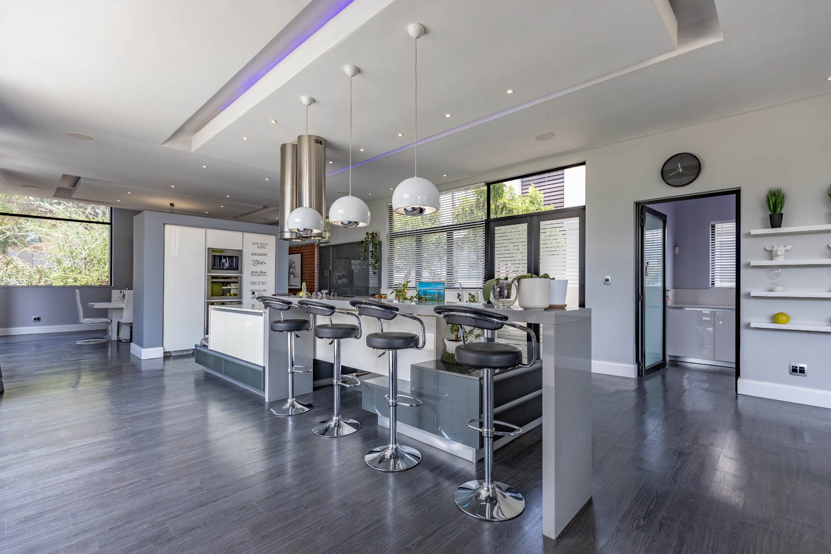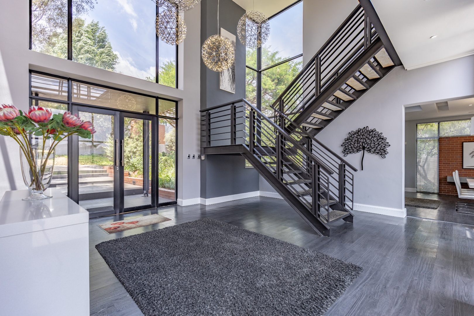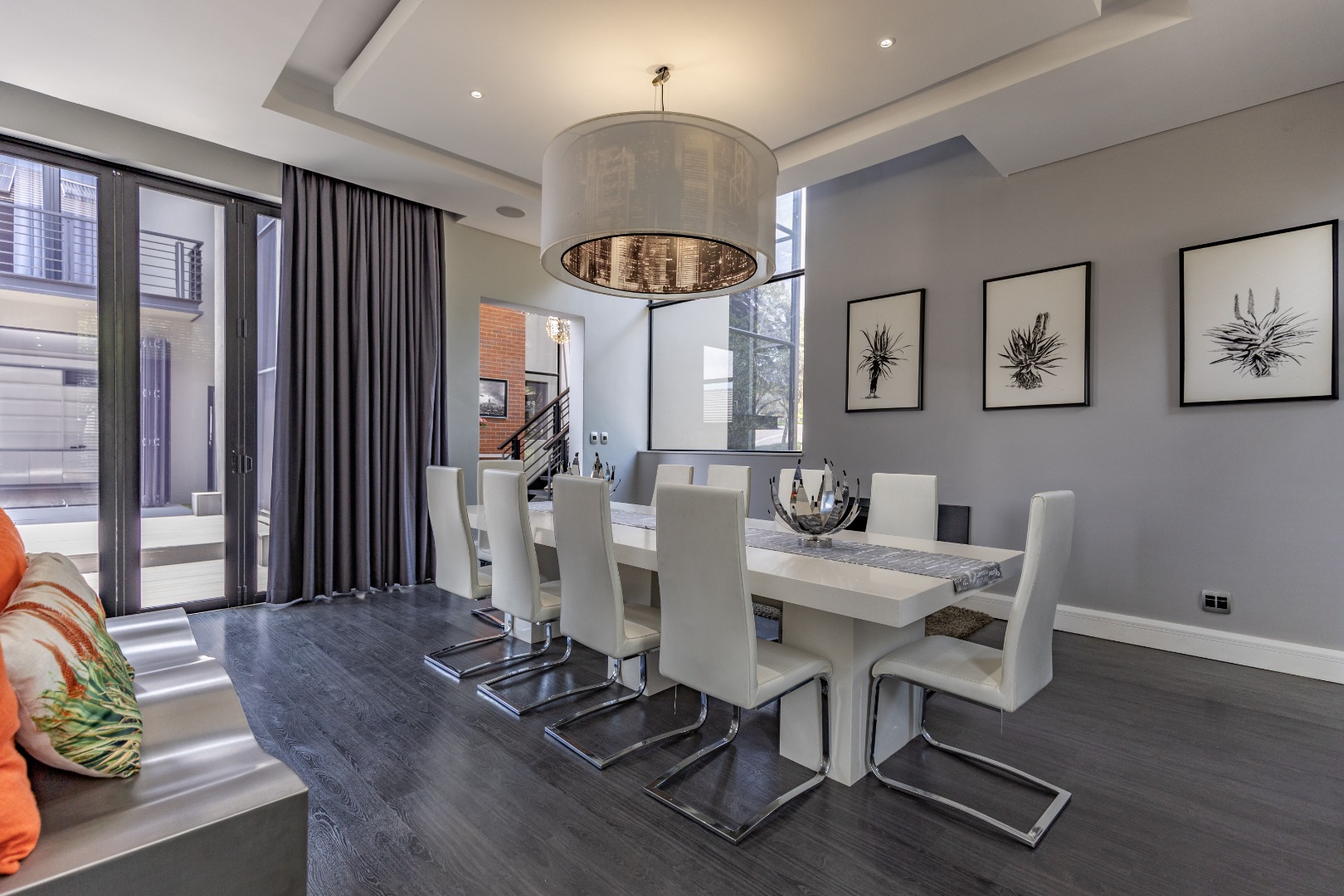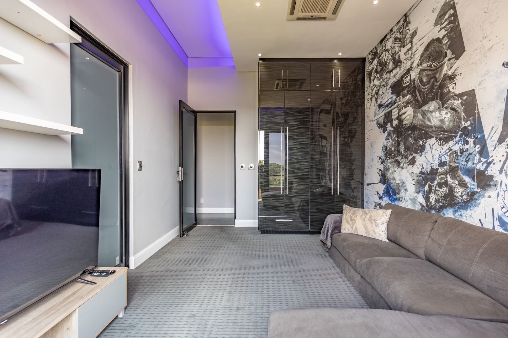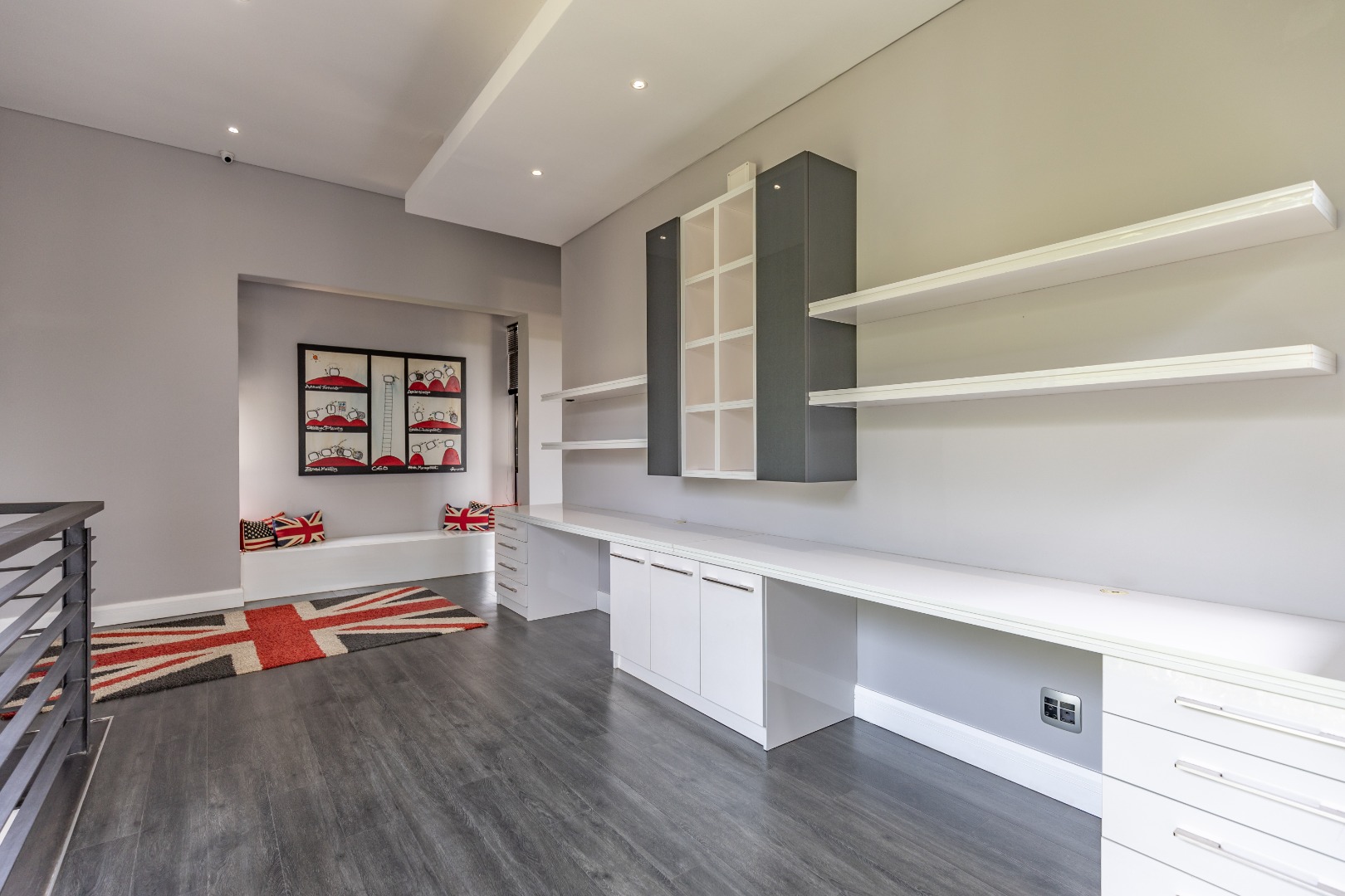 The home’s grand entrance, featuring a fitted server, sets the tone for its sophisticated interior, showcasing meticulous craftsmanship and attention to detail. The kitchen, fitted with Eurotrend-built cupboards and built-in fridge/freezers, flows seamlessly into a living room equipped with a projector and screen, complete with a TV stand and table included in the sale. A 10-seater dining area, complemented by tailor-made curtains, creates an elegant space for gatherings. The residence boasts two spacious living rooms, a cozy pyjama lounge, underfloor heating in dining areas, fireplaces for added warmth, and air-conditioned bedrooms, all enhanced by wall-to-wall carpets for comfort. A beam-built vacuum system adds convenience, while practical amenities include a staff quarter with a kitchenette, 2.5 garages, a storeroom, and a laundry chute. The home’s sustainability features extend to an evacuate tube solar geyser and a heat pump, with a comprehensive security camera system providing peace of mind. Outside, entertaining is elevated with a well-appointed bar, a sauna, a toilet, and a gas braai, creating an inviting space for guests.