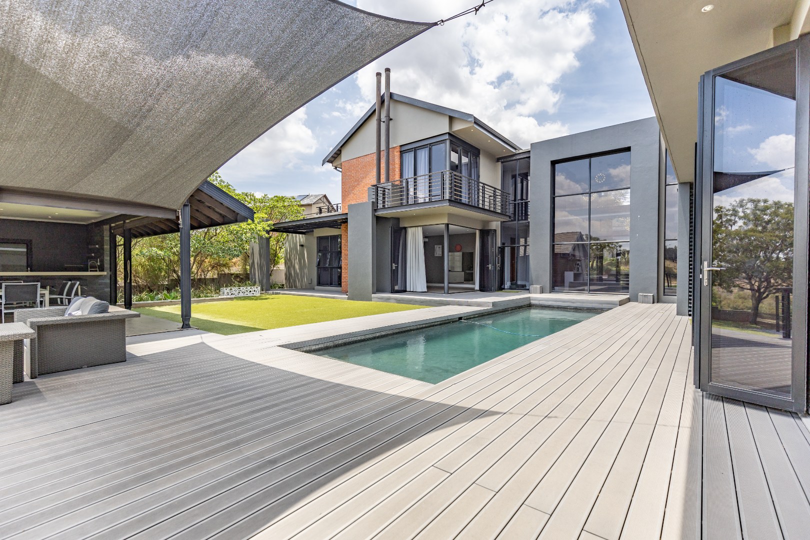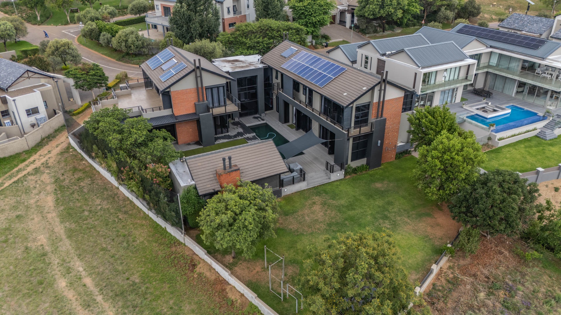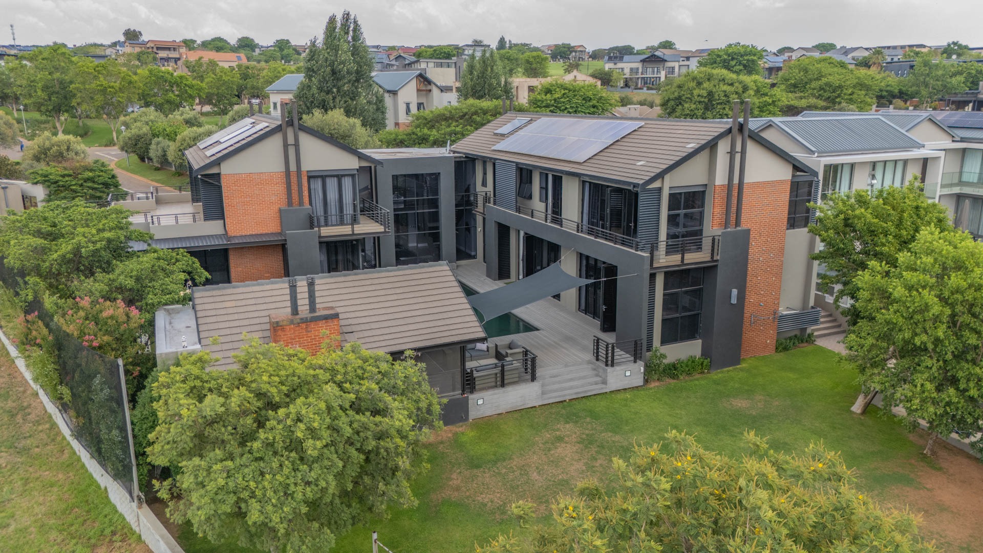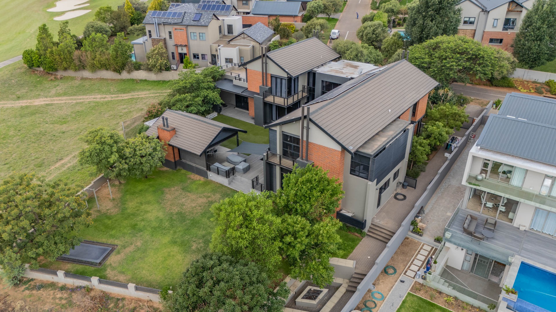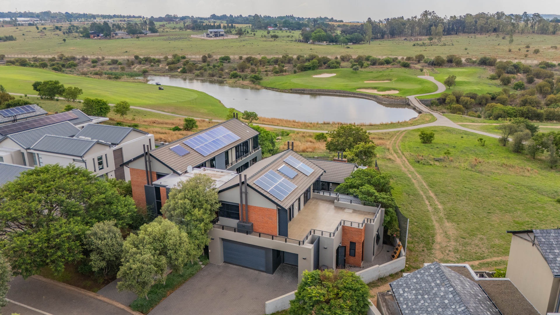 Nestled within the prestigious Copperleaf Golf Estate, a premier modern community of 1,165 homes just 20 minutes from Lanseria Airport and conveniently accessible via the N14 highway, this exceptional 4 or 5 bedroom residence masterfully combines luxury, sustainability, and a holiday-like lifestyle on South Africa’s only Els Club golf course. Perfect for family living and entertaining, the estate is surrounded by top-tier schools and thrives with recent westward expansion, fostering a vibrant, family-oriented environment. Set on expansive grassland plains, the championship golf course, designed by Ernie Els, features long holes, distinctive bunkering, wide fairways, multiple tee boxes, and superb greens, making it accessible to golfers of all skill levels while offering challenging bunkers, water hazards, and three short, risk-reward par 4s that have earned praise from professionals. This eco-conscious home is equipped with a 6KW grid-tied solar system, including 8KW solar panels, a 6KW inverter, and 24x 2V 2050mAh batteries, ensuring uninterrupted power during outages and keeping monthly electricity bills as low as R2000. A 70m borehole supplies a 2000L house tank and two 6000L irrigation tanks, with water purified through a 6-stage system and UV sterilization, completely eliminating council water bills, though occasional estimated charges are typically refunded the following month.