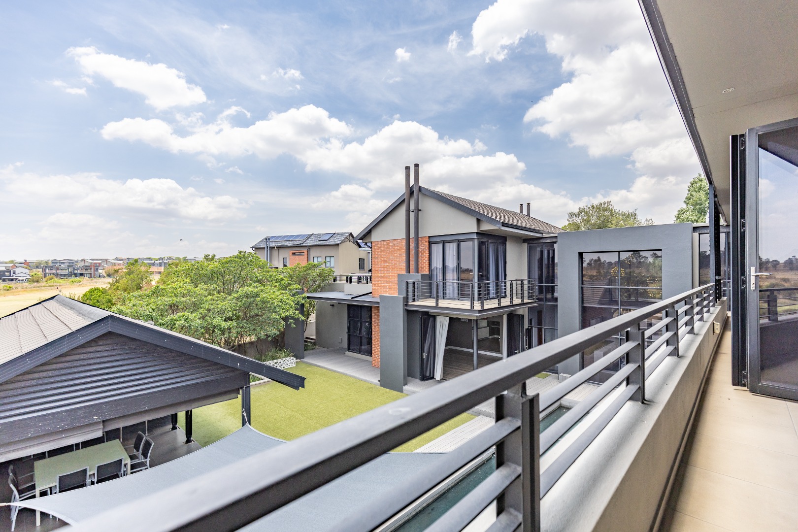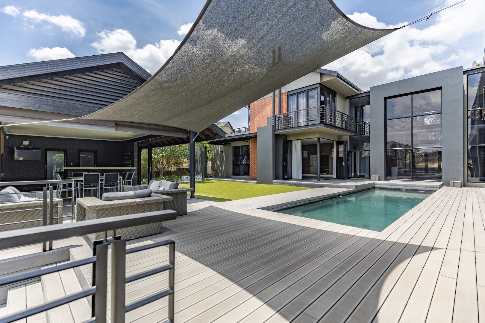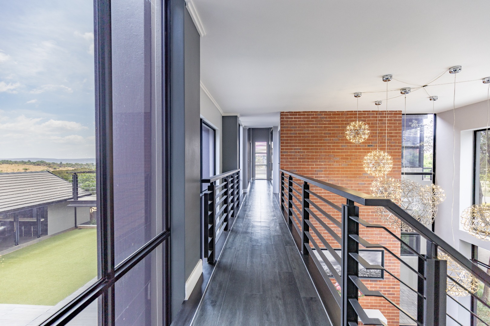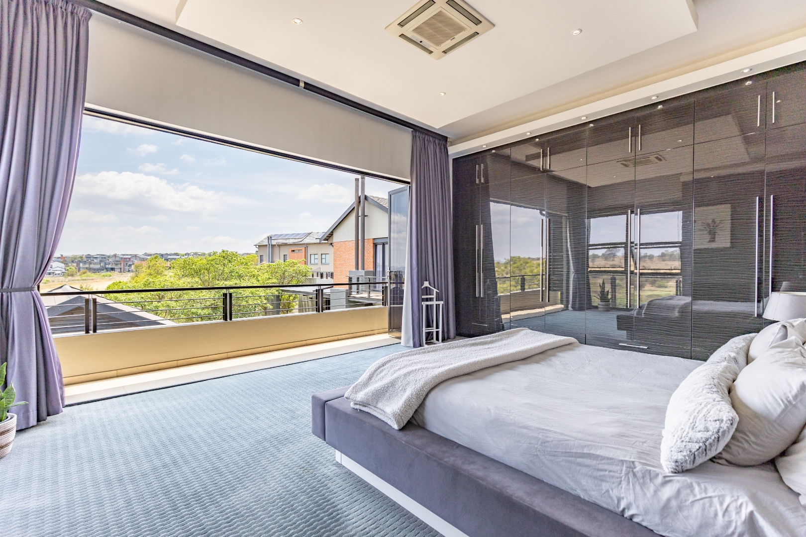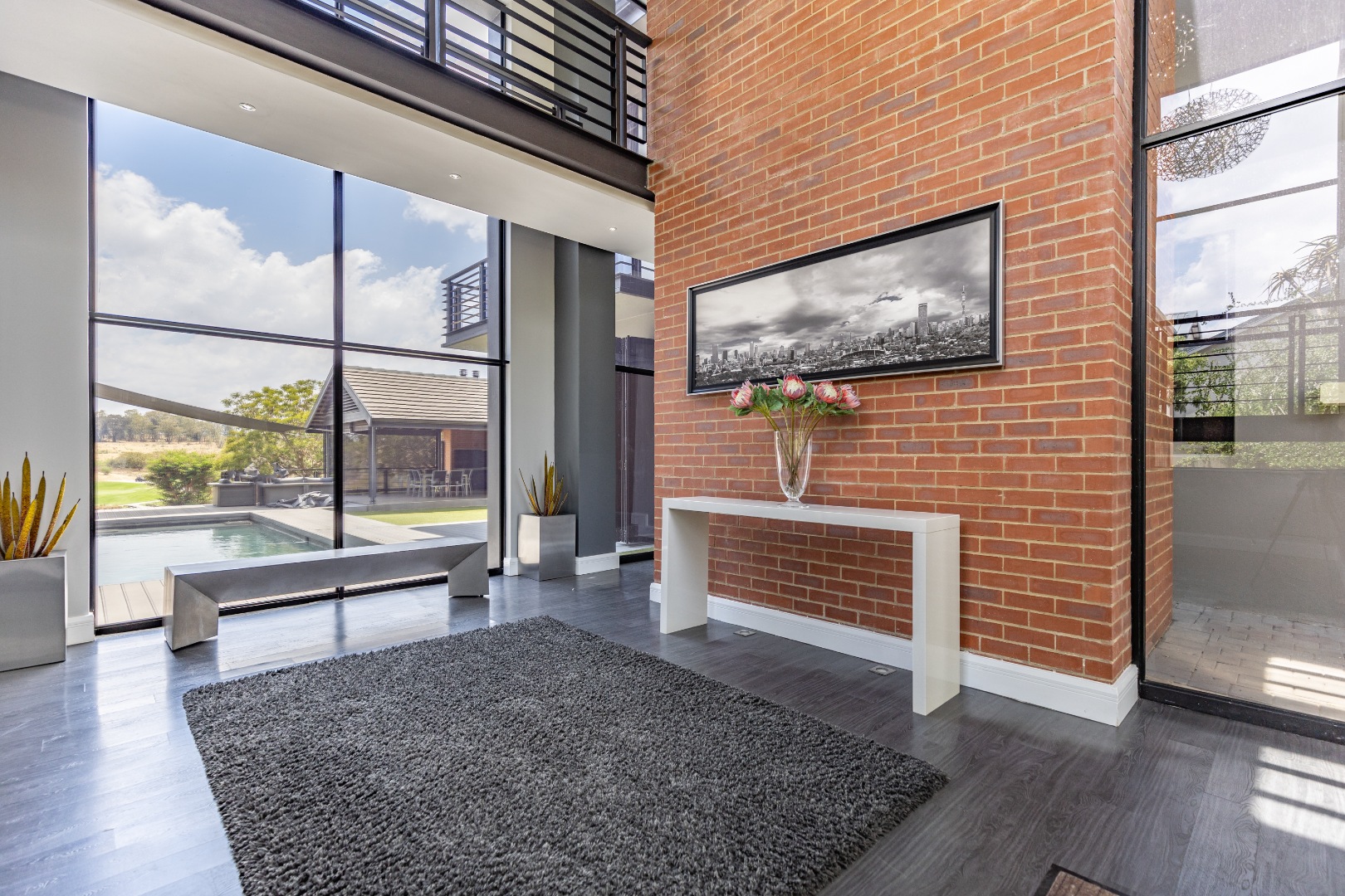 Nestled within the prestigious Copperleaf Golf Estate, a premier modern community of 1,165 homes just 20 minutes from Lanseria Airport and conveniently accessible via the N14 highway, this exceptional 4 or 5 bedroom residence masterfully combines luxury, sustainability, and a holiday-like lifestyle on South Africa’s only Els Club golf course. Perfect for family living and entertaining, the estate is surrounded by top-tier schools and thrives with recent westward expansion, fostering a vibrant, family-oriented environment. Set on expansive grassland plains, the championship golf course, designed by Ernie Els, features long holes, distinctive bunkering, wide fairways, multiple tee boxes, and superb greens, making it accessible to golfers of all skill levels while offering challenging bunkers, water hazards, and three short, risk-reward par 4s that have earned praise from professionals. This eco-conscious home is equipped with a 6KW grid-tied solar system, including 8KW solar panels, a 6KW inverter, and 24x 2V 2050mAh batteries, ensuring uninterrupted power during outages and keeping monthly electricity bills as low as R2000. A 70m borehole supplies a 2000L house tank and two 6000L irrigation tanks, with water purified through a 6-stage system and UV sterilization, completely eliminating council water bills, though occasional estimated charges are typically refunded the following month.
