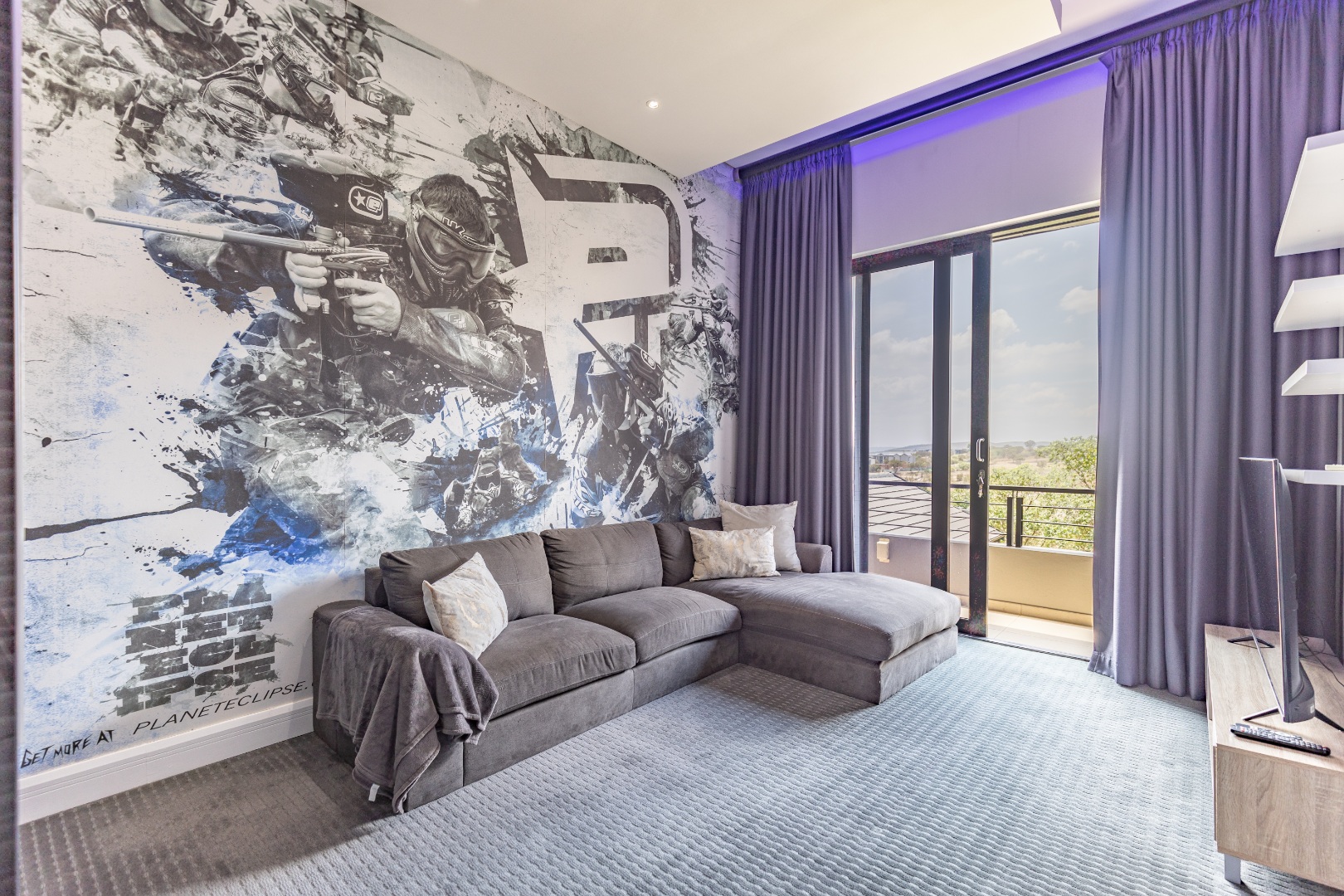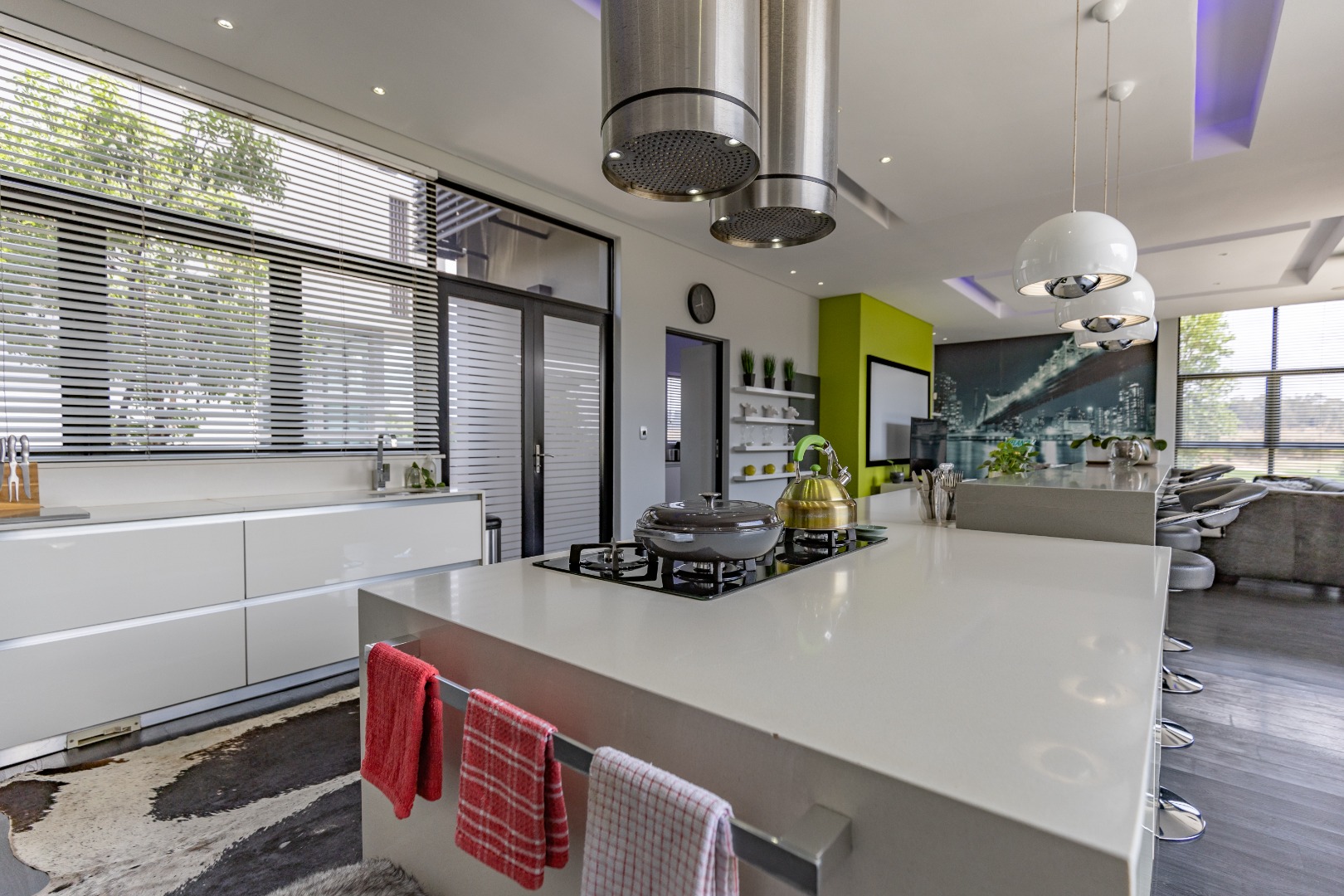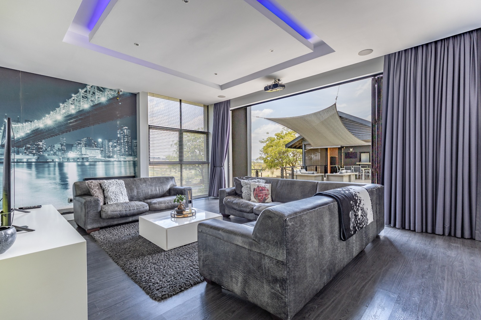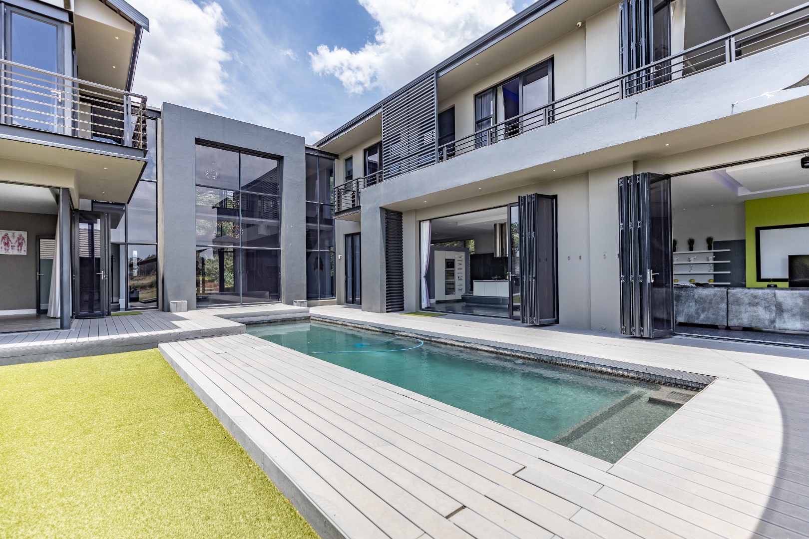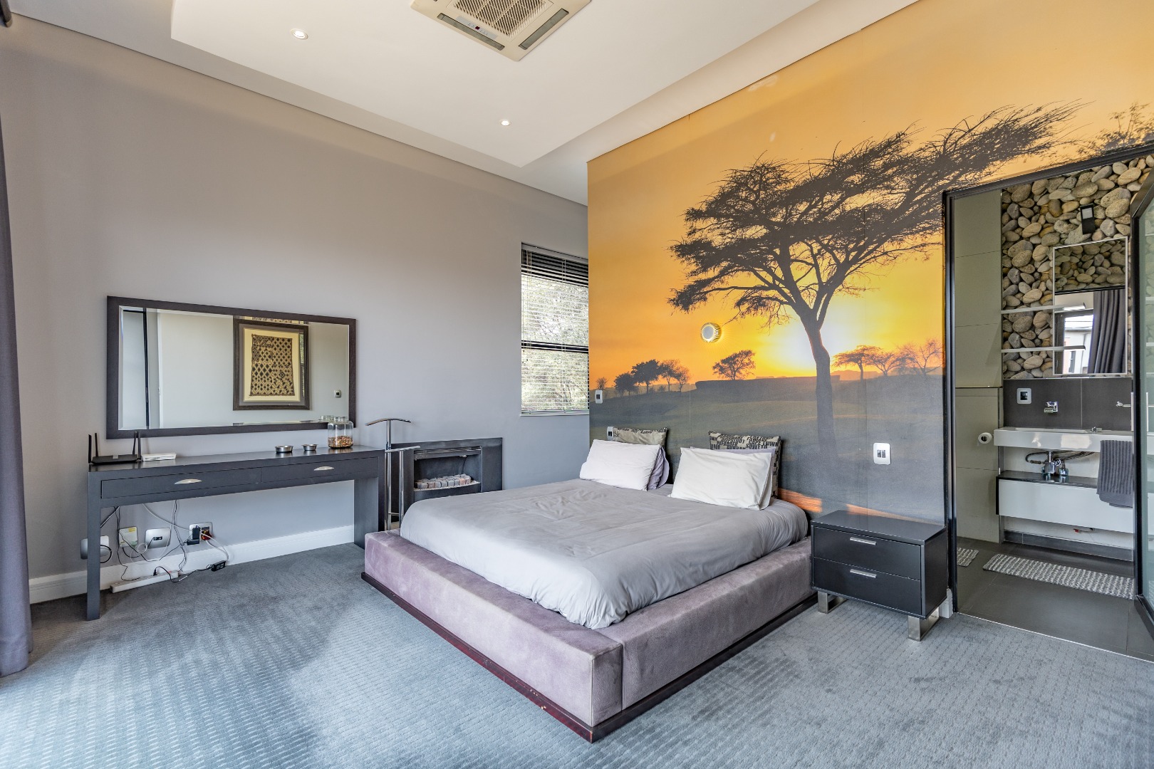 Nestled within the prestigious Copperleaf Golf Estate, a premier modern community of 1,165 homes just 20 minutes from Lanseria Airport and conveniently accessible via the N14 highway, this exceptional 4 or 5 bedroom residence masterfully combines luxury, sustainability, and a holiday-like lifestyle on South Africa’s only Els Club golf course. Perfect for family living and entertaining, the estate is surrounded by top-tier schools and thrives with recent westward expansion, fostering a vibrant, family-oriented environment. Set on expansive grassland plains, the championship golf course, designed by Ernie Els, features long holes, distinctive bunkering, wide fairways, multiple tee boxes, and superb greens, making it accessible to golfers of all skill levels while offering challenging bunkers, water hazards, and three short, risk-reward par 4s that have earned praise from professionals. This eco-conscious home is equipped with a 6KW grid-tied solar system, including 8KW solar panels, a 6KW inverter, and 24x 2V 2050mAh batteries, ensuring uninterrupted power during outages and keeping monthly electricity bills as low as R2000. A 70m borehole supplies a 2000L house tank and two 6000L irrigation tanks, with water purified through a 6-stage system and UV sterilization, completely eliminating council water bills, though occasional estimated charges are typically refunded the following month.