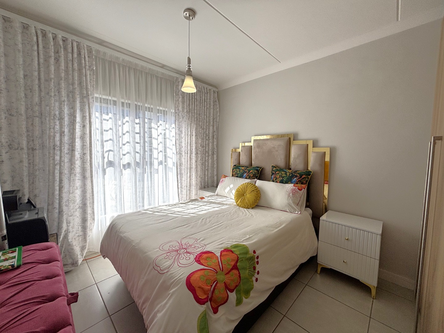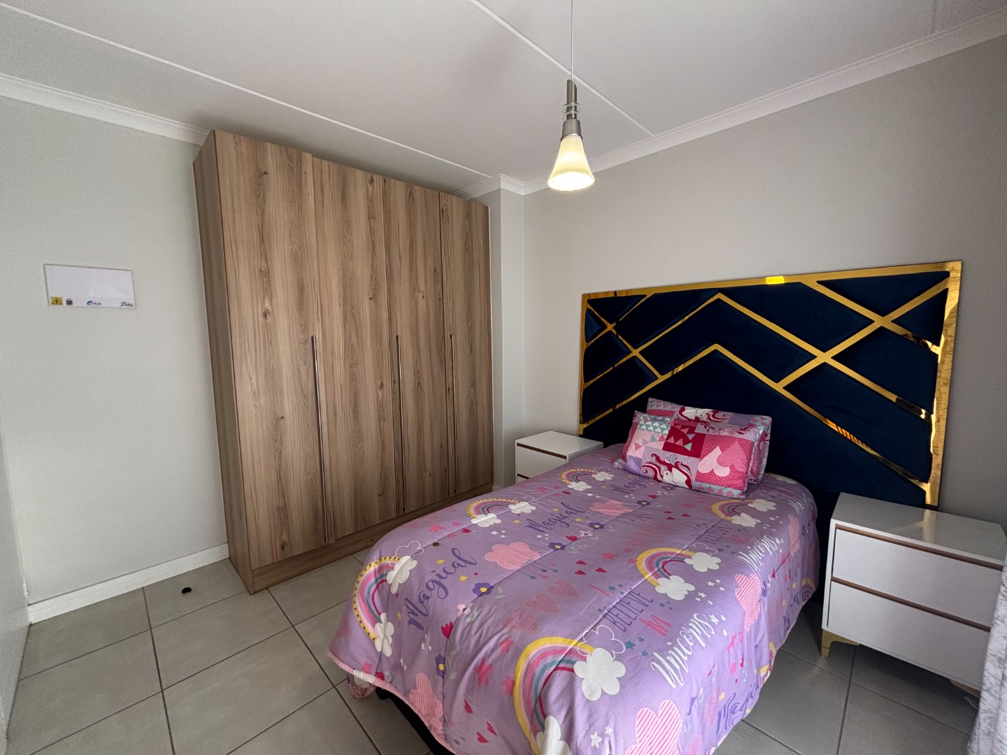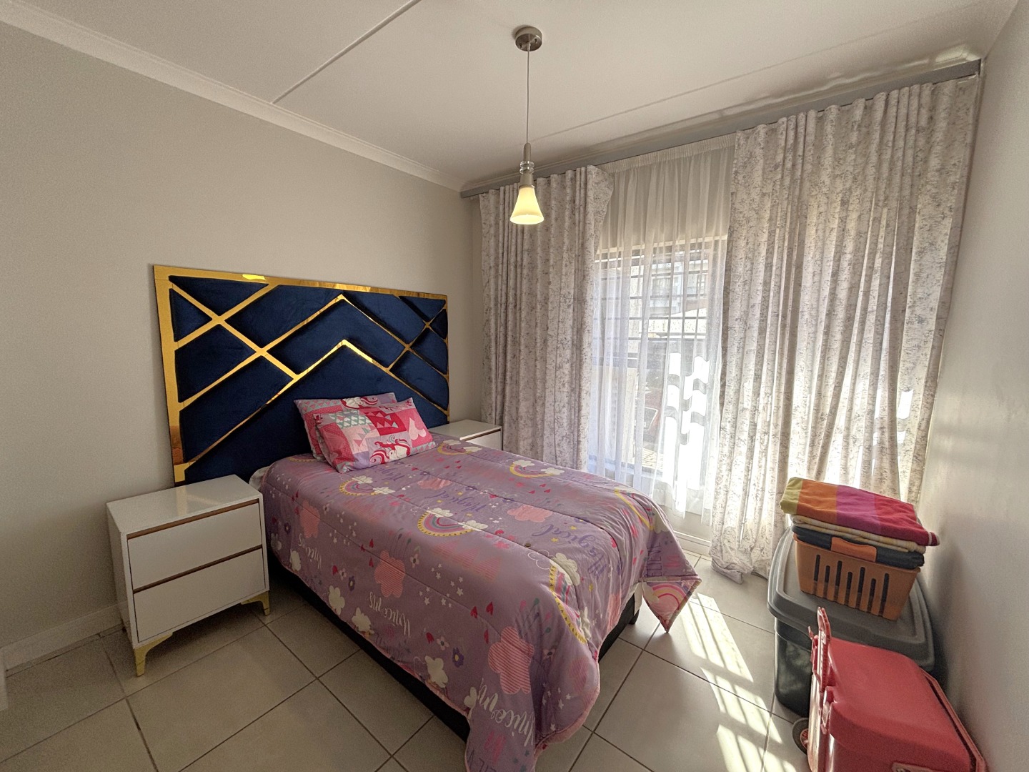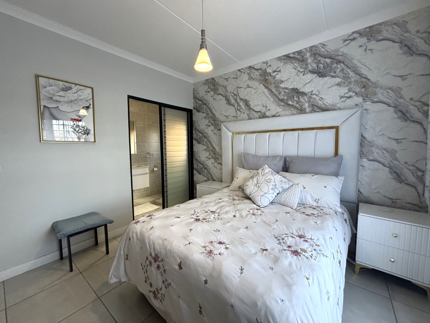 This enchanting 3-bedroom, 2-bathroom ground floor unit in The Blyde unfolds like a poem of serenity and elegance. The main bedroom, a canvas of sophistication, boasts a majestic marble-accented wall framing a plush bed draped in floral whispers, leading to an en-suite where a sleek glass shower gleams with quiet luxury. The second bedroom, awash in playful hues with golden accents, invites morning light through sheer curtains, while the third radiates vibrant charm with colorful blooms against a navy and gold headboard, a space where creativity blooms. The bathrooms—one cradling a deep bathtub within soft gray tiles, the other offering a glass-encased shower—provide serene retreats of calm and cleanliness.