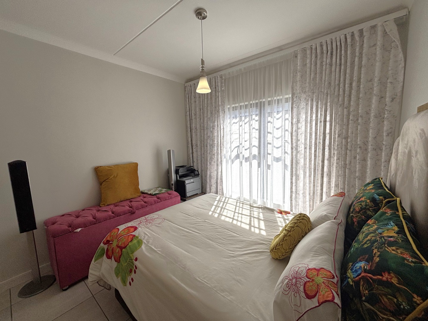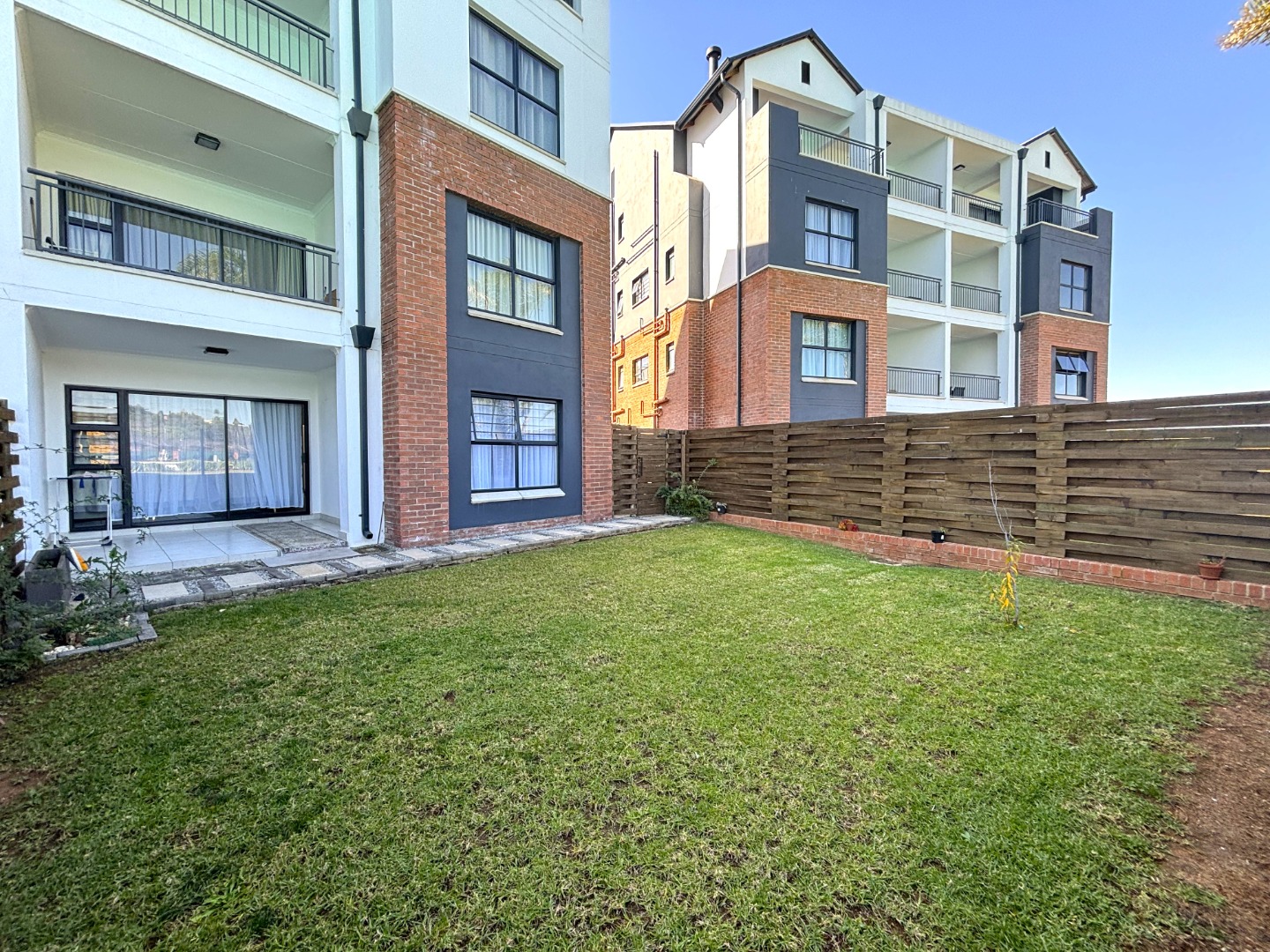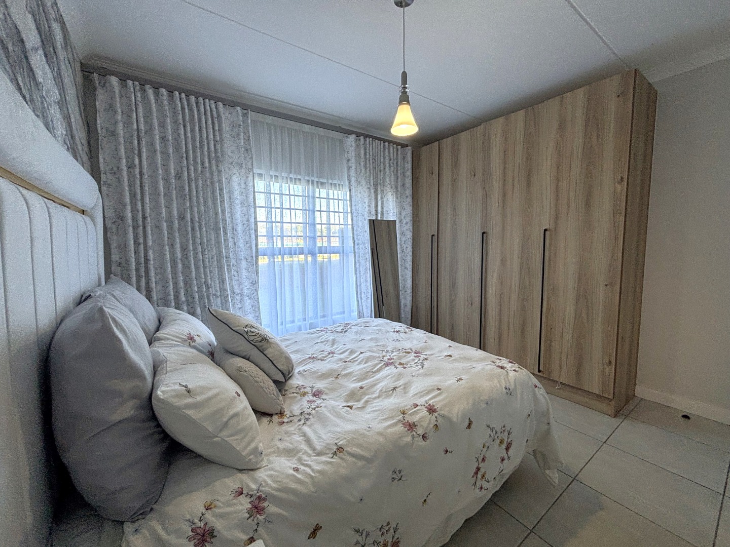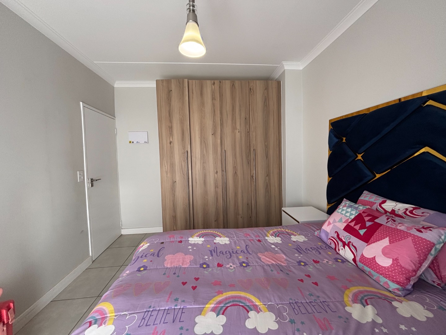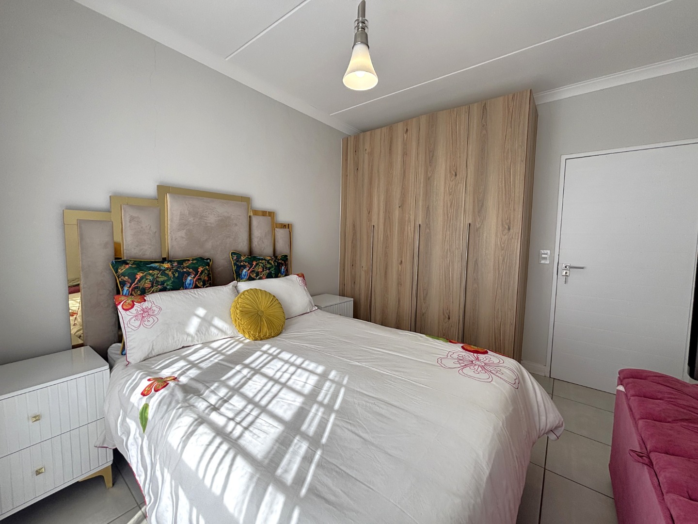 This enchanting 3-bedroom, 2-bathroom ground floor unit in The Blyde unfolds like a poem of serenity and elegance. The main bedroom, a canvas of sophistication, boasts a majestic marble-accented wall framing a plush bed draped in floral whispers, leading to an en-suite where a sleek glass shower gleams with quiet luxury. The second bedroom, awash in playful hues with golden accents, invites morning light through sheer curtains, while the third radiates vibrant charm with colorful blooms against a navy and gold headboard, a space where creativity blooms. The bathrooms—one cradling a deep bathtub within soft gray tiles, the other offering a glass-encased shower—provide serene retreats of calm and cleanliness.