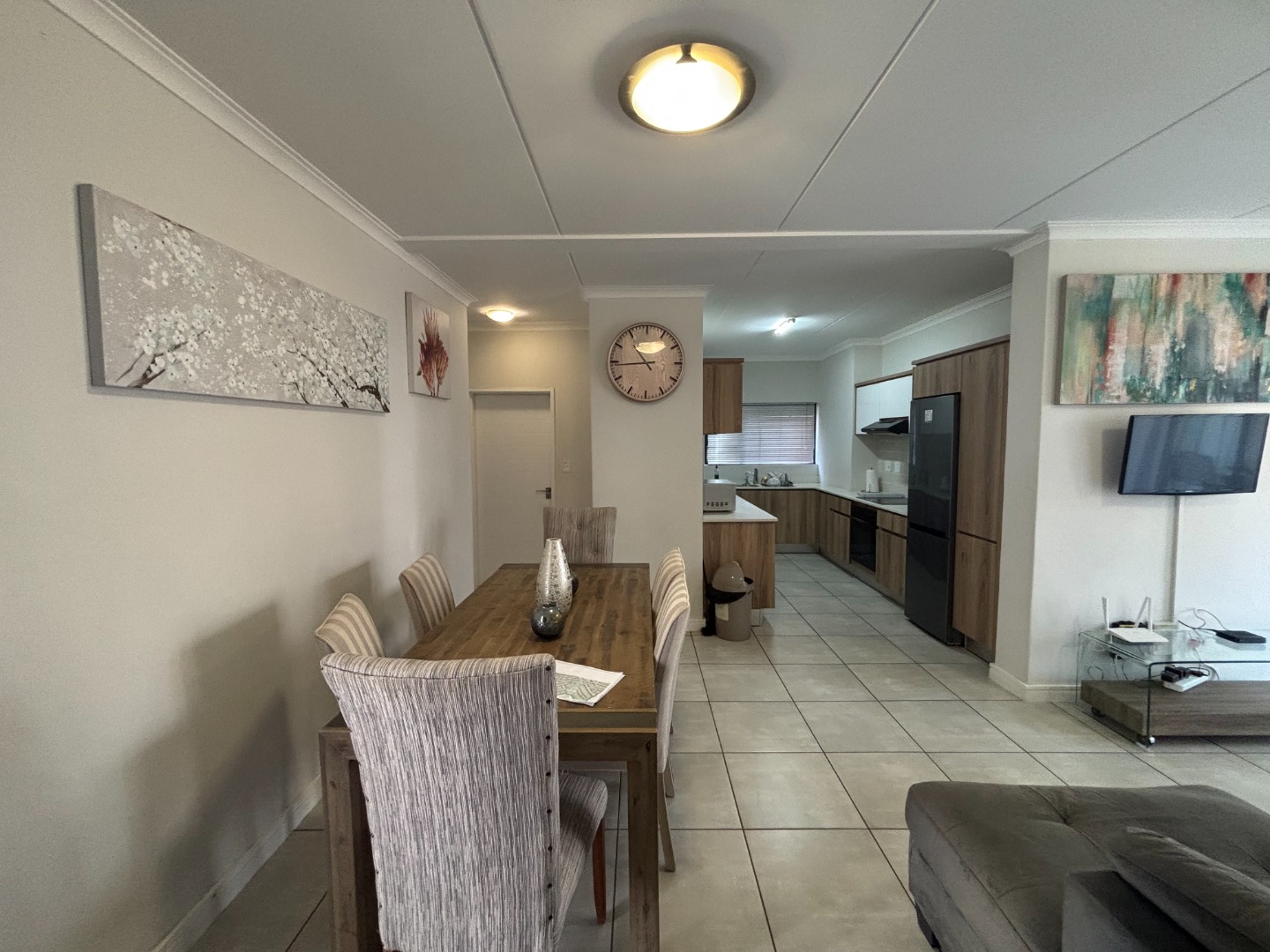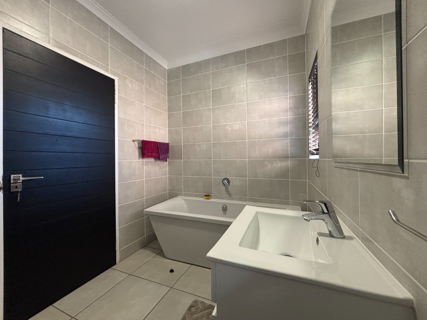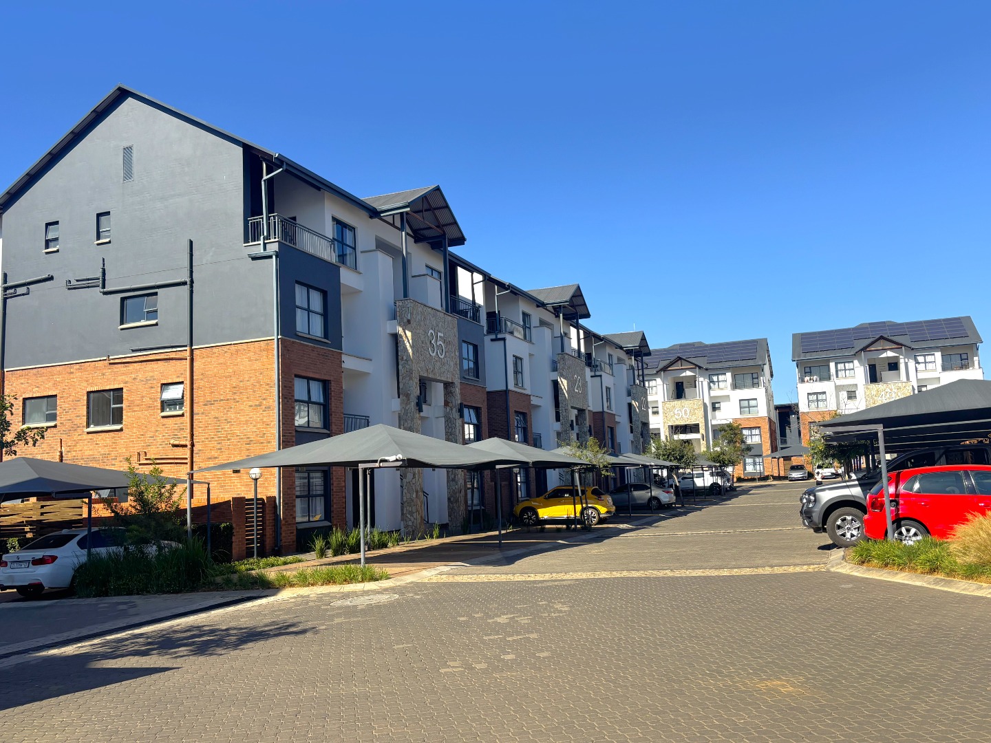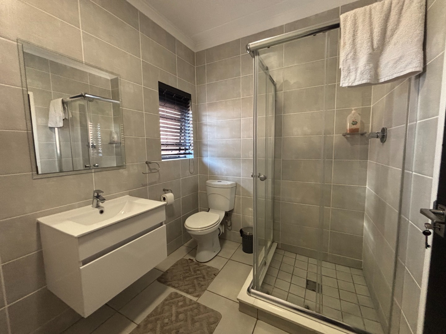 This enchanting 3-bedroom, 2-bathroom ground floor unit in The Blyde unfolds like a poem of serenity and elegance. The main bedroom, a canvas of sophistication, boasts a majestic marble-accented wall framing a plush bed draped in floral whispers, leading to an en-suite where a sleek glass shower gleams with quiet luxury. The second bedroom, awash in playful hues with golden accents, invites morning light through sheer curtains, while the third radiates vibrant charm with colorful blooms against a navy and gold headboard, a space where creativity blooms. The bathrooms—one cradling a deep bathtub within soft gray tiles, the other offering a glass-encased shower—provide serene retreats of calm and cleanliness.