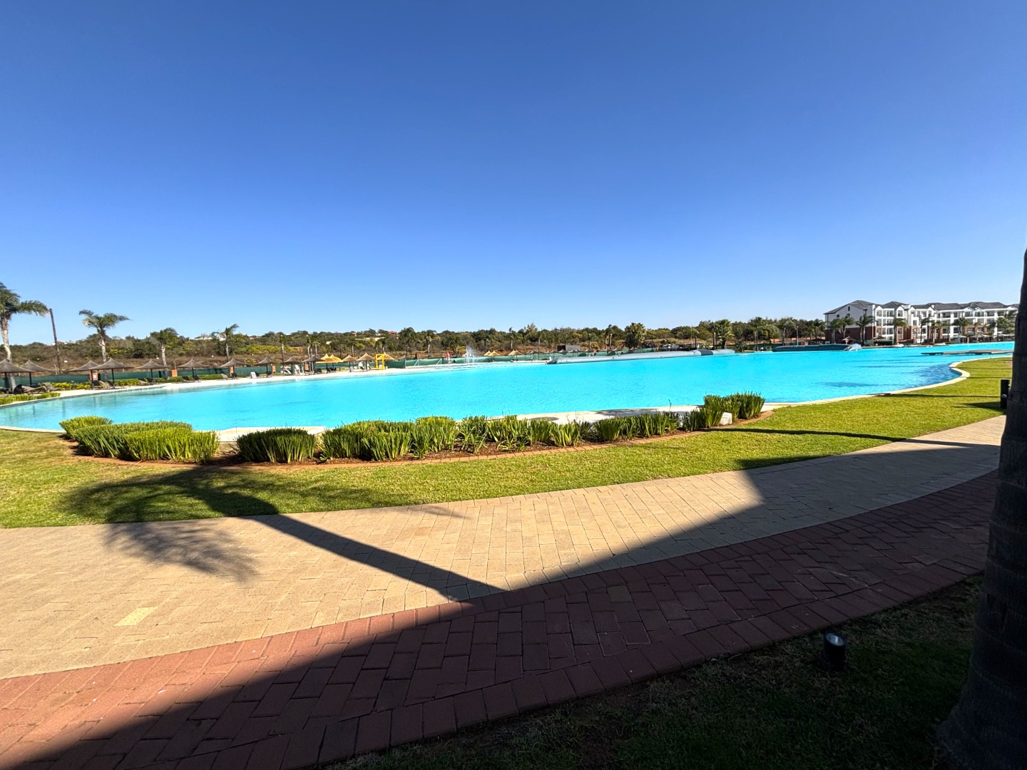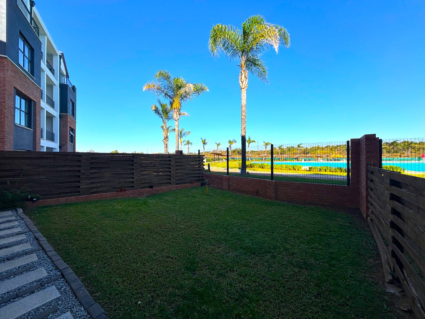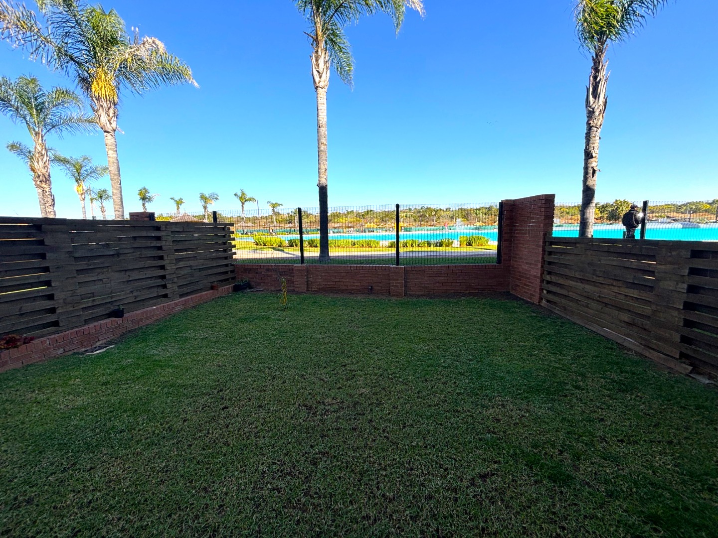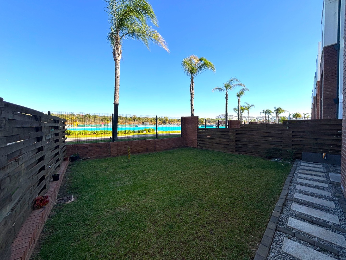 The heart of the home beats in an open-plan living area, where a modern kitchen, gleaming with stainless steel appliances and polished counters, flows seamlessly into a cozy lounge adorned with striped cushions and a turquoise throw that echoes the lagoon’s hues. Beyond the glass doors, a sprawling garden stretches like a verdant canvas toward the shimmering lagoon, framed by swaying palms and endless skies. The exterior, with its robust brick and contemporary lines, guards this sanctuary, while covered parking and a paved courtyard add practicality to this poetic retreat.
