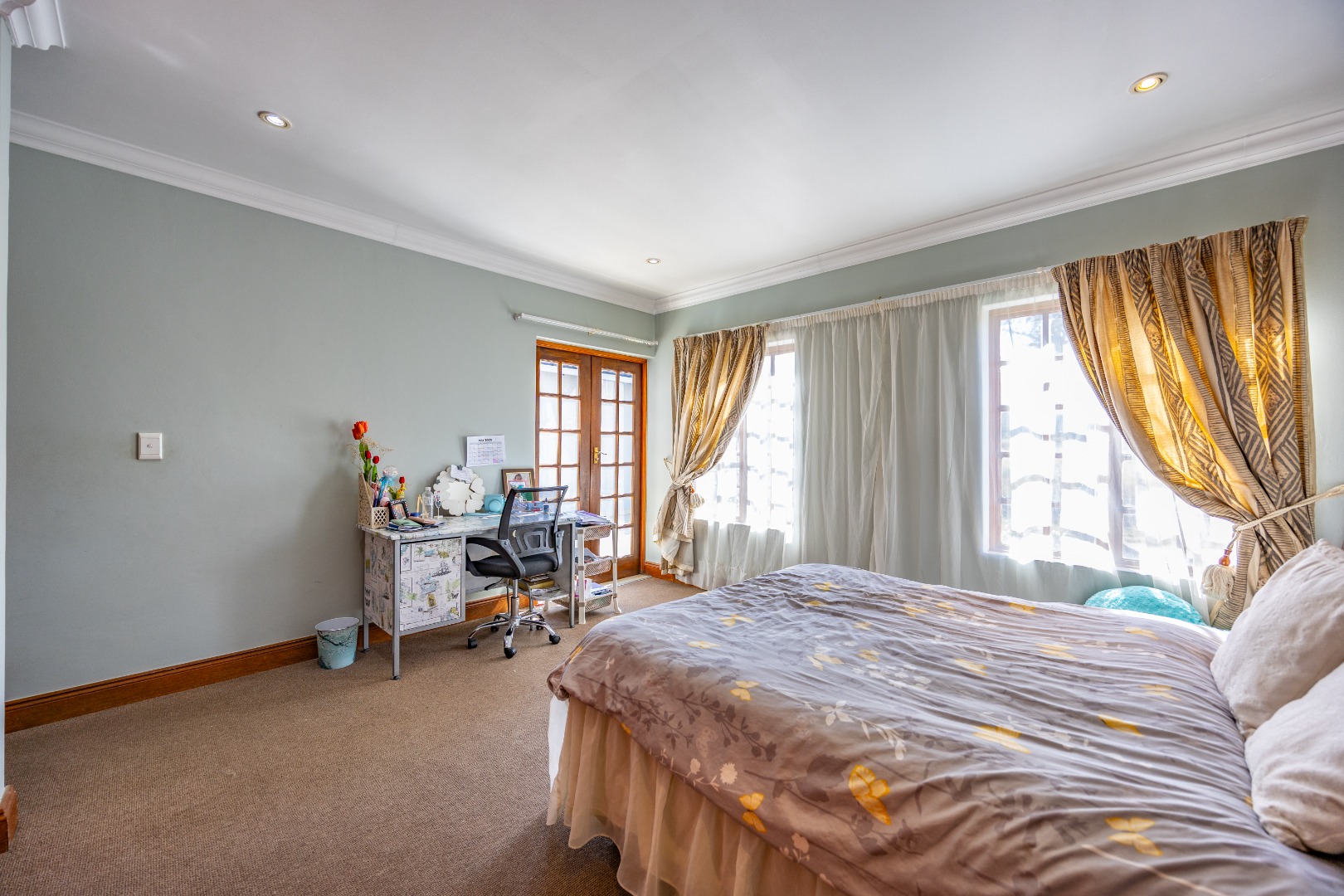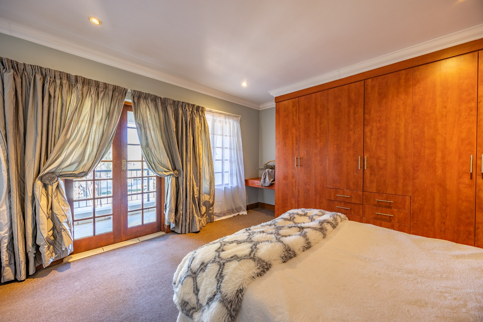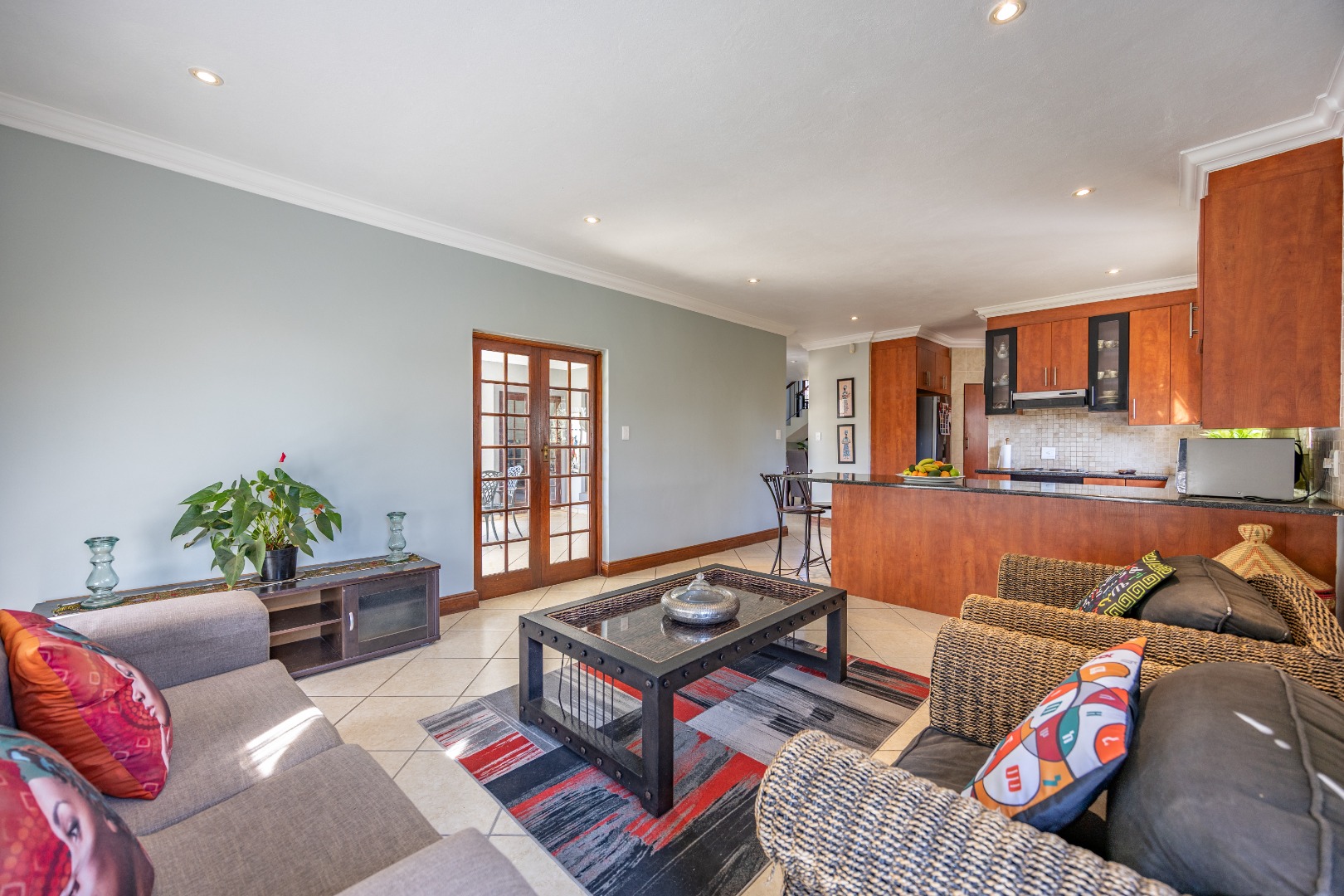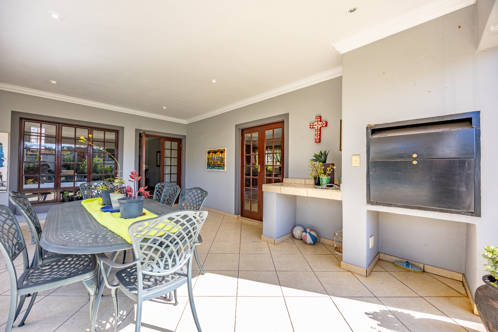 Upstairs, three bedrooms open directly onto a sunny patio, creating a peaceful retreat for morning coffee or evening relaxation. Two of the bedrooms feature en-suite bathrooms for added comfort, and the main suite boasts a walk-in closet for a touch of luxury. A separate linen room keeps everything neatly in place. Downstairs, the living areas extend to a covered patio with a built-in braai, overlooking a sparkling swimming pool and beautifully landscaped wrap-around garden—perfect for outdoor entertaining in a pet-friendly setting.