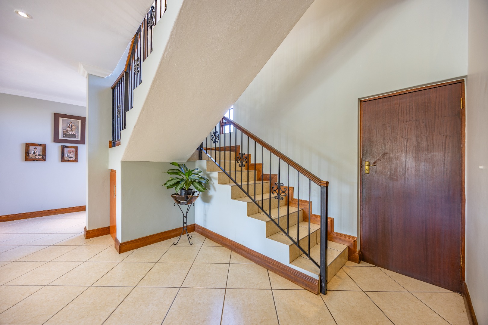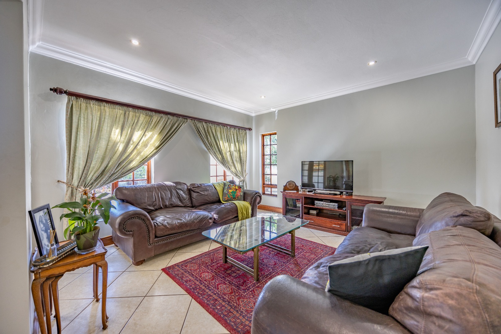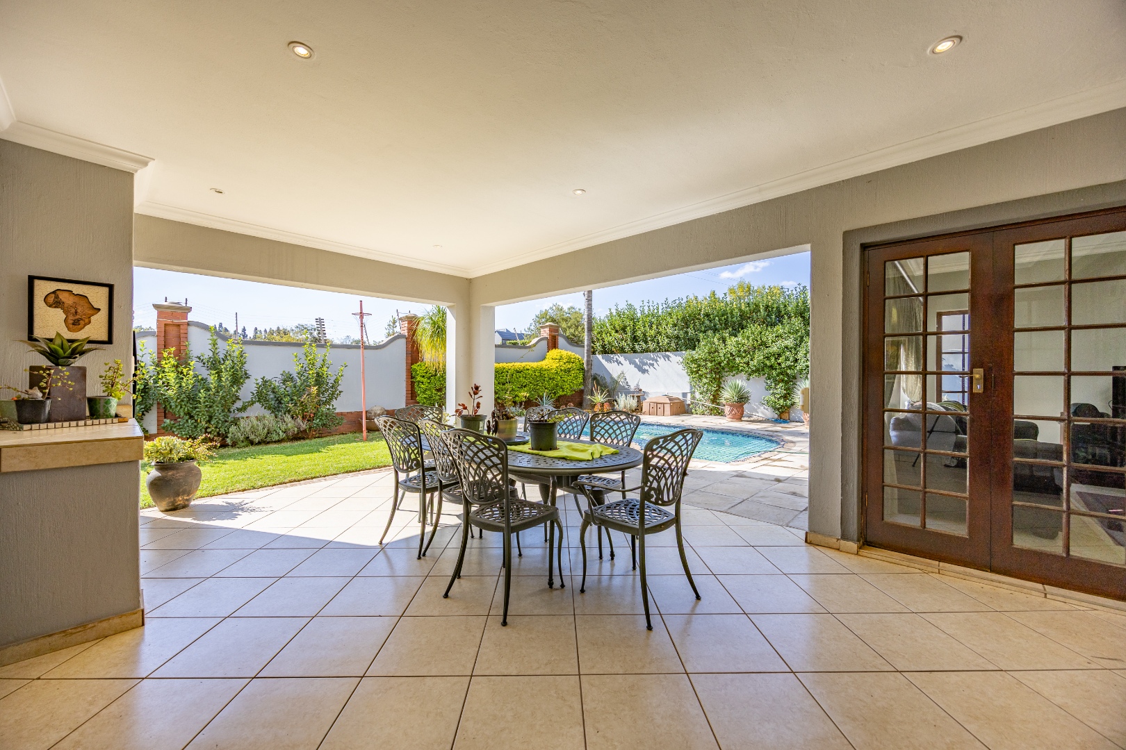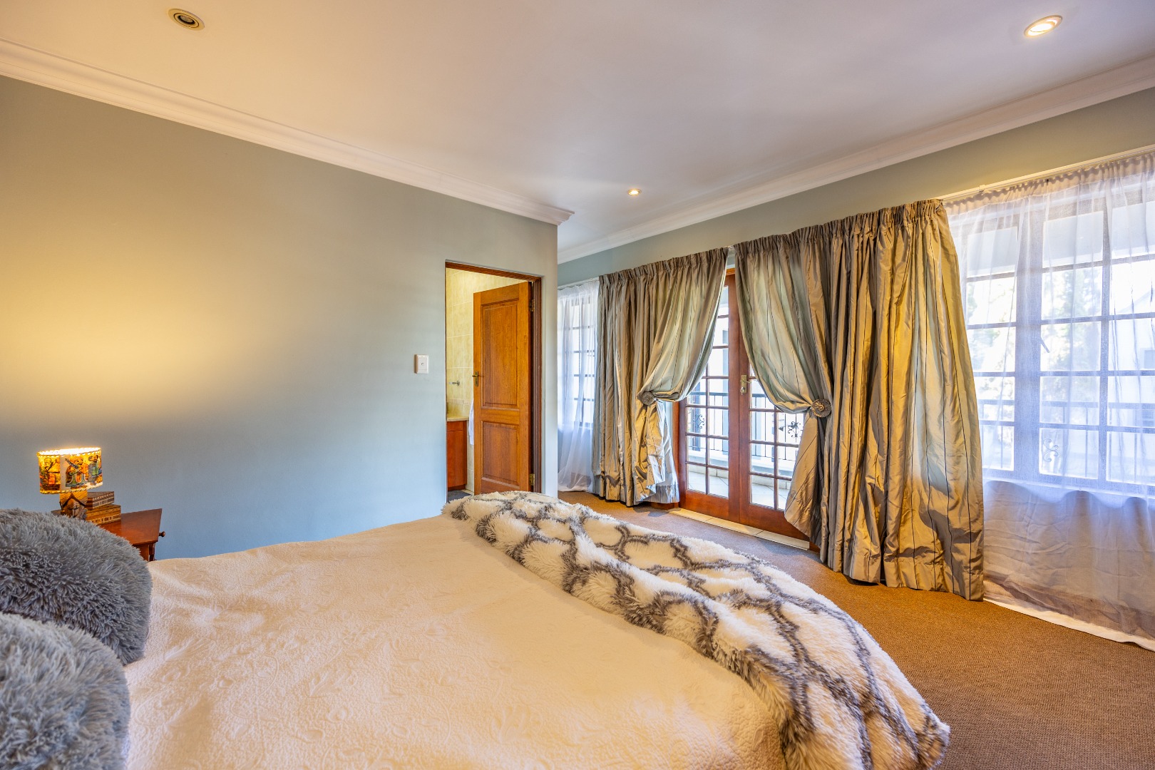 Upstairs, three bedrooms open directly onto a sunny patio, creating a peaceful retreat for morning coffee or evening relaxation. Two of the bedrooms feature en-suite bathrooms for added comfort, and the main suite boasts a walk-in closet for a touch of luxury. A separate linen room keeps everything neatly in place. Downstairs, the living areas extend to a covered patio with a built-in braai, overlooking a sparkling swimming pool and beautifully landscaped wrap-around garden—perfect for outdoor entertaining in a pet-friendly setting.