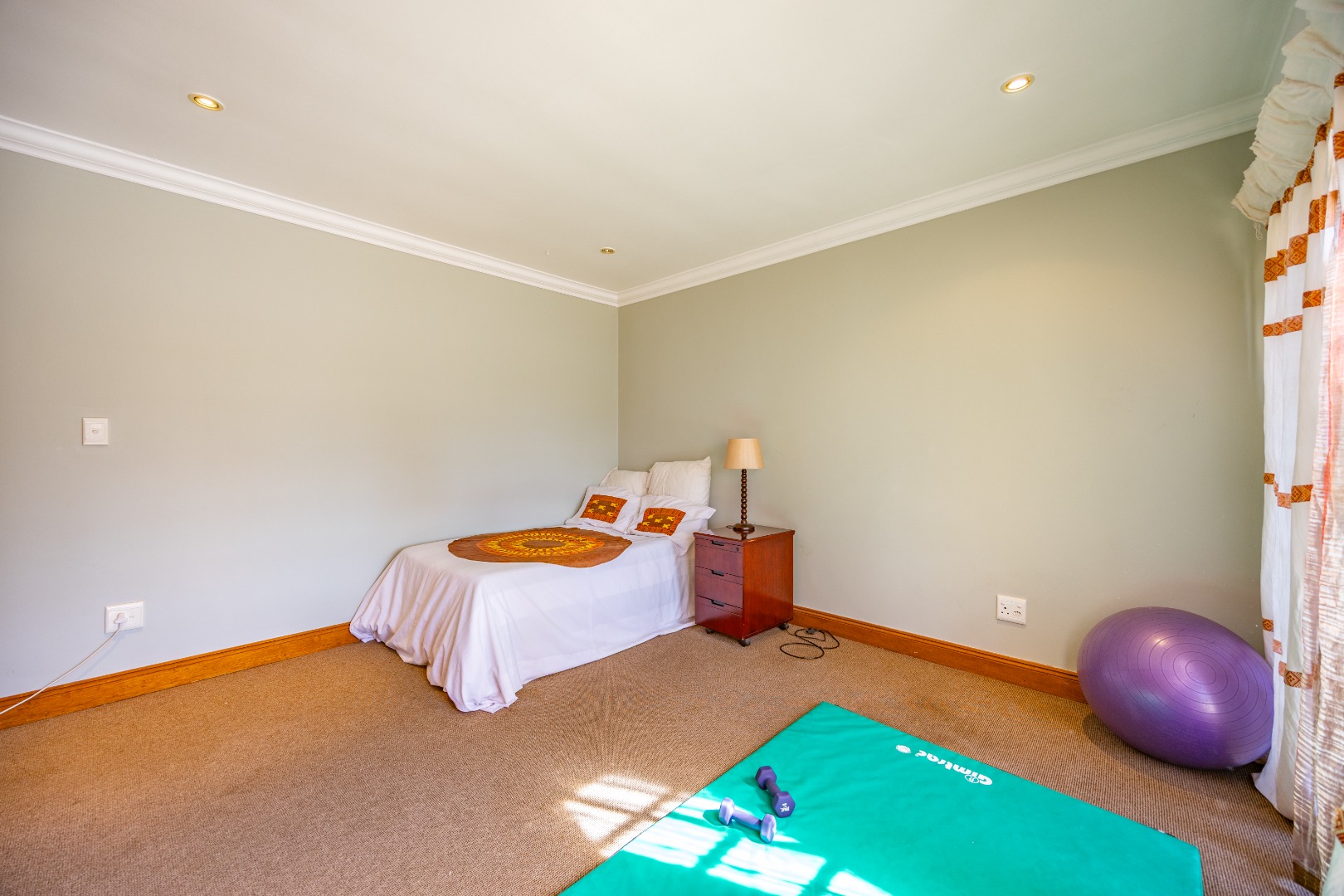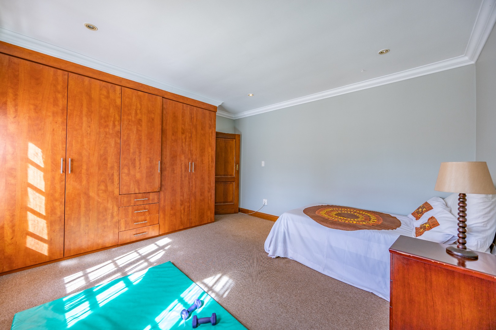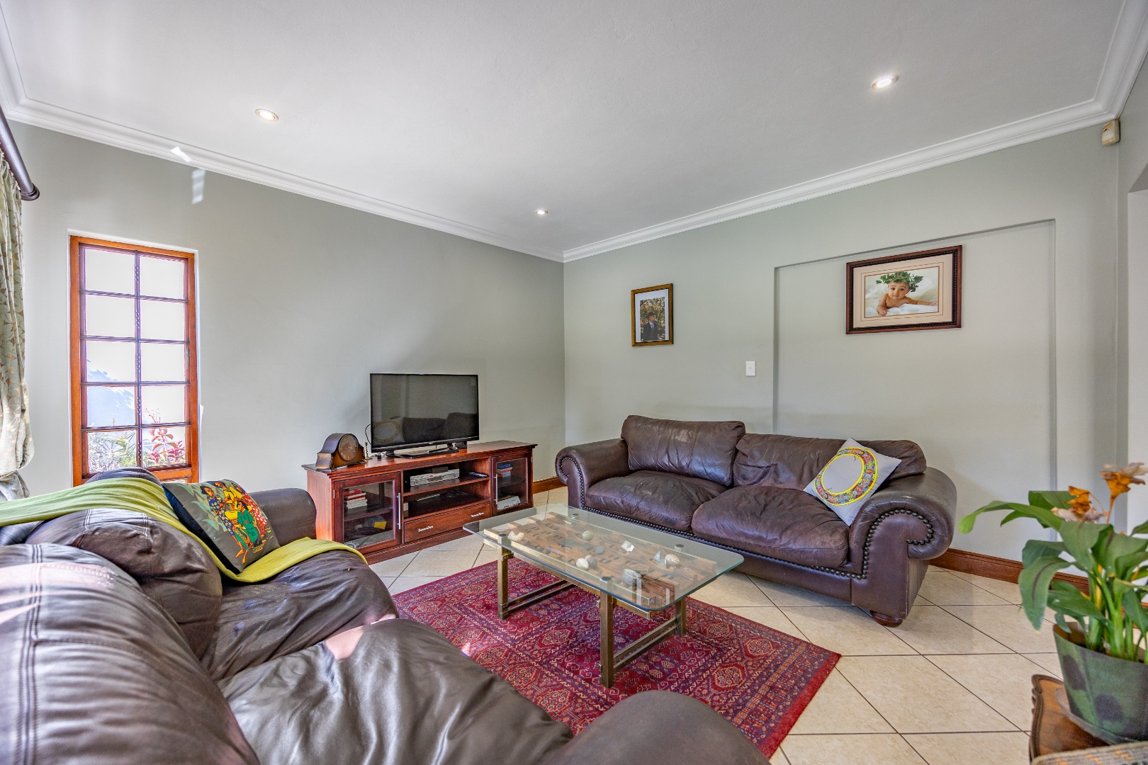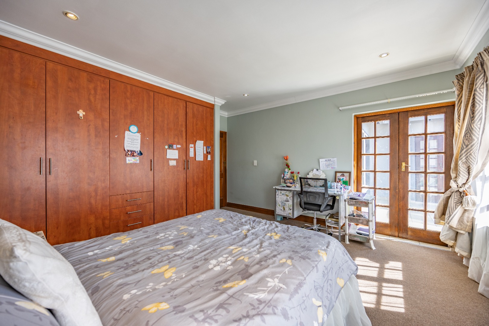 Upstairs, three bedrooms open directly onto a sunny patio, creating a peaceful retreat for morning coffee or evening relaxation. Two of the bedrooms feature en-suite bathrooms for added comfort, and the main suite boasts a walk-in closet for a touch of luxury. A separate linen room keeps everything neatly in place. Downstairs, the living areas extend to a covered patio with a built-in braai, overlooking a sparkling swimming pool and beautifully landscaped wrap-around garden—perfect for outdoor entertaining in a pet-friendly setting.