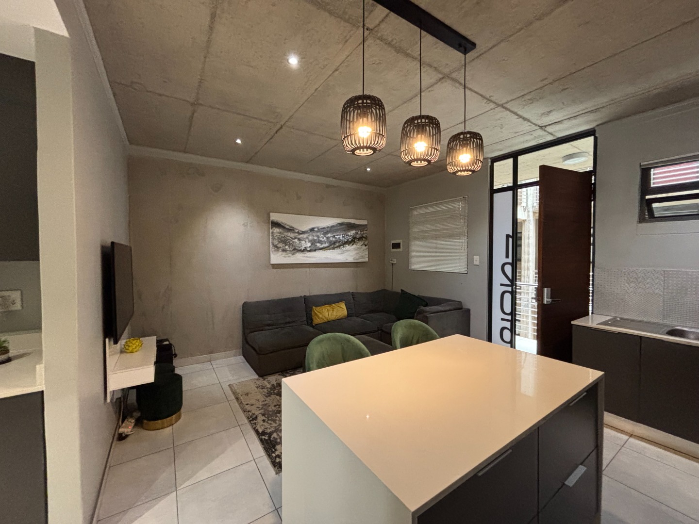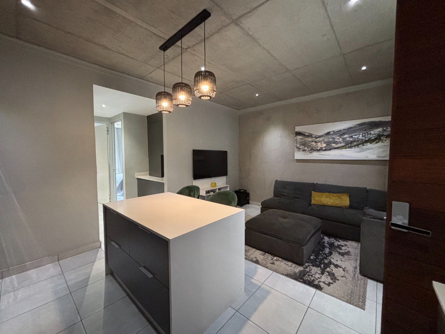 The apartment features a spacious open-plan kitchen and living area, creating a bright and welcoming atmosphere perfect for both everyday living and entertaining guests. The modern kitchen offers ample cupboard space and flows seamlessly into the living room, allowing for easy interaction and a comfortable living experience.