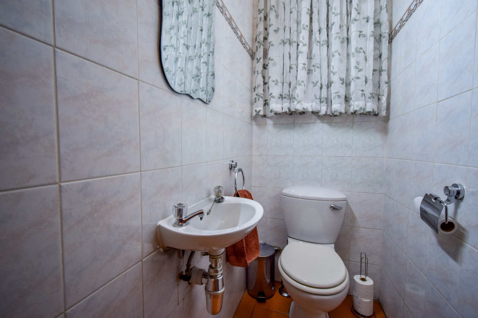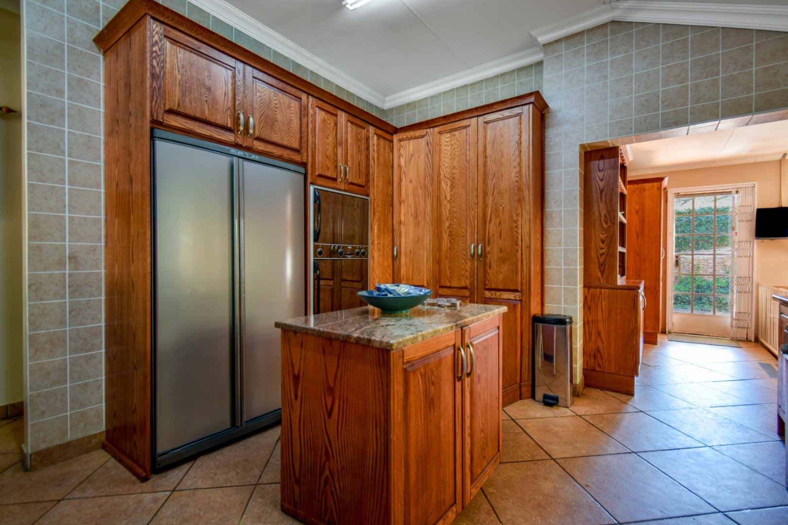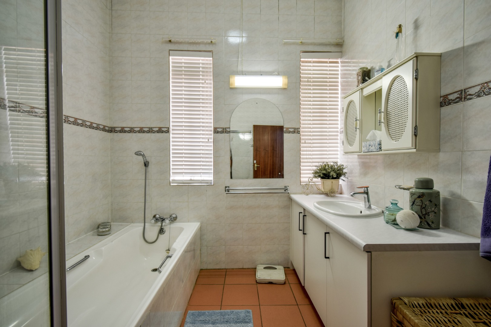 The main residence welcomes you with generous living and entertainment areas, including a spacious lounge with bar and air conditioning, a separate TV room opening onto a covered porch overlooking the pool, and a beautifully sized kitchen with ample space for a double-door fridge. The kitchen connects to a scullery with double basin and room for two appliances, as well as access to the domestic quarters. Three well-proportioned bedrooms offer comfort and storage, with the main bedroom boasting an enclosed private porch and a full en-suite bathroom featuring an outdoor skylit shower. A separate hall bathroom with individual toilet, bath, and shower serves the additional bedrooms, while a guest bathroom adds further convenience.