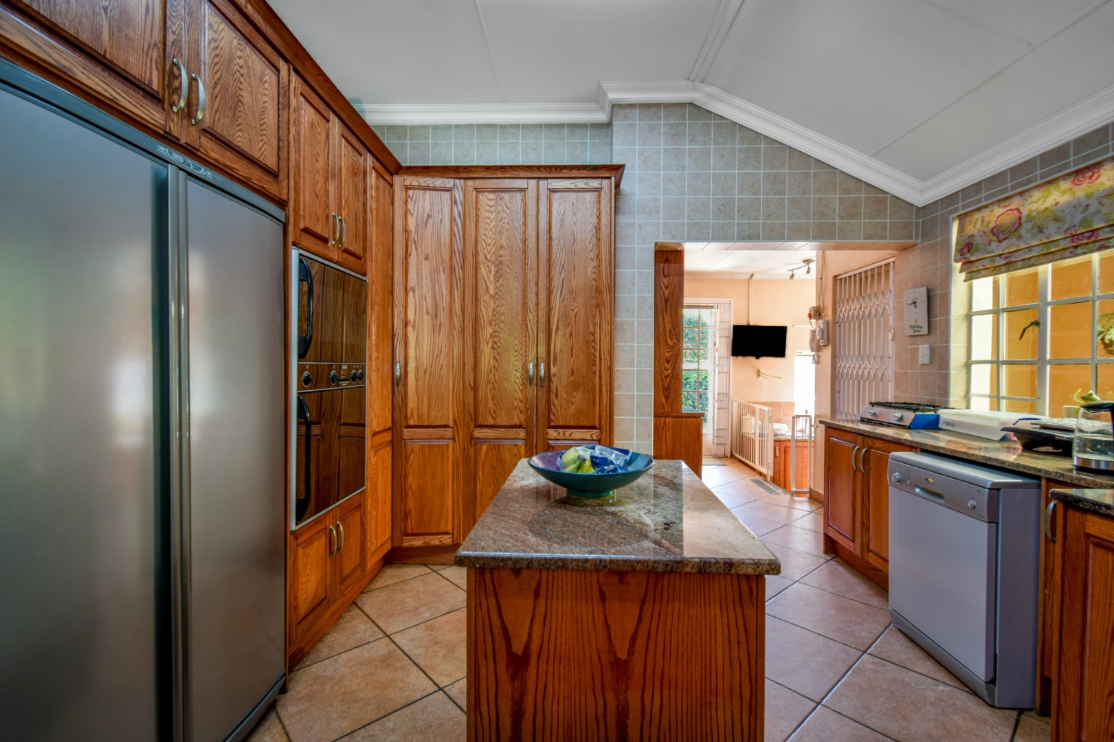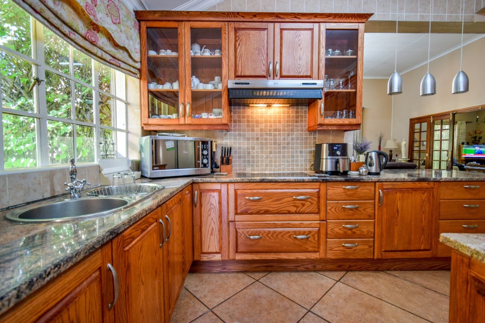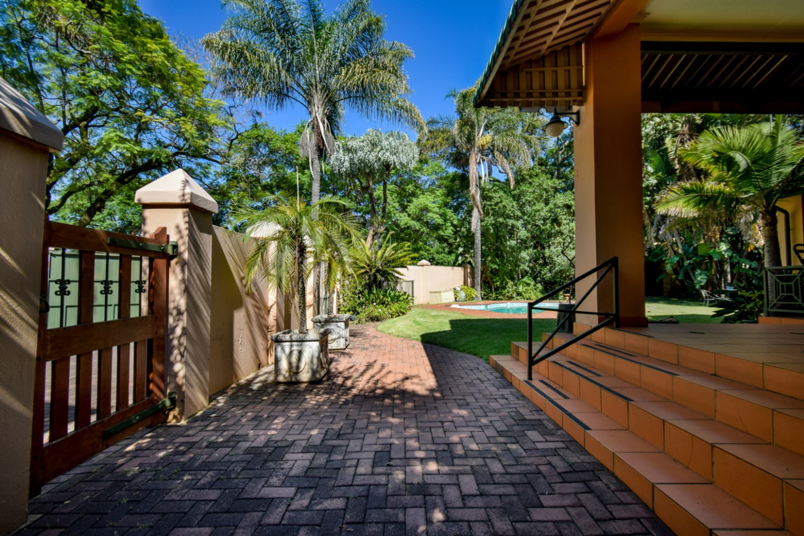 The main residence welcomes you with generous living and entertainment areas, including a spacious lounge with bar and air conditioning, a separate TV room opening onto a covered porch overlooking the pool, and a beautifully sized kitchen with ample space for a double-door fridge. The kitchen connects to a scullery with double basin and room for two appliances, as well as access to the domestic quarters. Three well-proportioned bedrooms offer comfort and storage, with the main bedroom boasting an enclosed private porch and a full en-suite bathroom featuring an outdoor skylit shower. A separate hall bathroom with individual toilet, bath, and shower serves the additional bedrooms, while a guest bathroom adds further convenience.