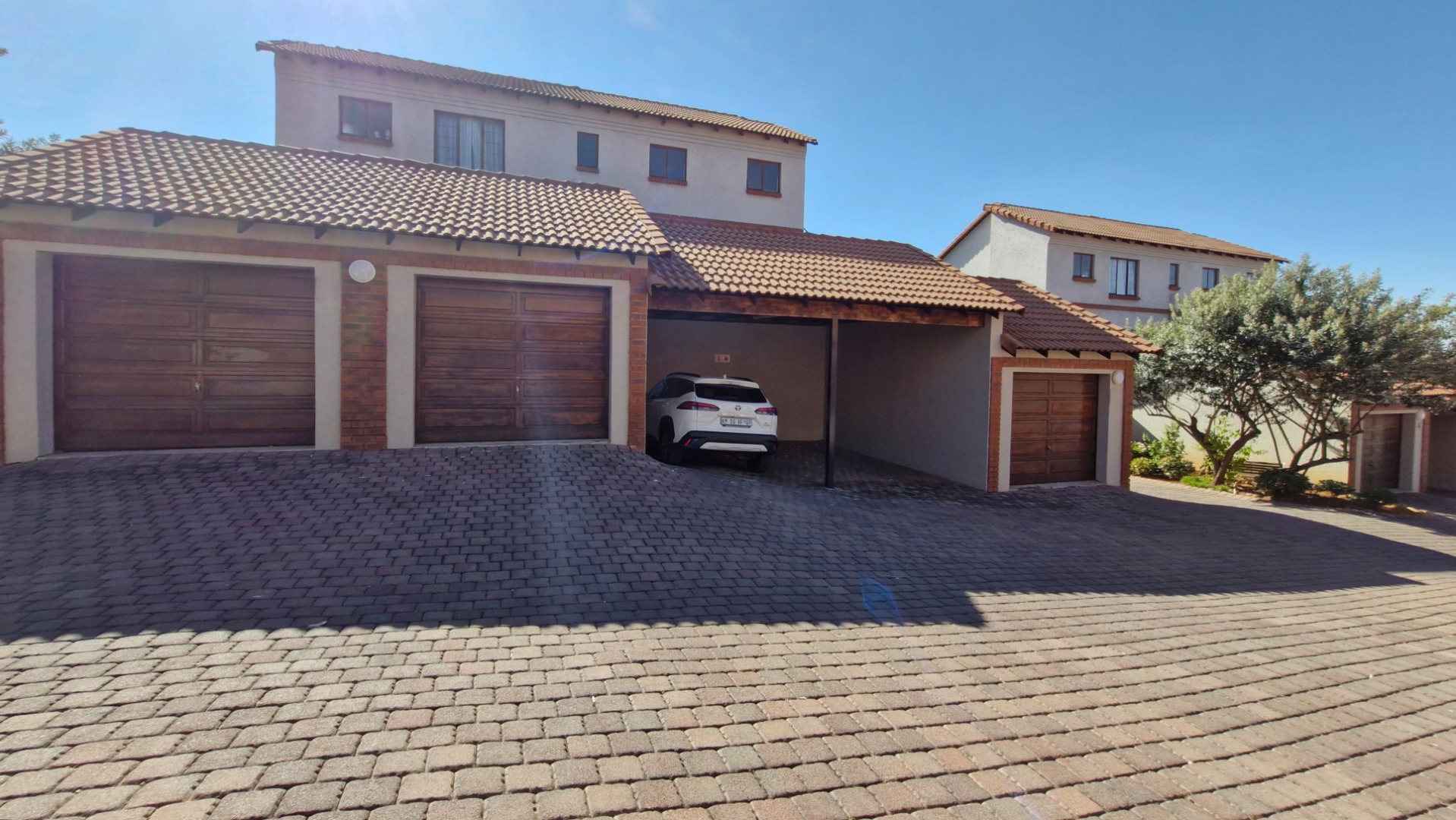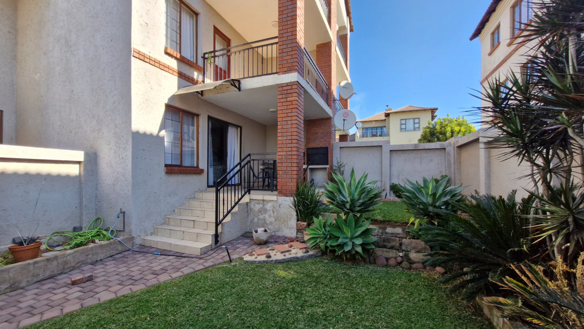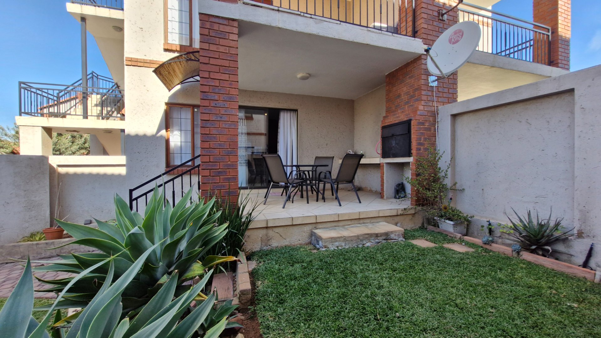This beautiful duplex, situated in the center of one of the complexes within Country View Estate. This is a corner unit with a large two level garden and is very suitable as a lock-up-and-go property. Main features include two bedrooms, one full bathroom, a separate guest toilet, a private enclosed garden, covered patio with a built-in braai, one lock-up garage and one covered parking. The open-plan kitchen with granite tops, gas hob with an under counter oven, breakfast-nook, a corner pantry, space for a fridge and dishwasher and a separate washing-machine connection in the garage. The living-areas flow out to the covered patio with a built-in braai and irrigated garden-area. The guest-toilet is situated on the ground level, with the bedrooms and full bathroom on the second level. The spacious main bedroom has a balcony for extra convenience. The duplex is further complimented with a fibre connection.