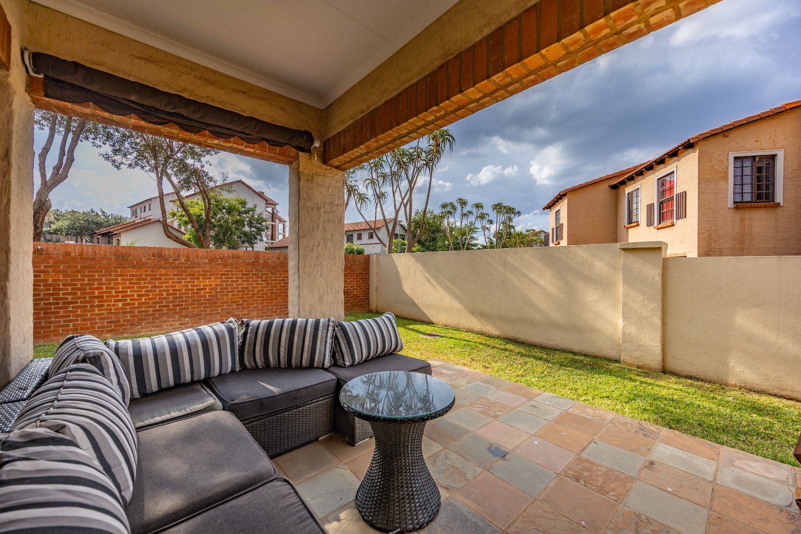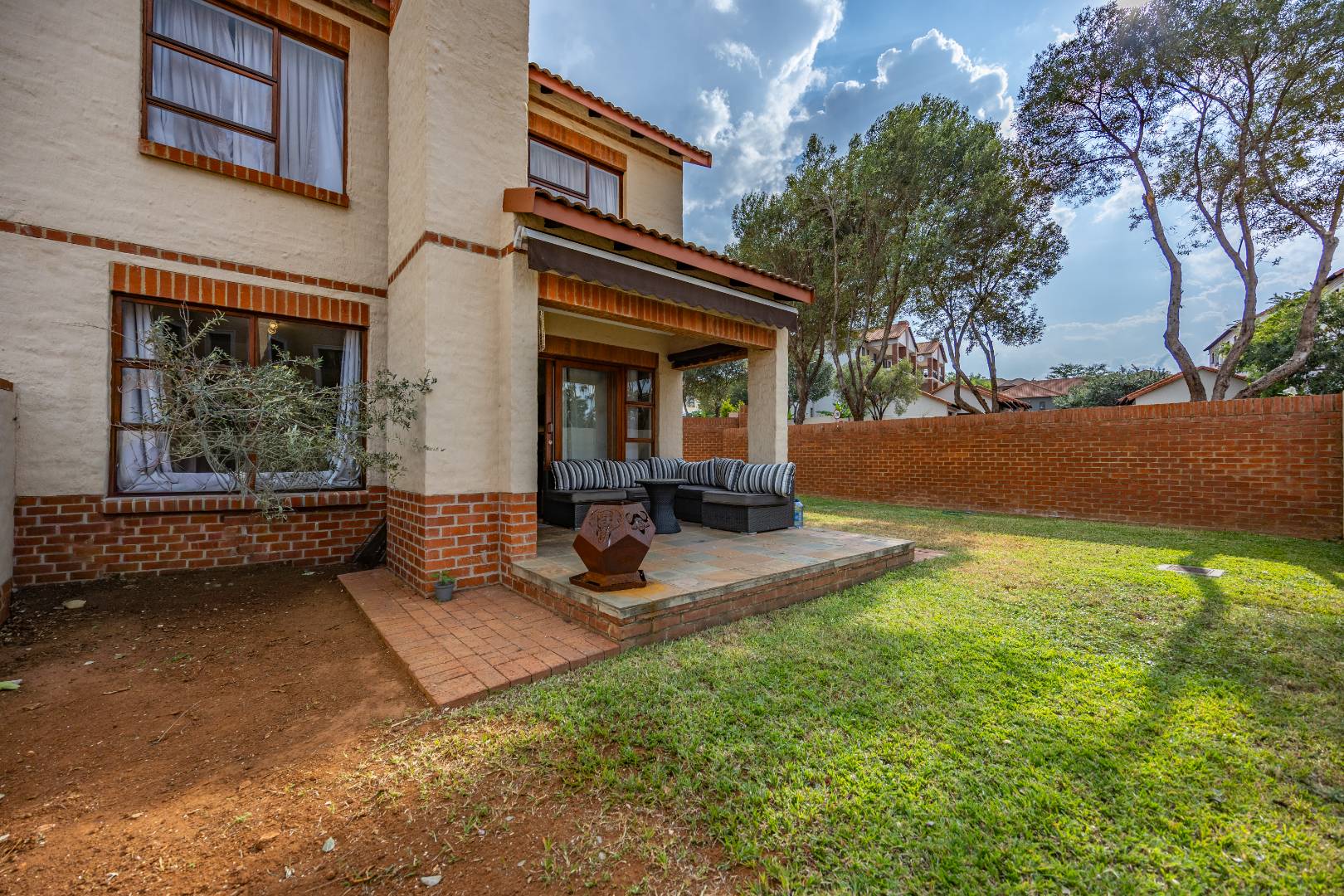 The covered patio is a standout feature, offering a versatile design with one side that can be fully enclosed and a retractable roof, allowing you to enjoy the space in all seasons. A door from the patio leads out to the garden, enhancing the indoor-outdoor lifestyle.