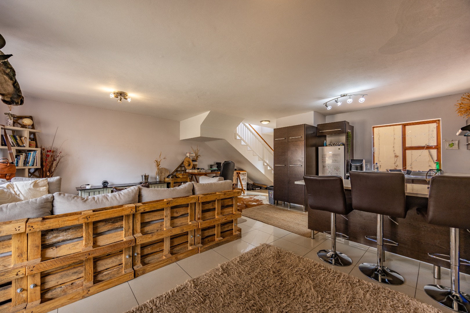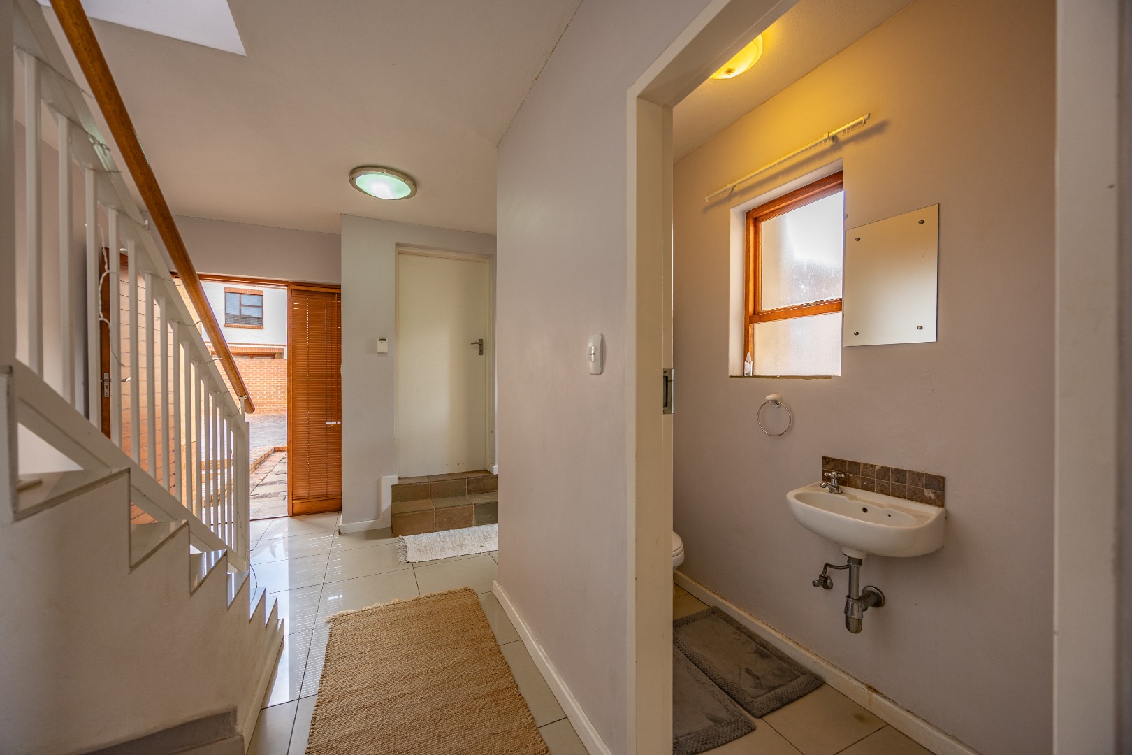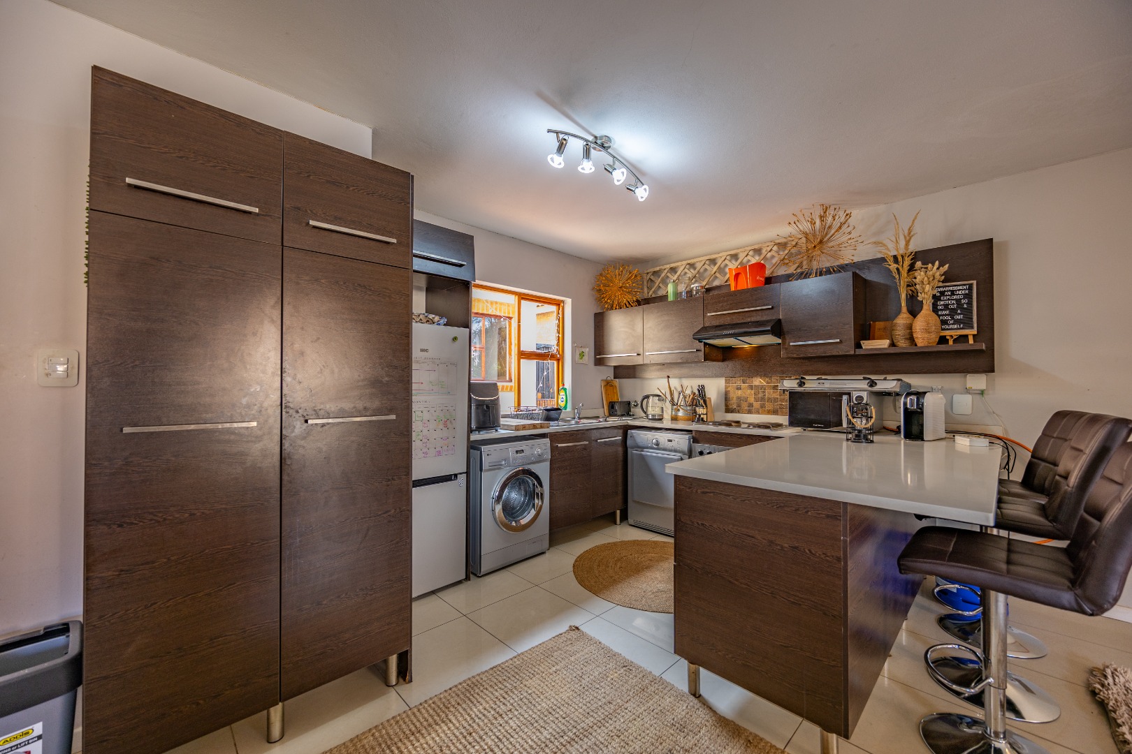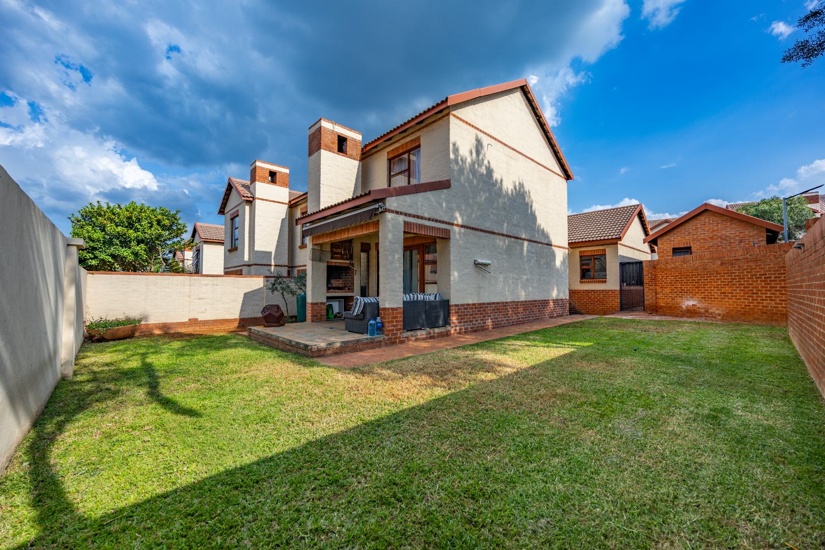 The entrance from the garage leads directly into the home, where you are welcomed by a convenient guest toilet on the ground floor. The open-plan kitchen flows seamlessly into the TV lounge and dining area, creating a comfortable and functional living space ideal for everyday living and entertaining. Sliding doors open onto an outdoor braai area, complemented by a wrap-around garden and a side gate providing easy access for a gardener.