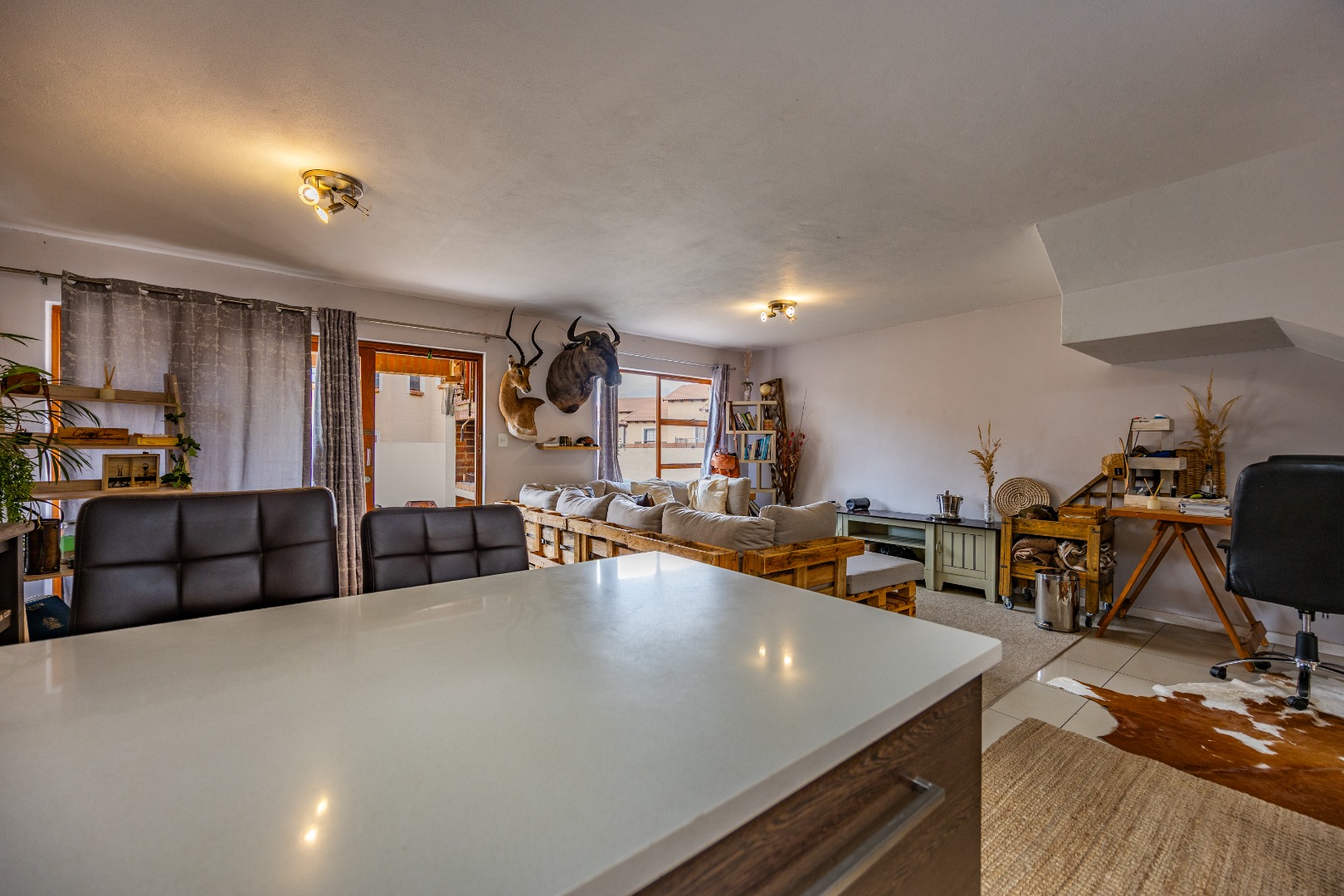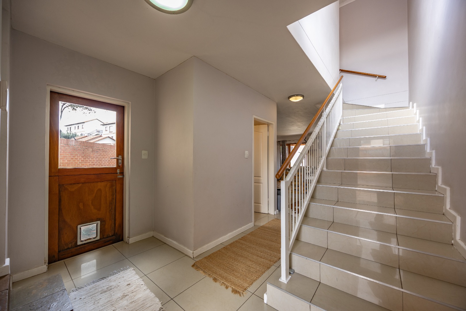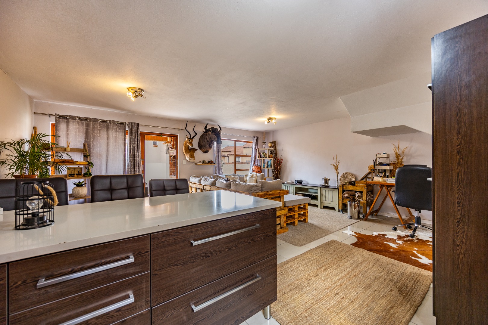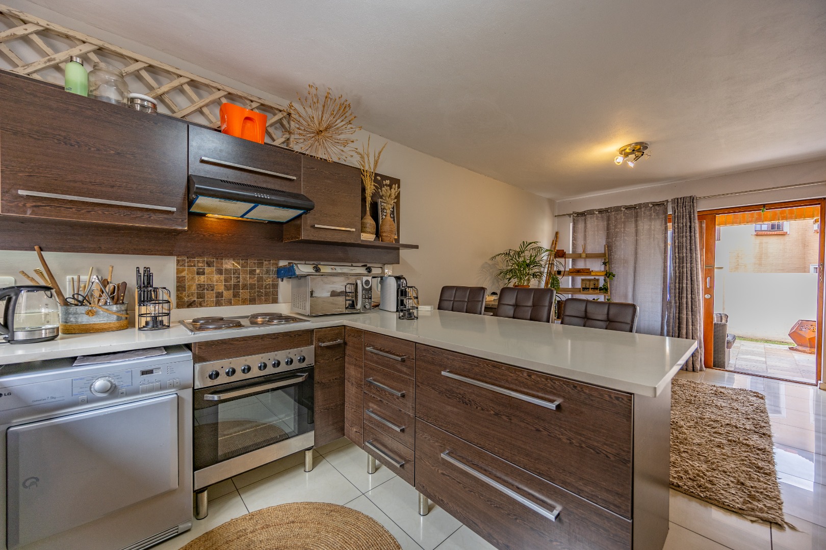 The entrance from the garage leads directly into the home, where you are welcomed by a convenient guest toilet on the ground floor. The open-plan kitchen flows seamlessly into the TV lounge and dining area, creating a comfortable and functional living space ideal for everyday living and entertaining. Sliding doors open onto an outdoor braai area, complemented by a wrap-around garden and a side gate providing easy access for a gardener.