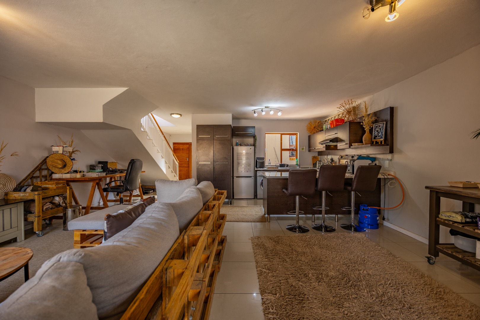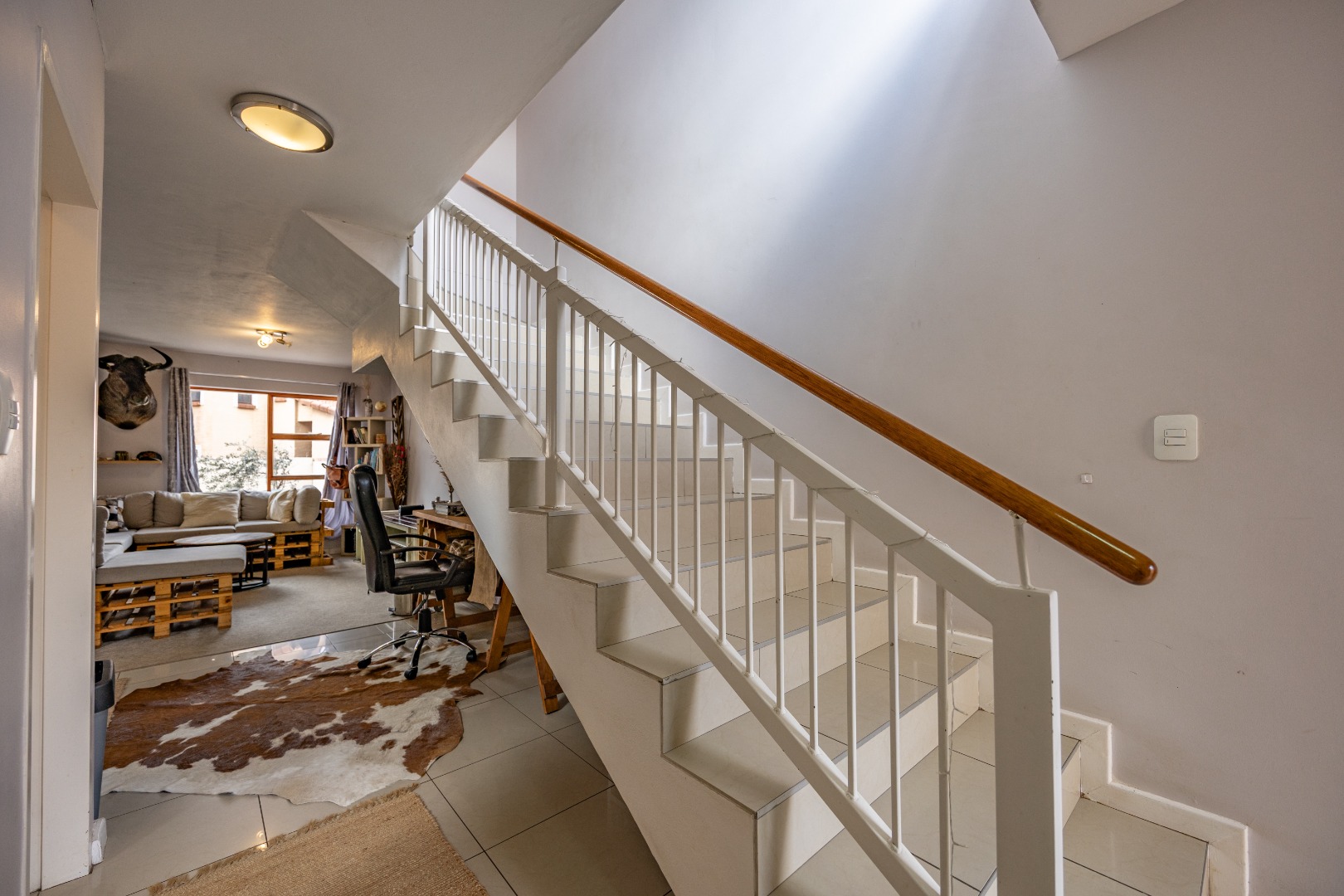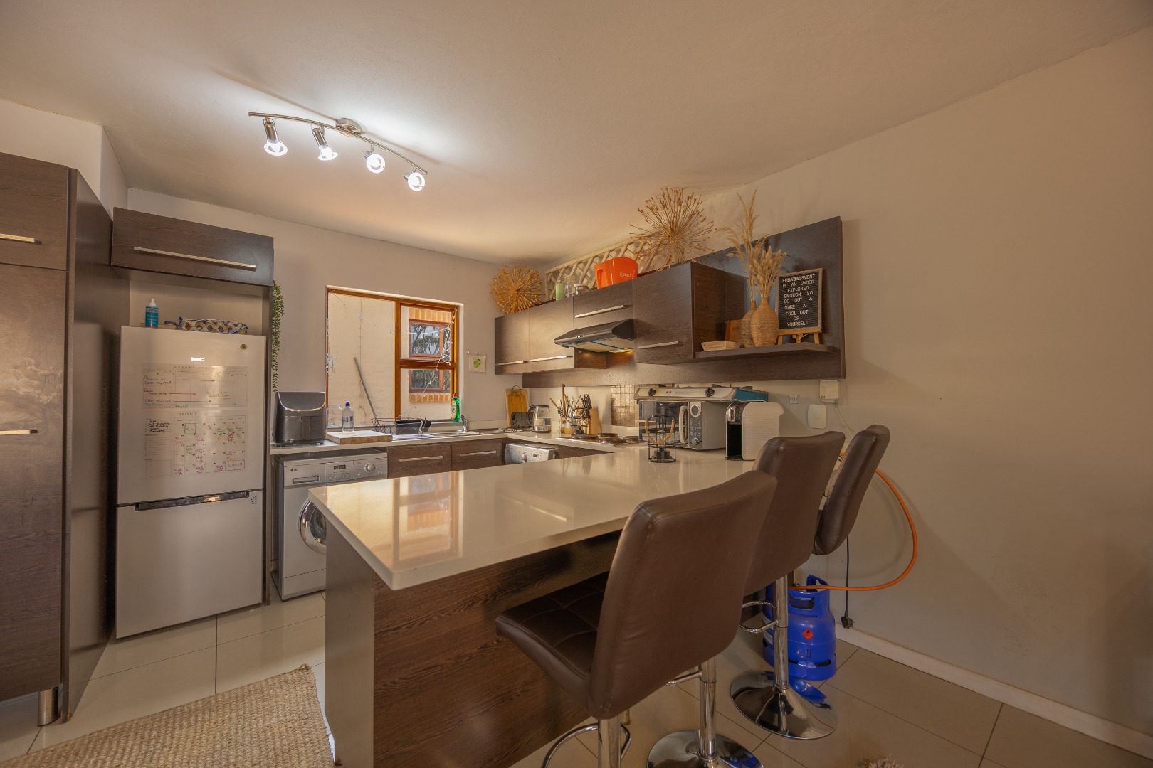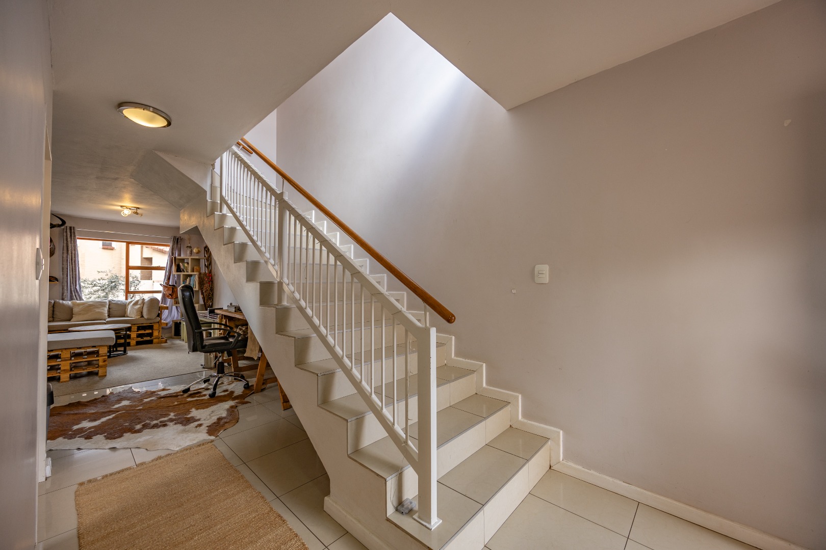The entrance from the garage leads directly into the home, where you are welcomed by a convenient guest toilet on the ground floor. The open-plan kitchen flows seamlessly into the TV lounge and dining area, creating a comfortable and functional living space ideal for everyday living and entertaining. Sliding doors open onto an outdoor braai area, complemented by a wrap-around garden and a side gate providing easy access for a gardener.