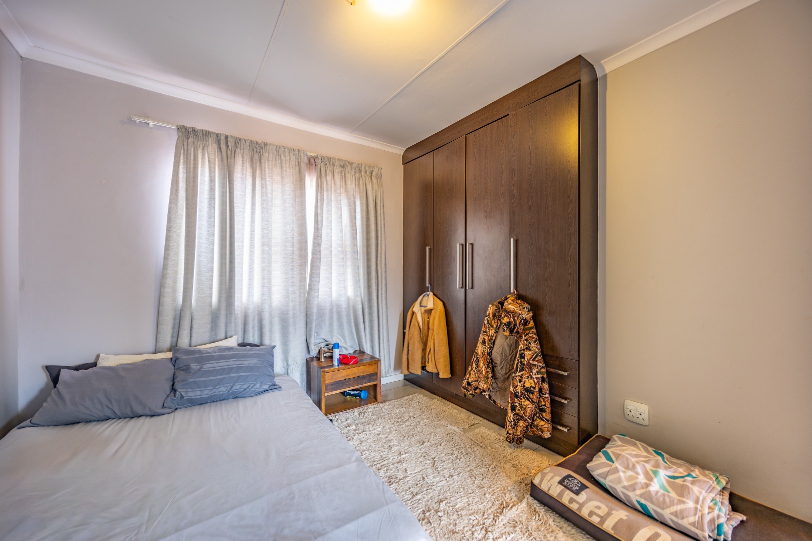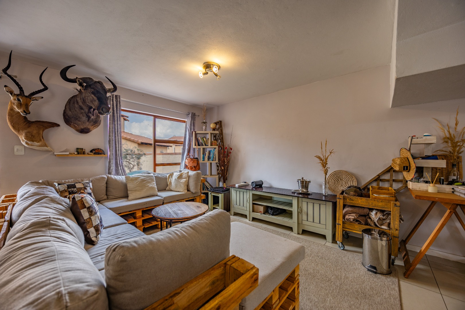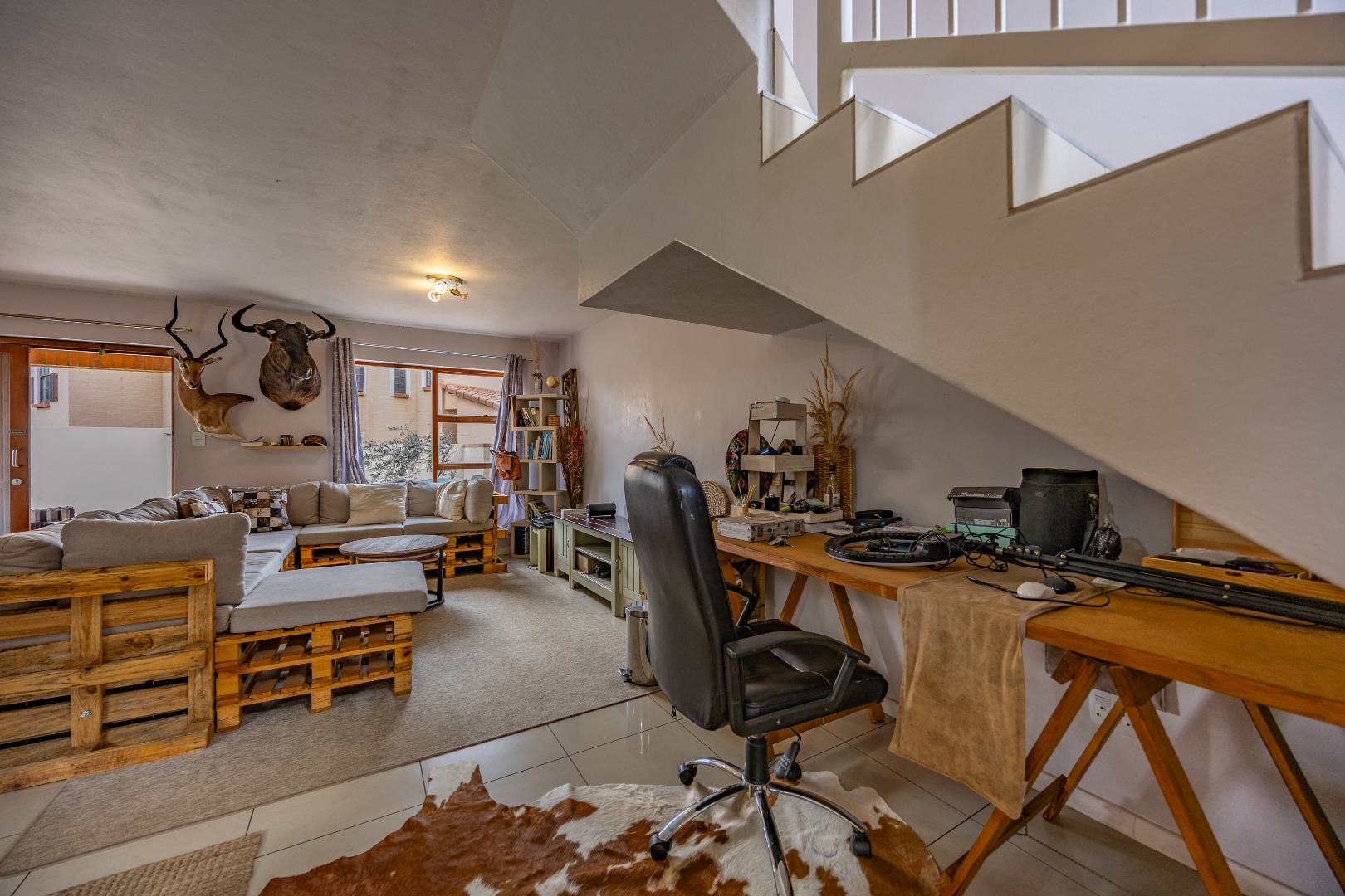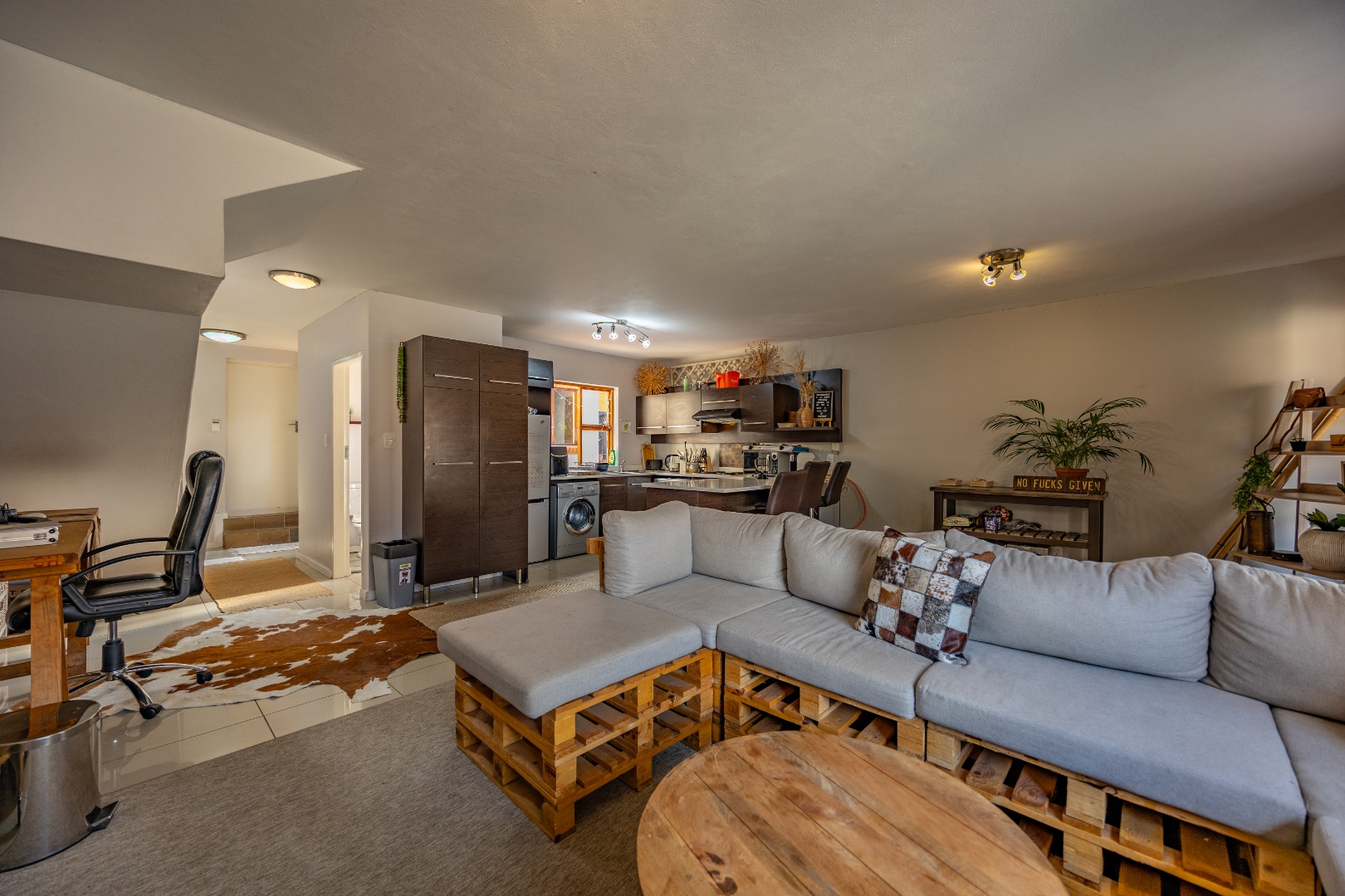The entrance from the garage leads directly into the home, where you are welcomed by a convenient guest toilet on the ground floor. The open-plan kitchen flows seamlessly into the TV lounge and dining area, creating a comfortable and functional living space ideal for everyday living and entertaining. Sliding doors open onto an outdoor braai area, complemented by a wrap-around garden and a side gate providing easy access for a gardener.