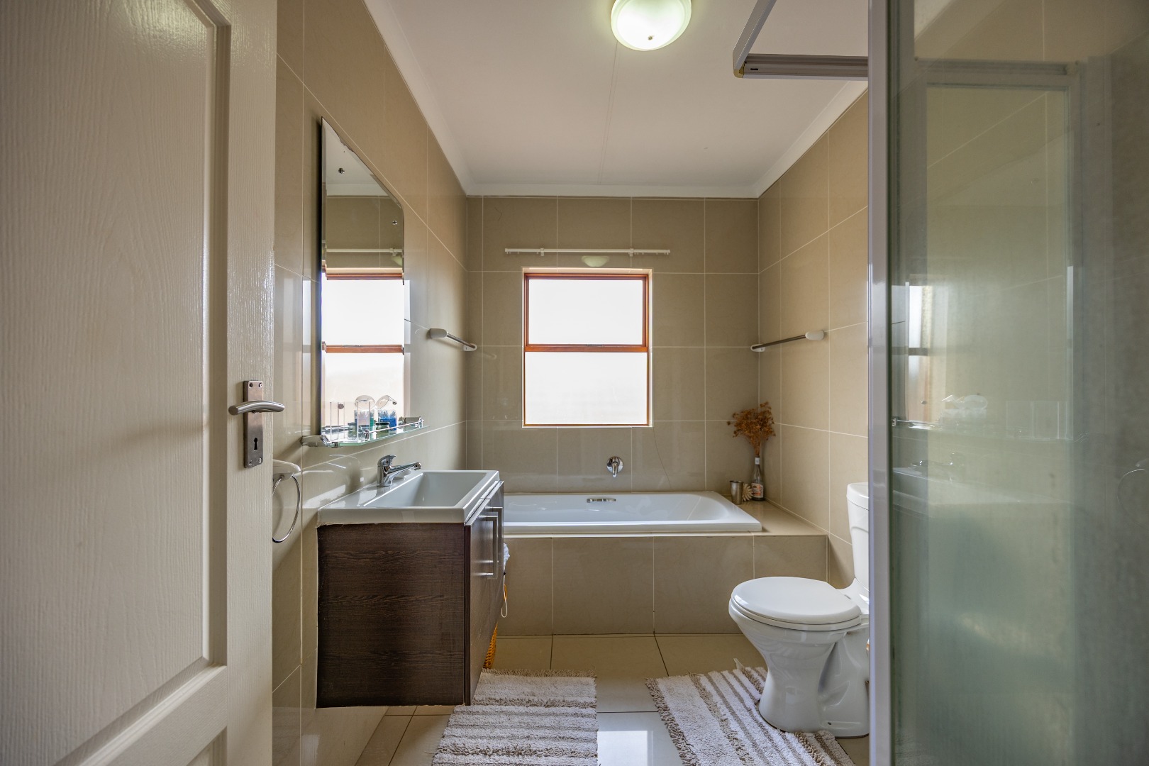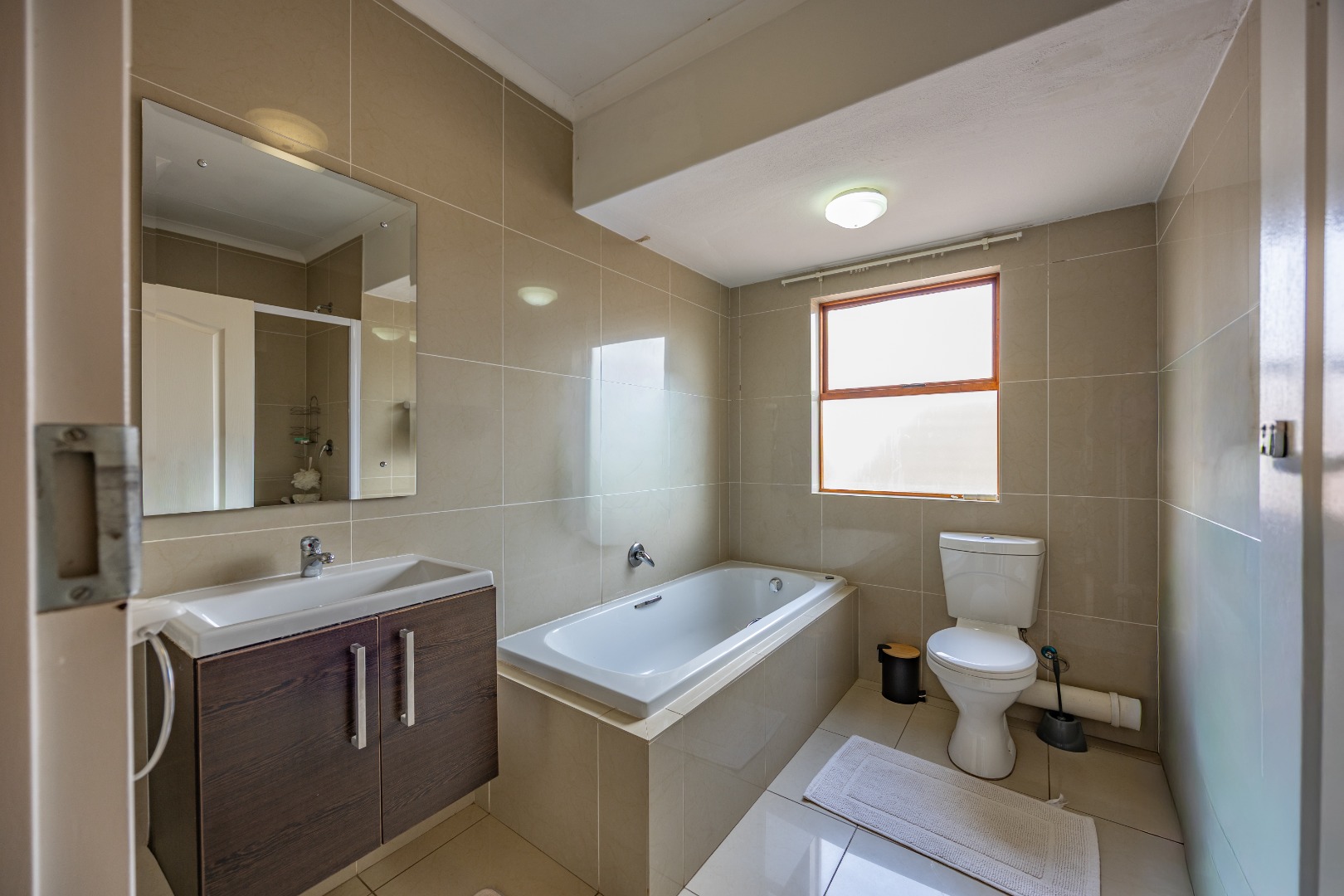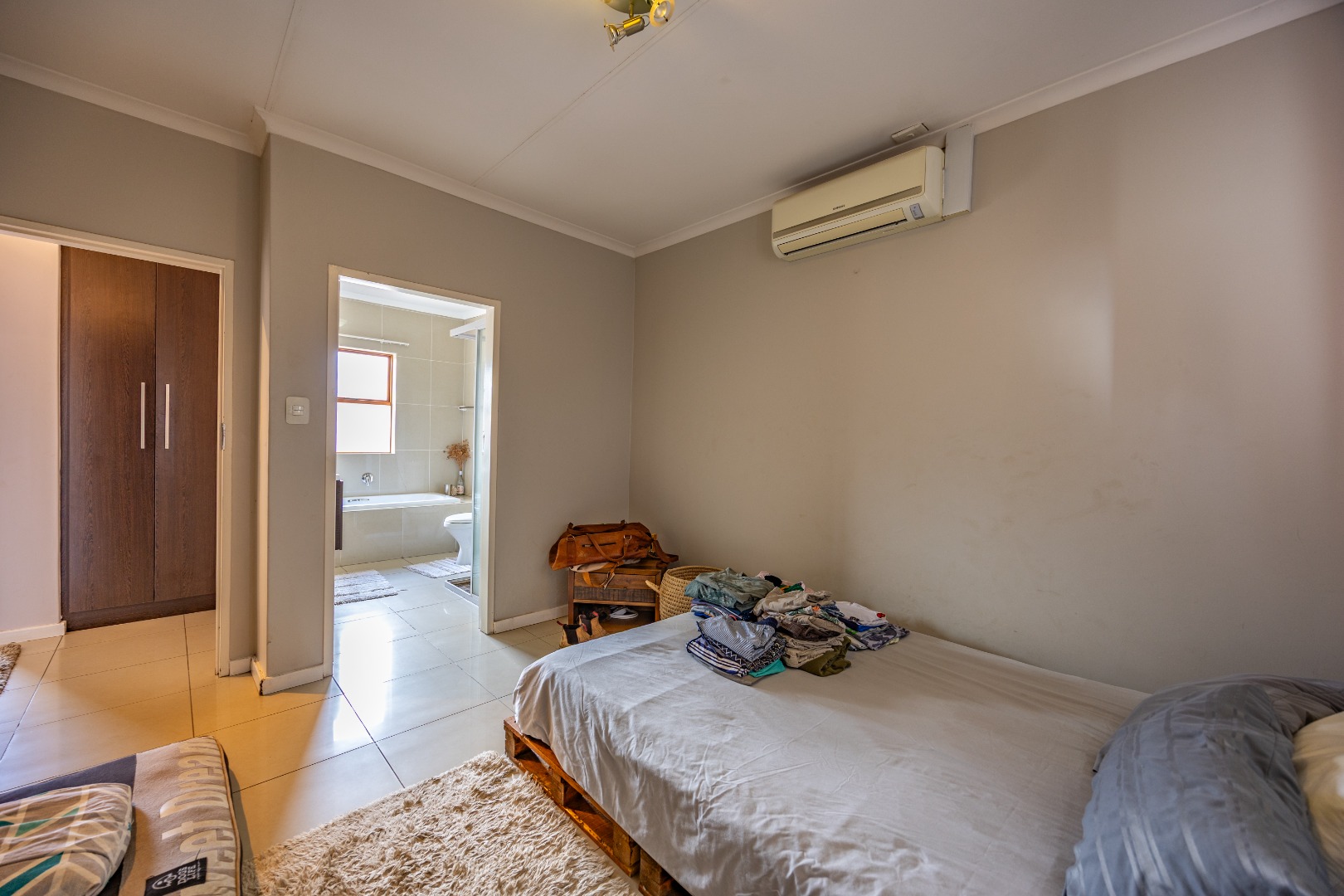 Upstairs, the main bedroom features built-in cupboards, air conditioning, and a full en-suite bathroom. The second bedroom also offers built-in cupboards and is serviced by a separate bathroom with a bath, toilet, and basin, conveniently located across the passage.
