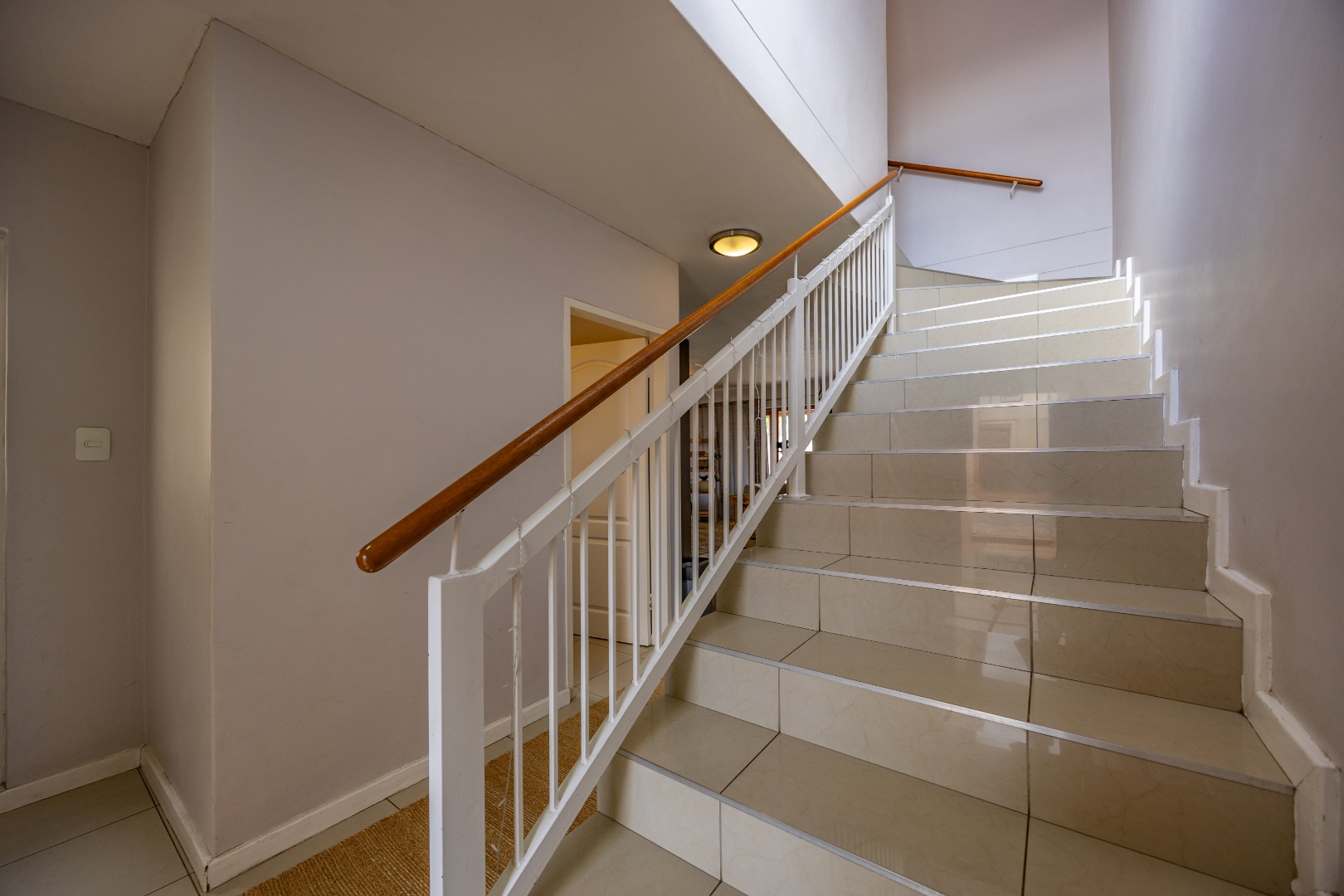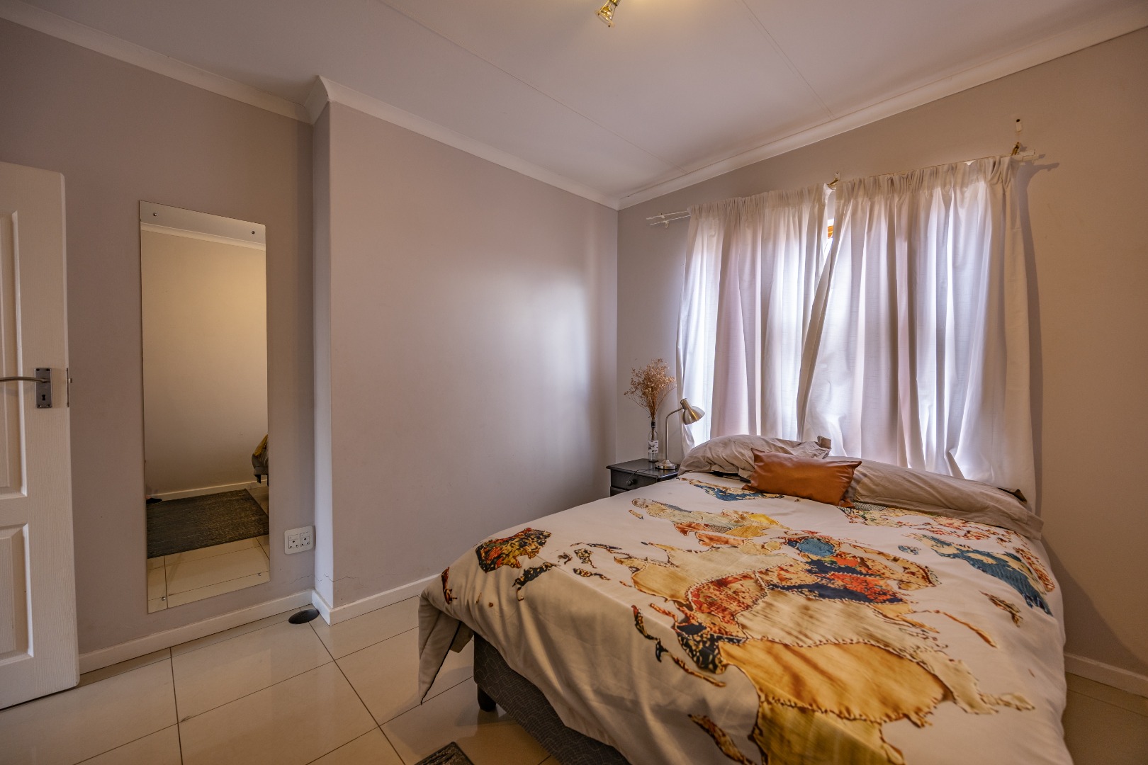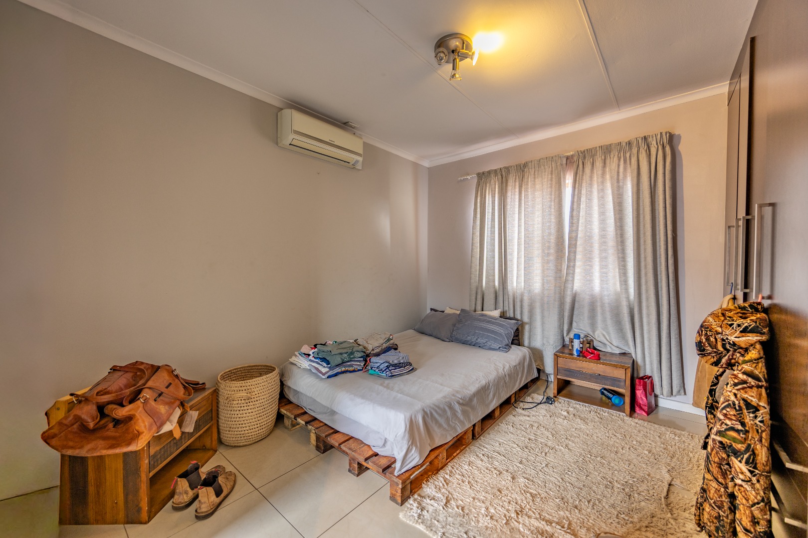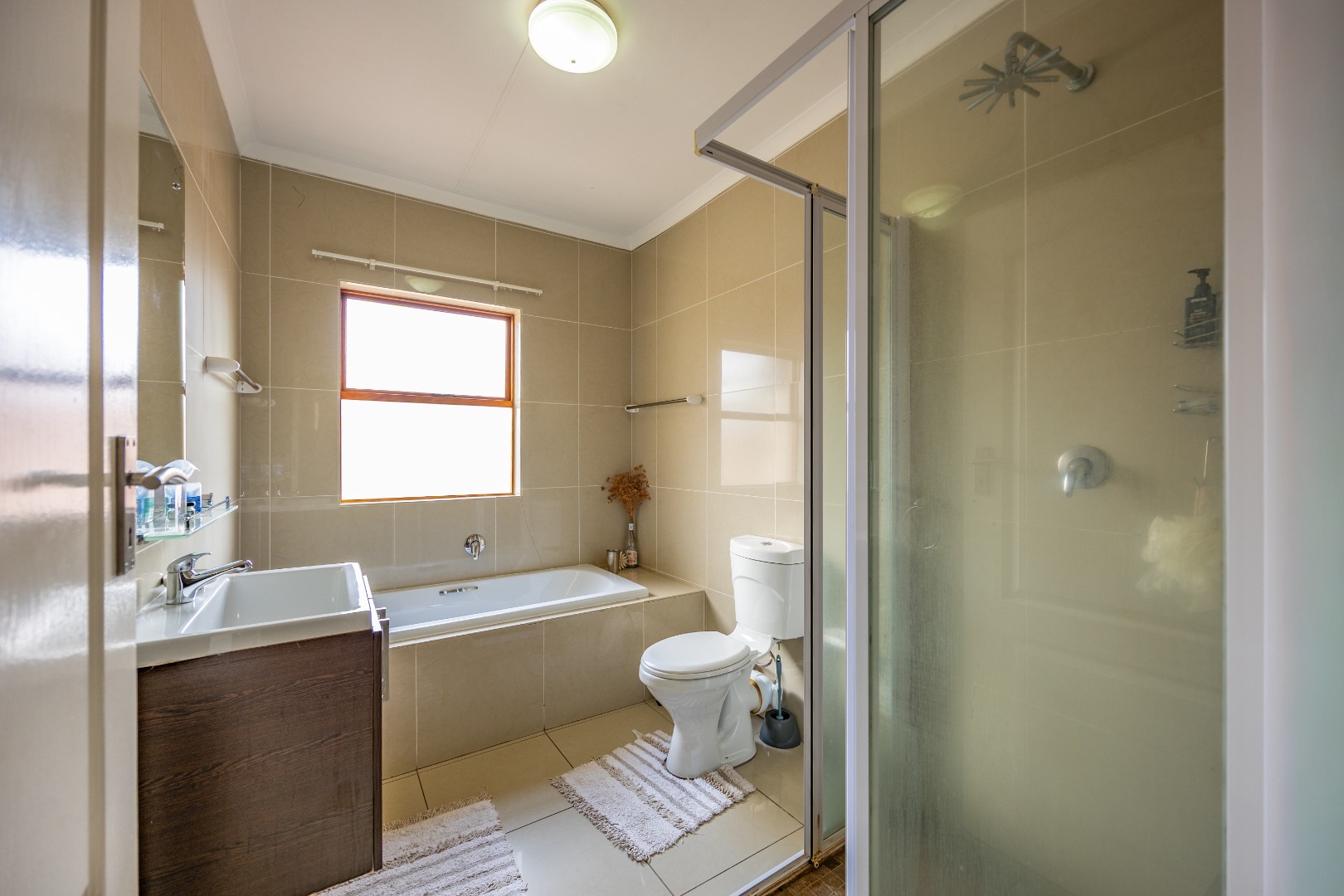 Upstairs, the main bedroom features built-in cupboards, air conditioning, and a full en-suite bathroom. The second bedroom also offers built-in cupboards and is serviced by a separate bathroom with a bath, toilet, and basin, conveniently located across the passage.