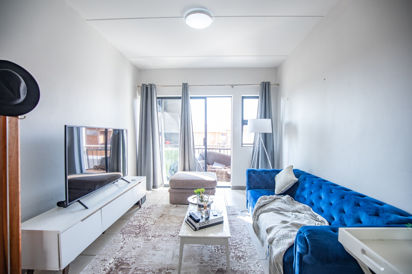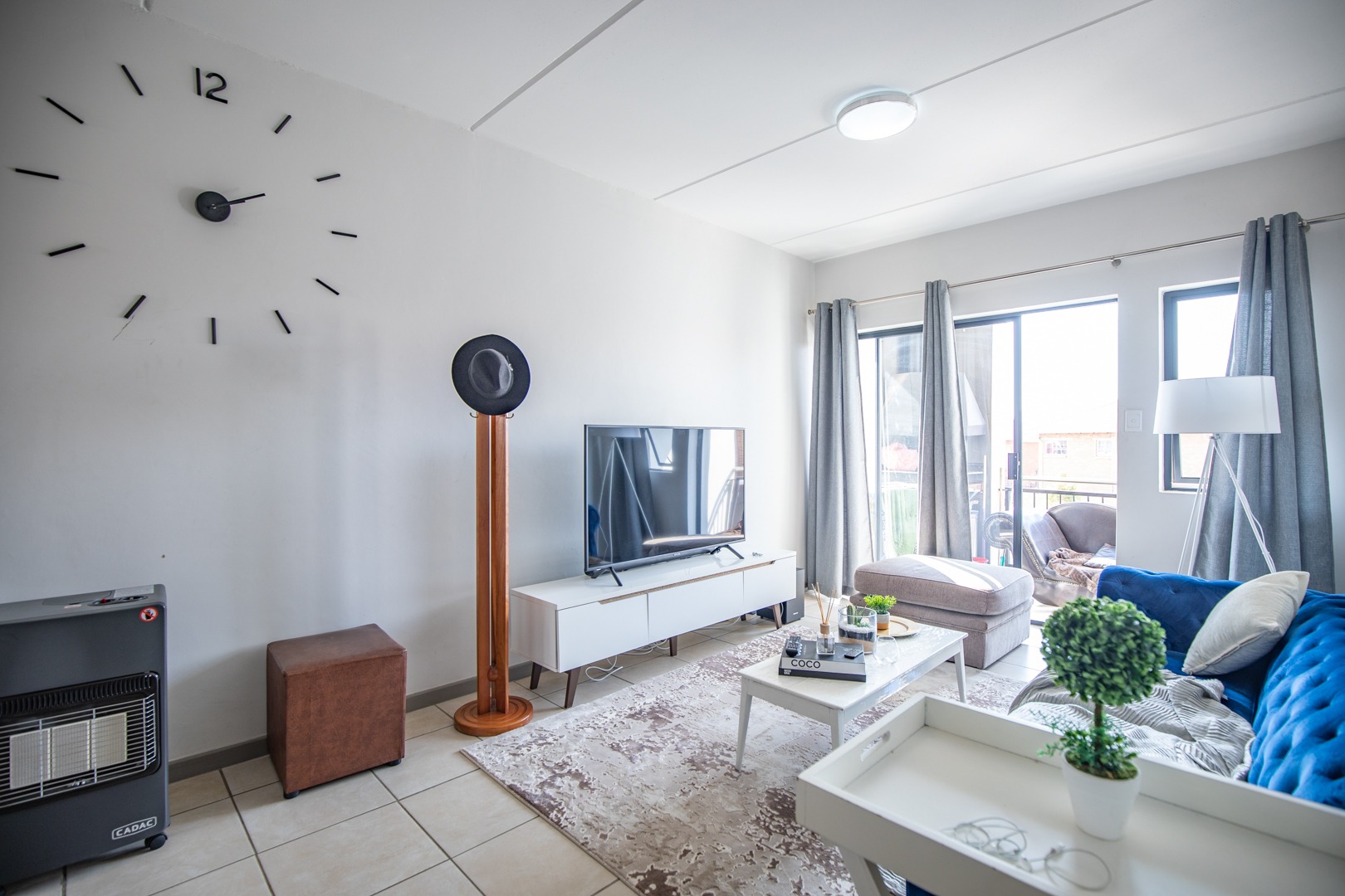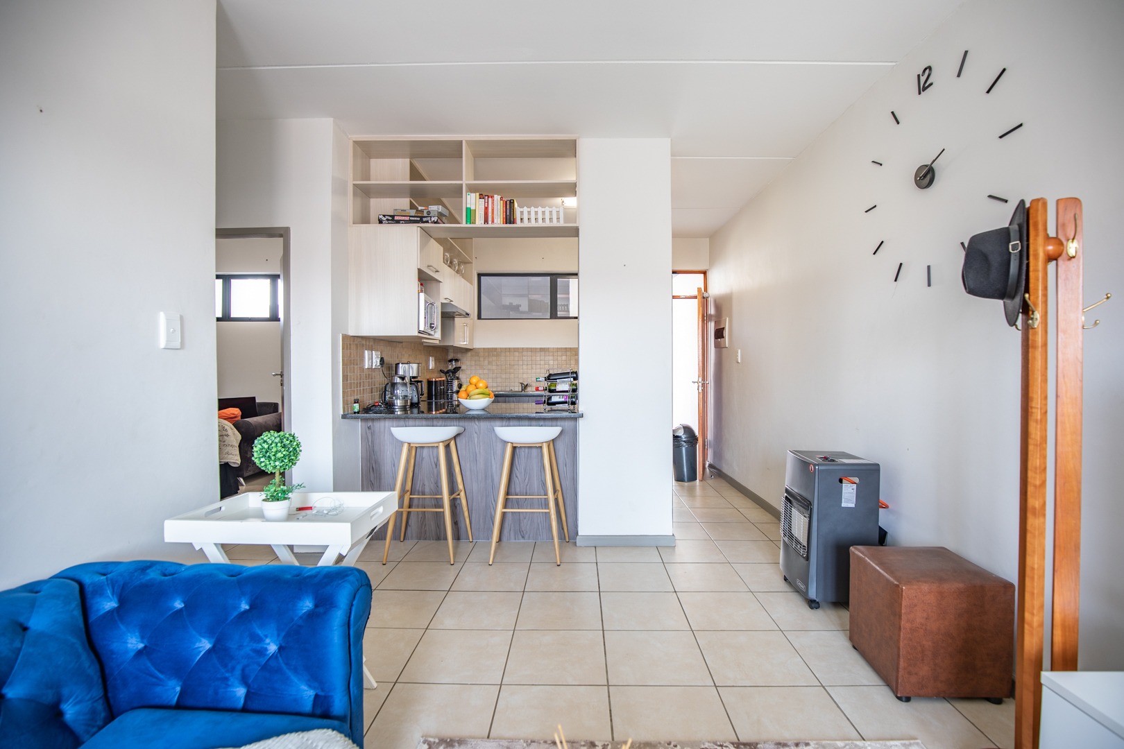 Step into a neat and tidy unit featuring a modern kitchen with ample cupboard space, a tabletop electric stove, and room for an appliance. The open-plan layout flows seamlessly into the spacious living area, which leads out to a private balcony equipped with a built-in braai—ideal for entertaining.