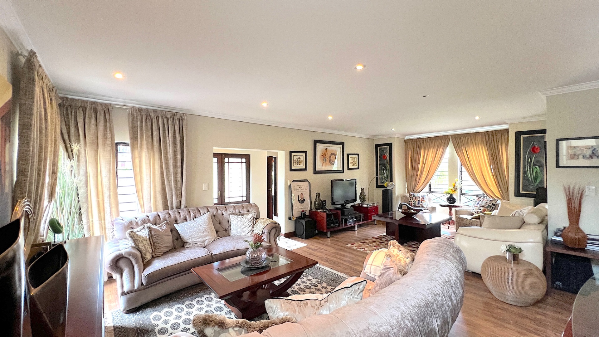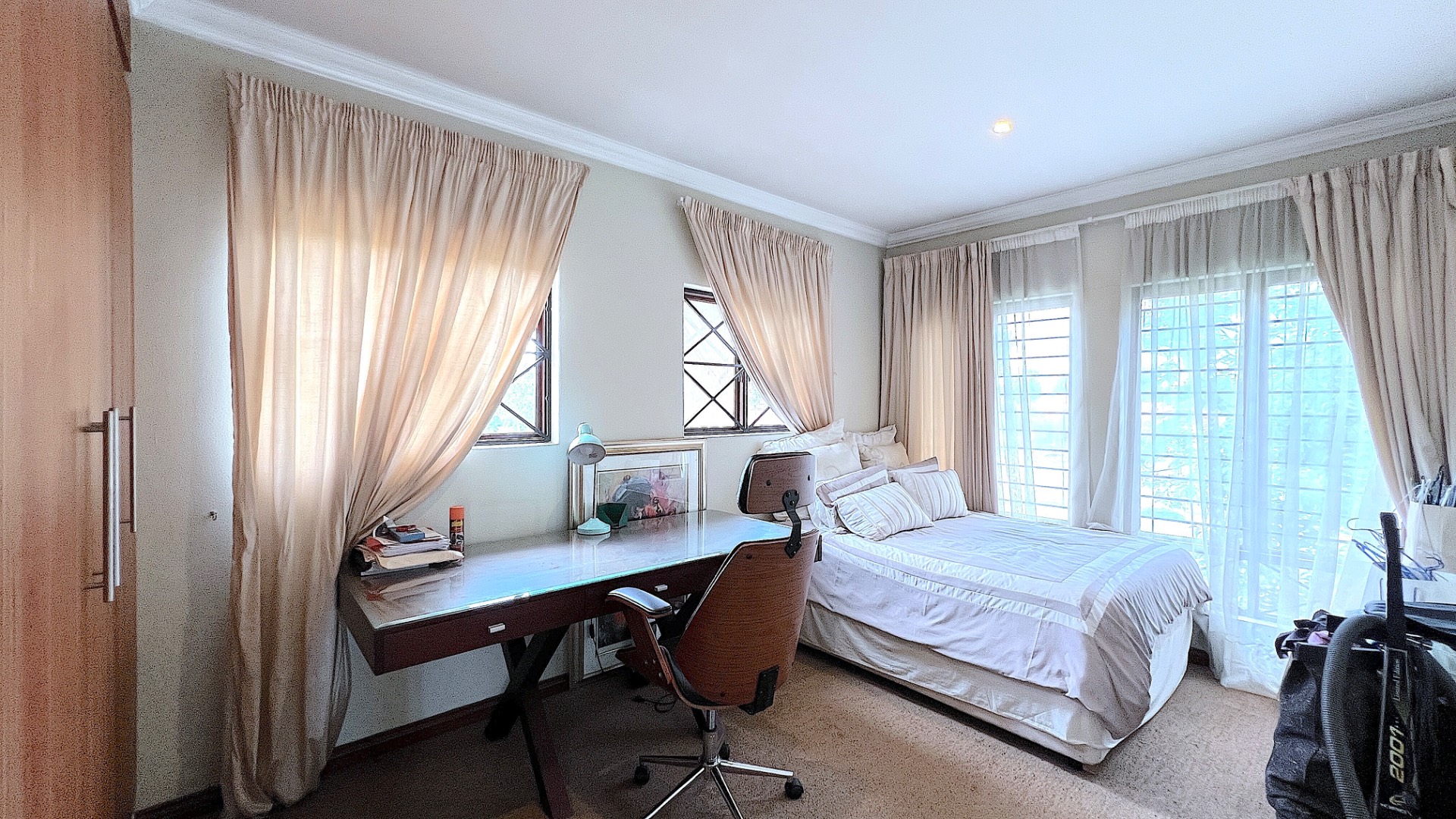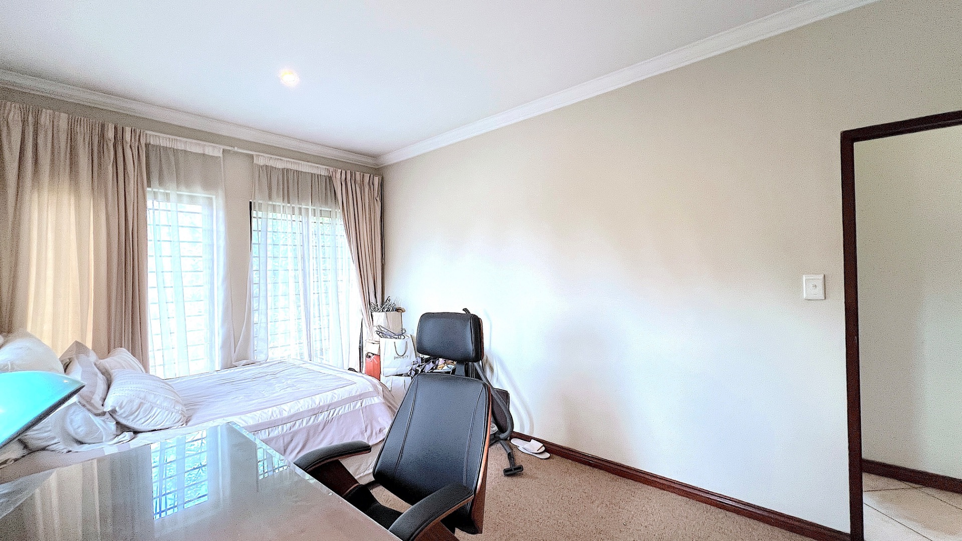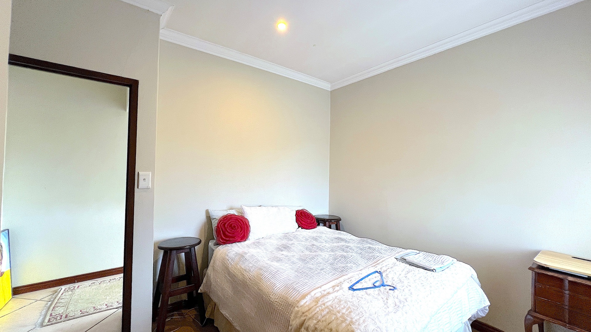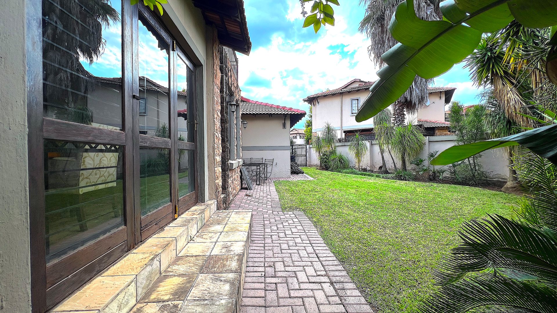 Outdoor living is catered for with a private patio and a well-kept garden, providing a tranquil space for enjoyment. The property includes a double garage and five additional parking spaces, offering generous parking solutions. As part of a secure estate and gated community in a cul-de-sac, residents benefit from 24-hour security, security posts, access gates, and burglar bars, ensuring peace of mind. Fibre connectivity is also available.