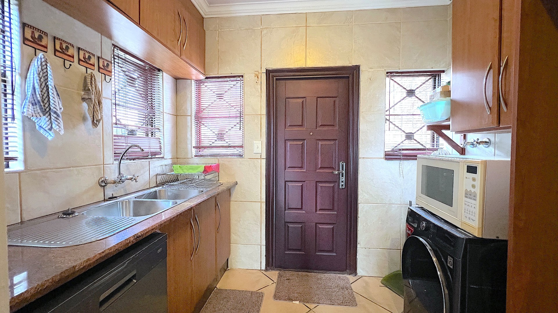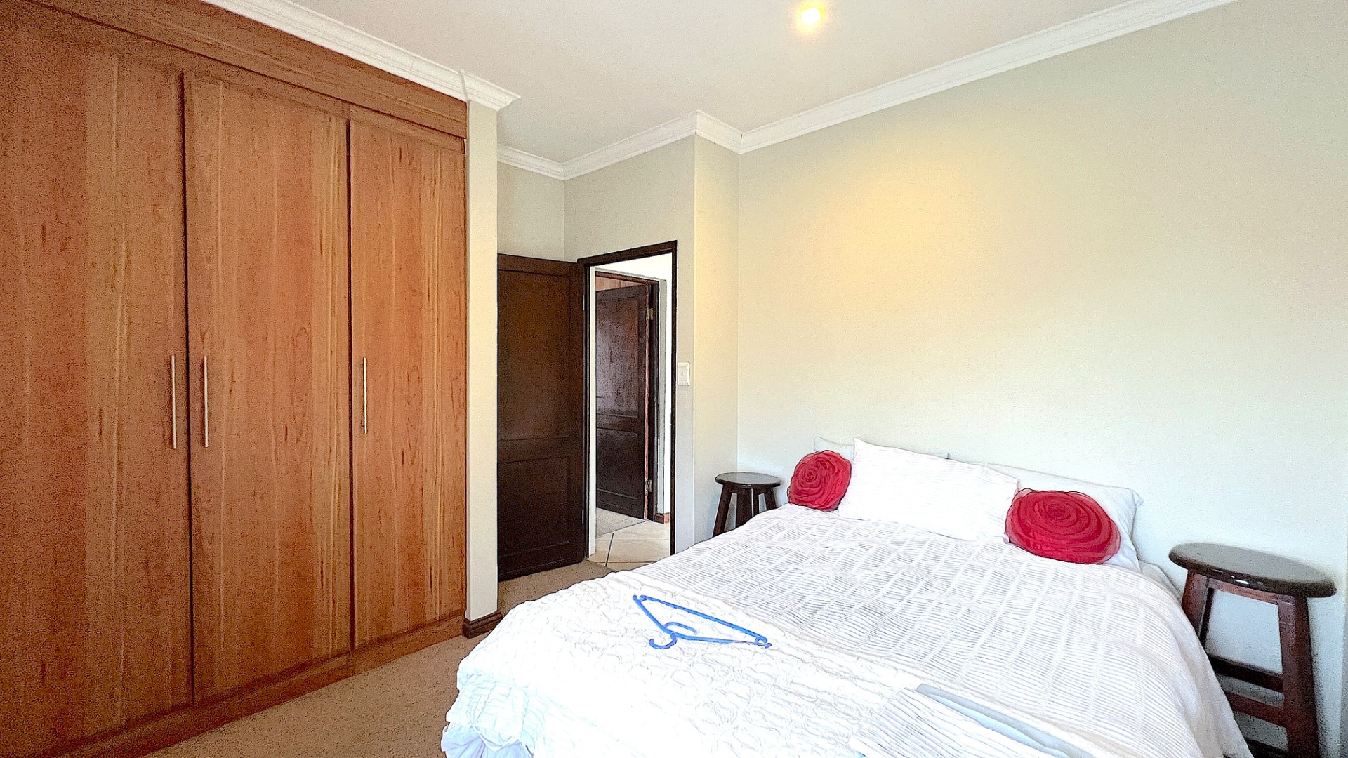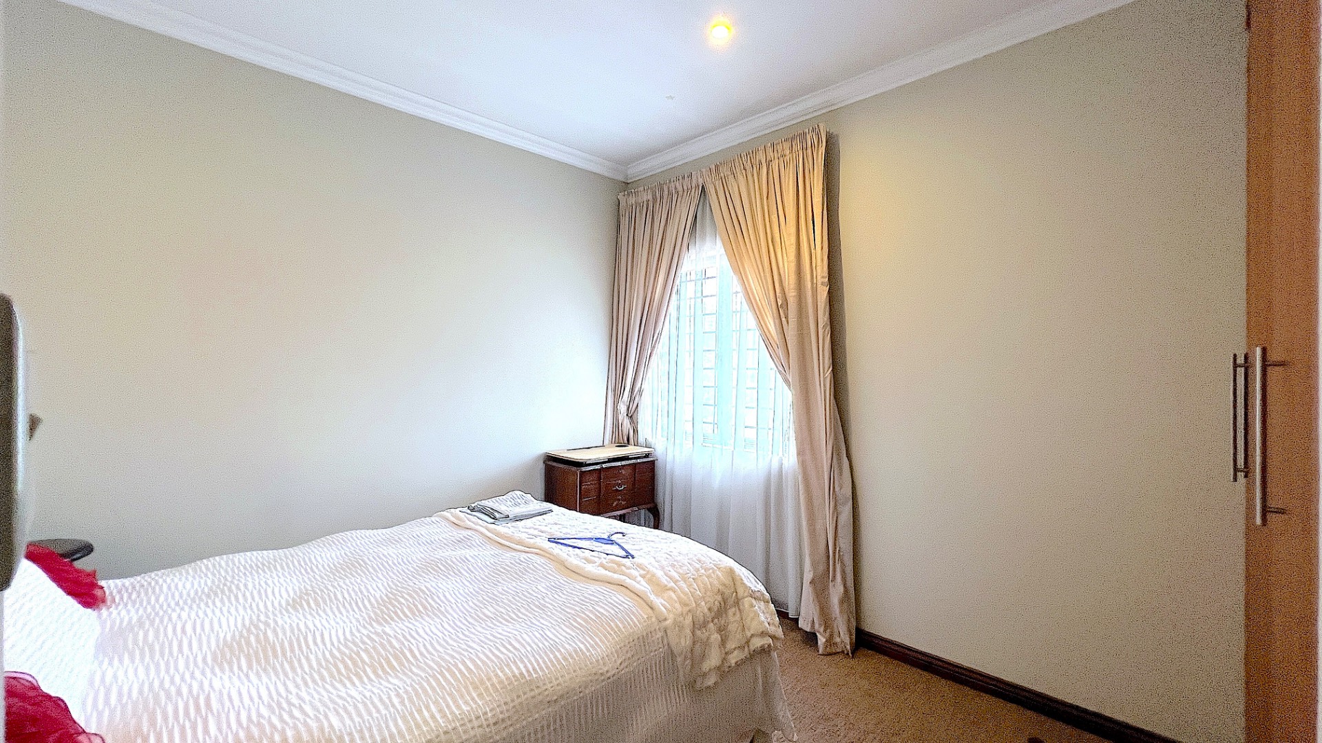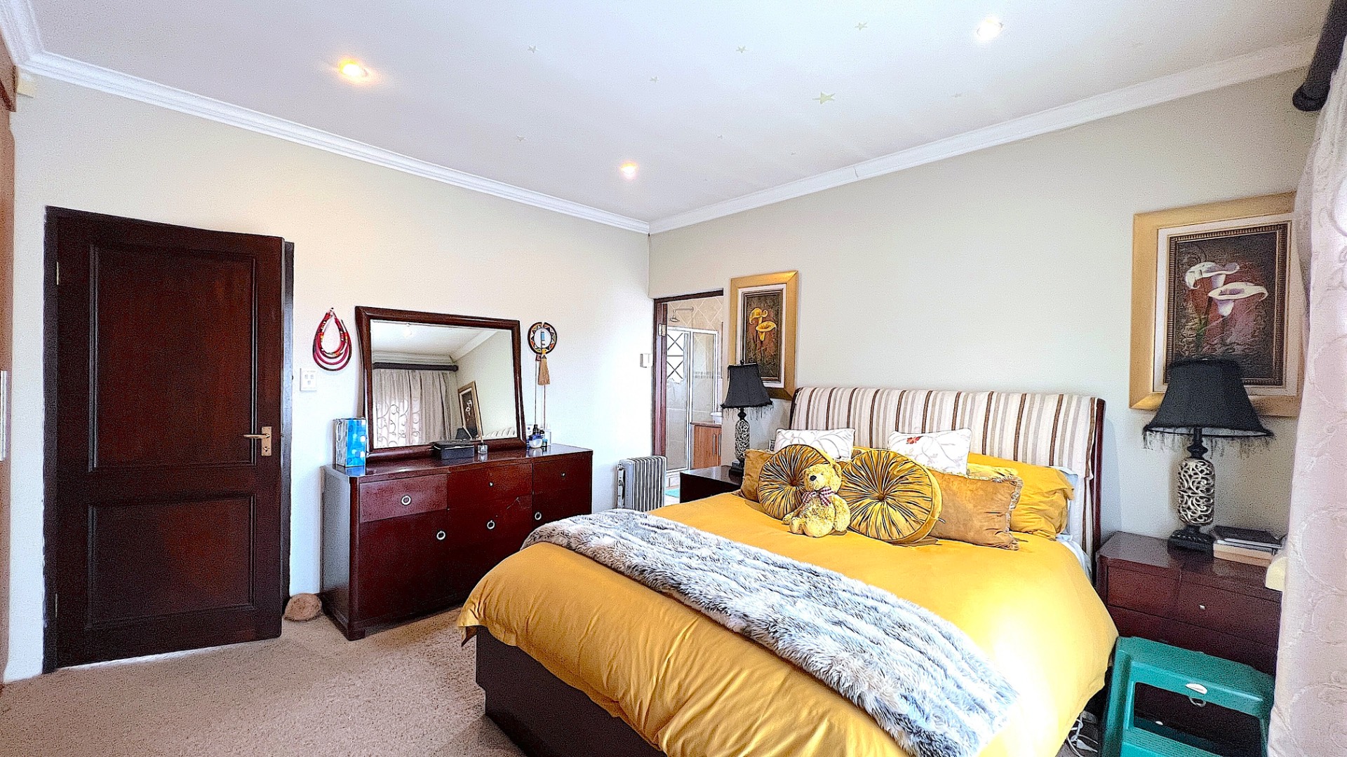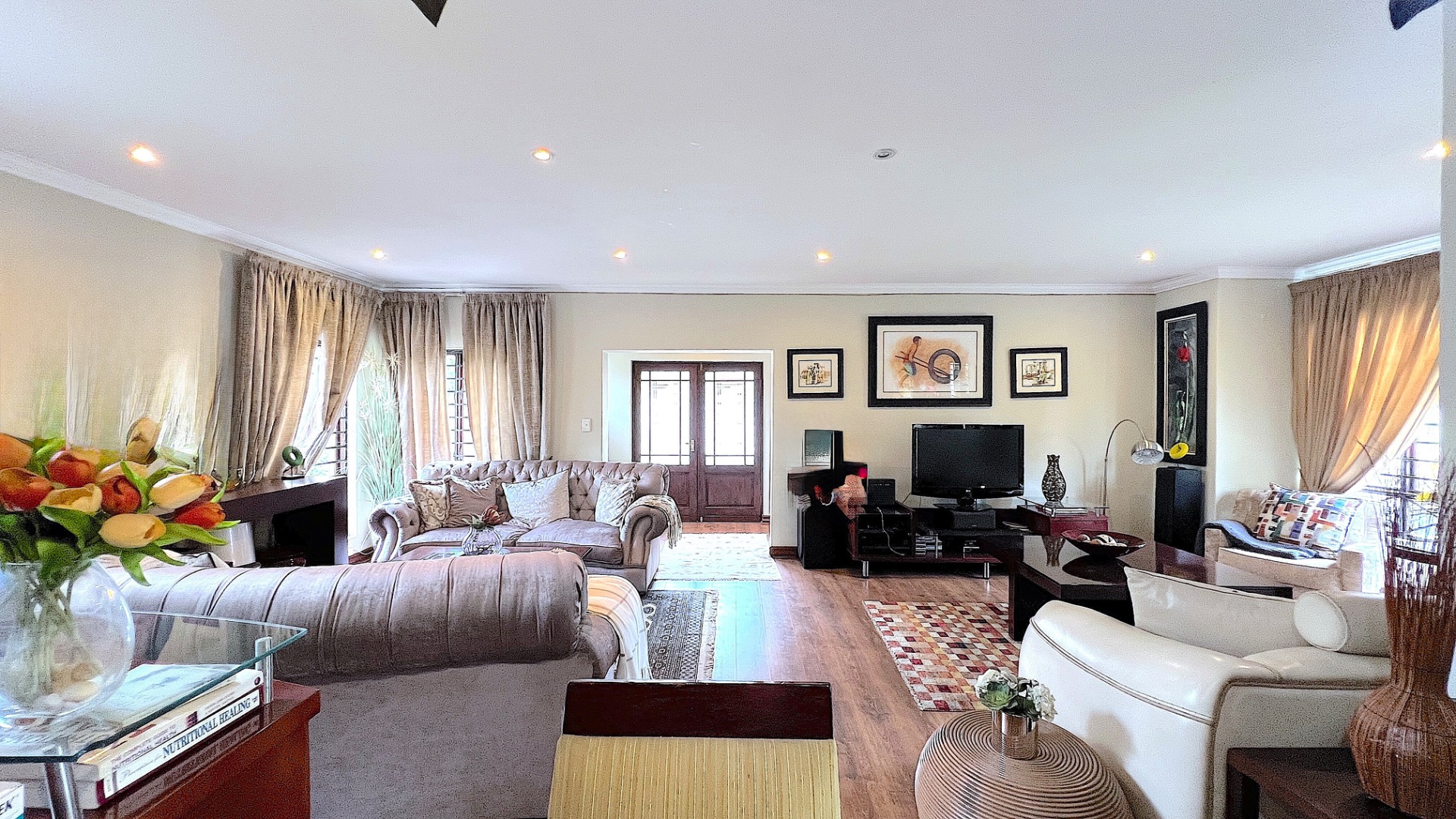 Outdoor living is catered for with a private patio and a well-kept garden, providing a tranquil space for enjoyment. The property includes a double garage and five additional parking spaces, offering generous parking solutions. As part of a secure estate and gated community in a cul-de-sac, residents benefit from 24-hour security, security posts, access gates, and burglar bars, ensuring peace of mind. Fibre connectivity is also available.