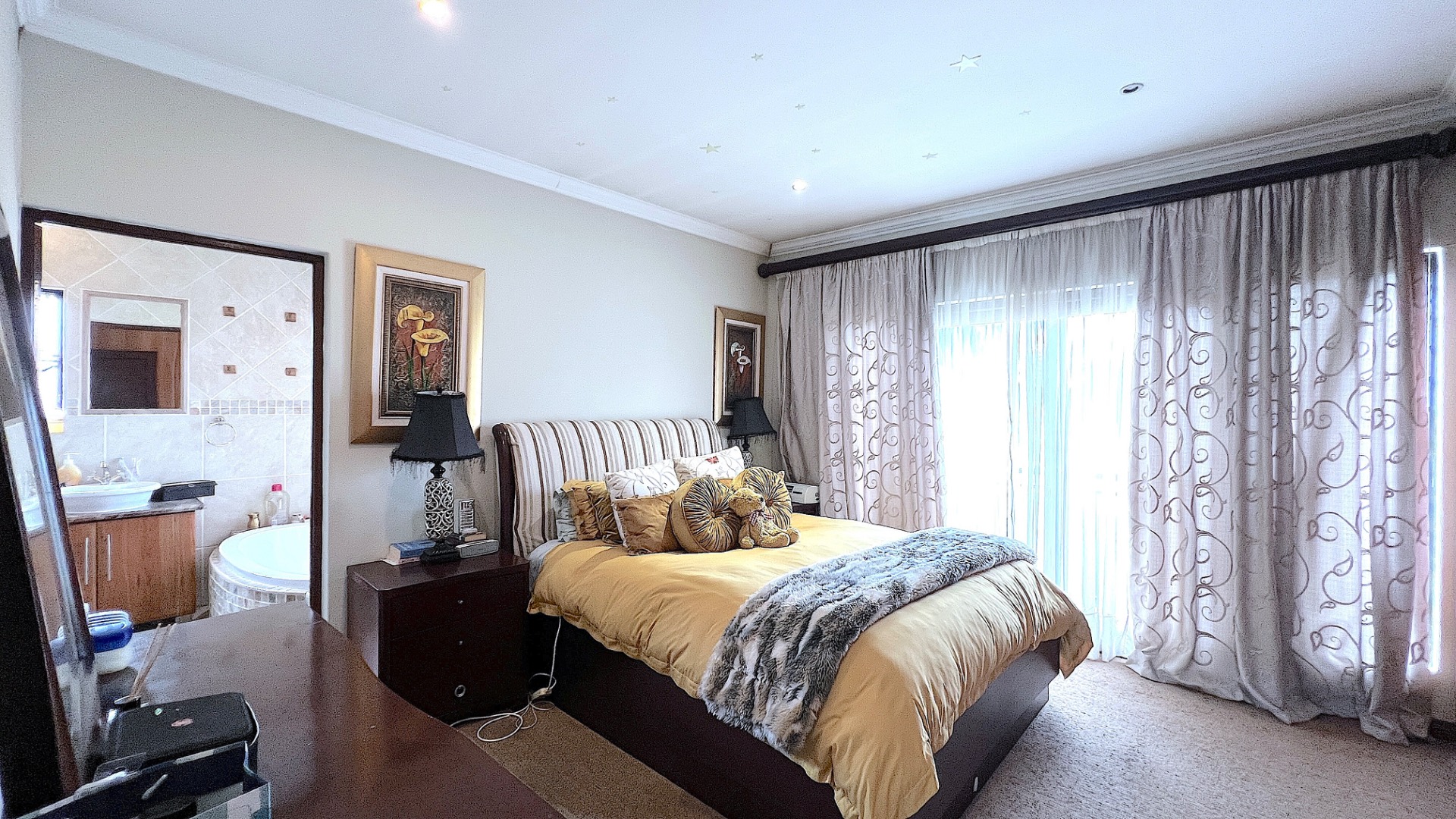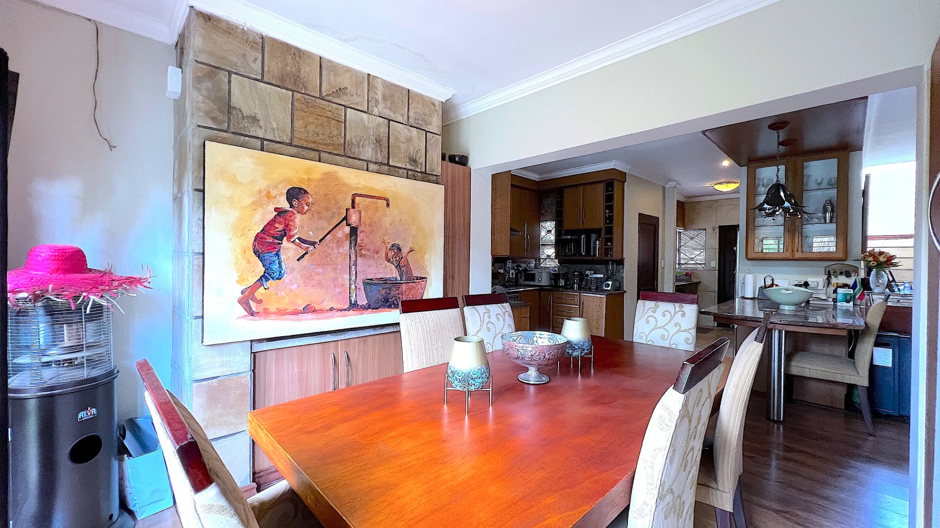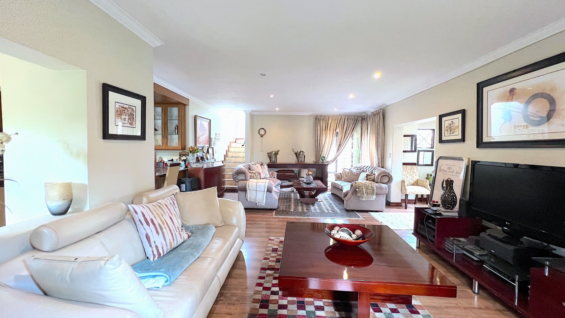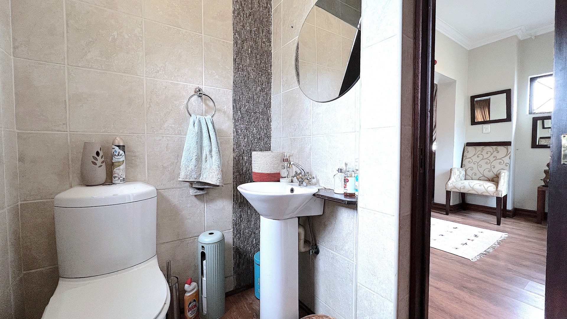 Outdoor living is catered for with a private patio and a well-kept garden, providing a tranquil space for enjoyment. The property includes a double garage and five additional parking spaces, offering generous parking solutions. As part of a secure estate and gated community in a cul-de-sac, residents benefit from 24-hour security, security posts, access gates, and burglar bars, ensuring peace of mind. Fibre connectivity is also available.
