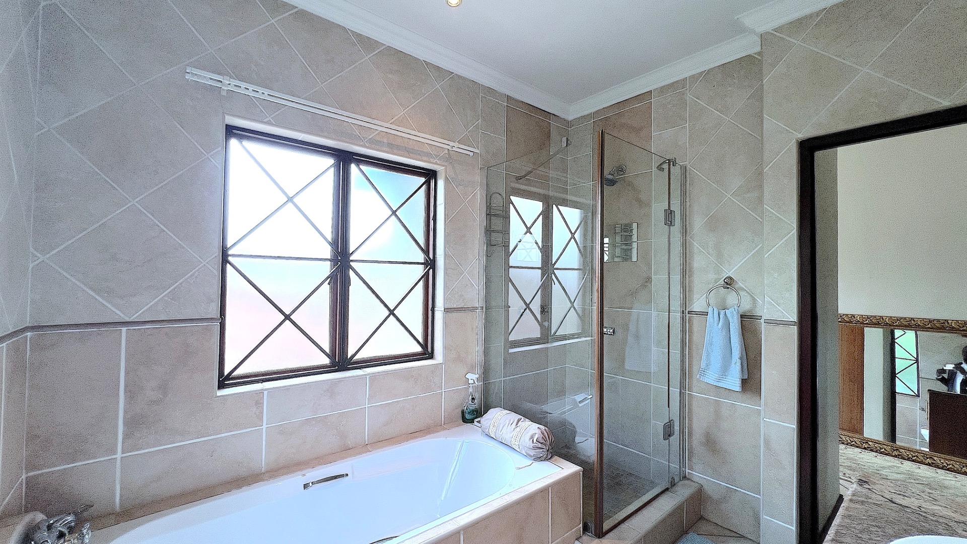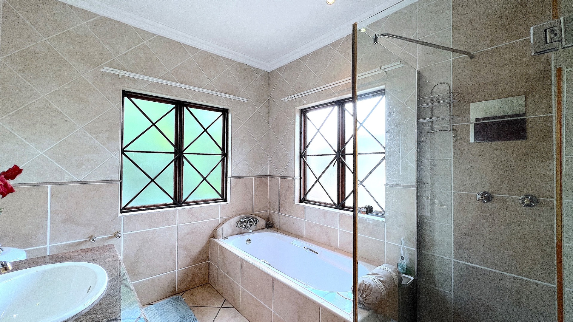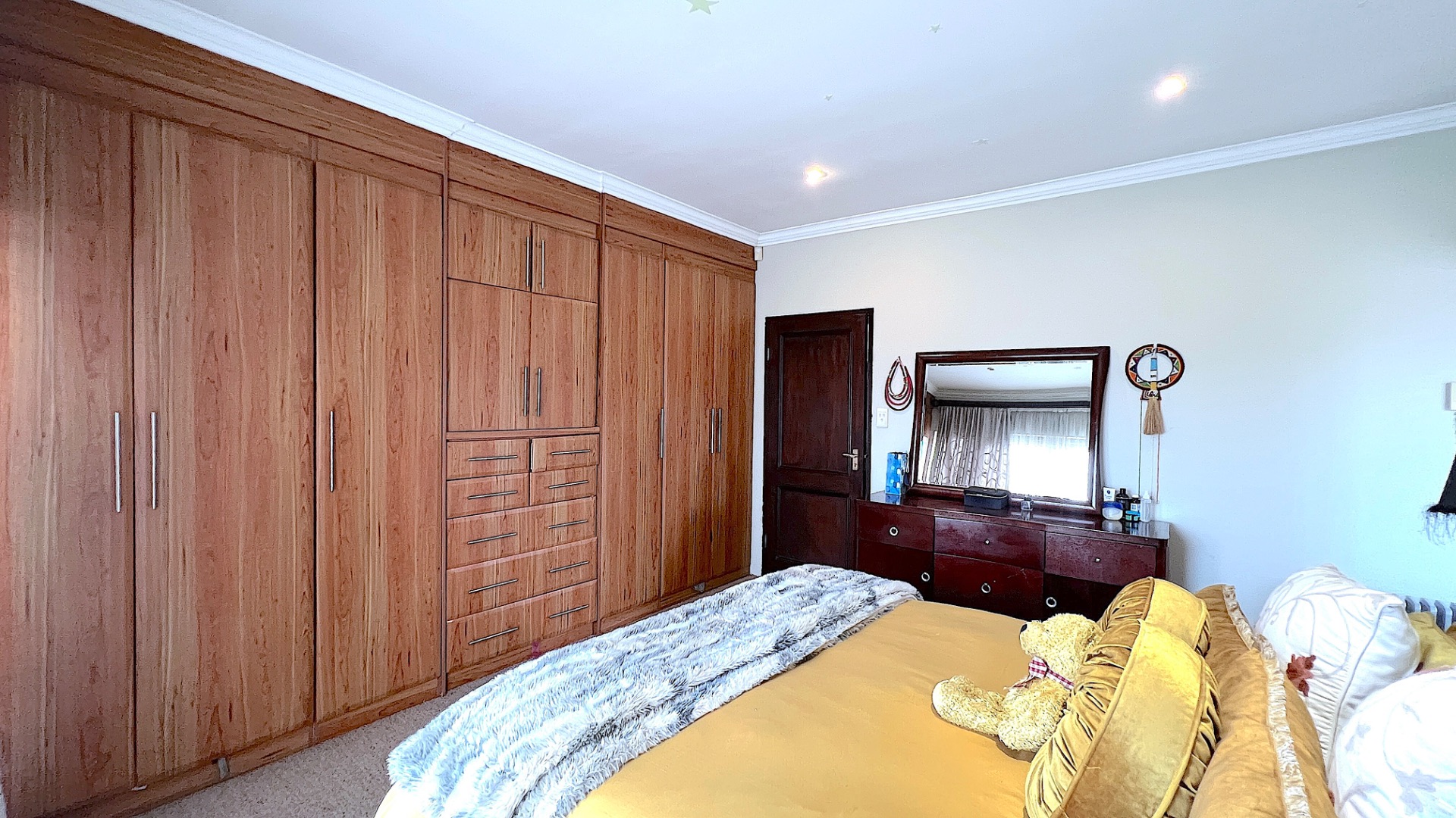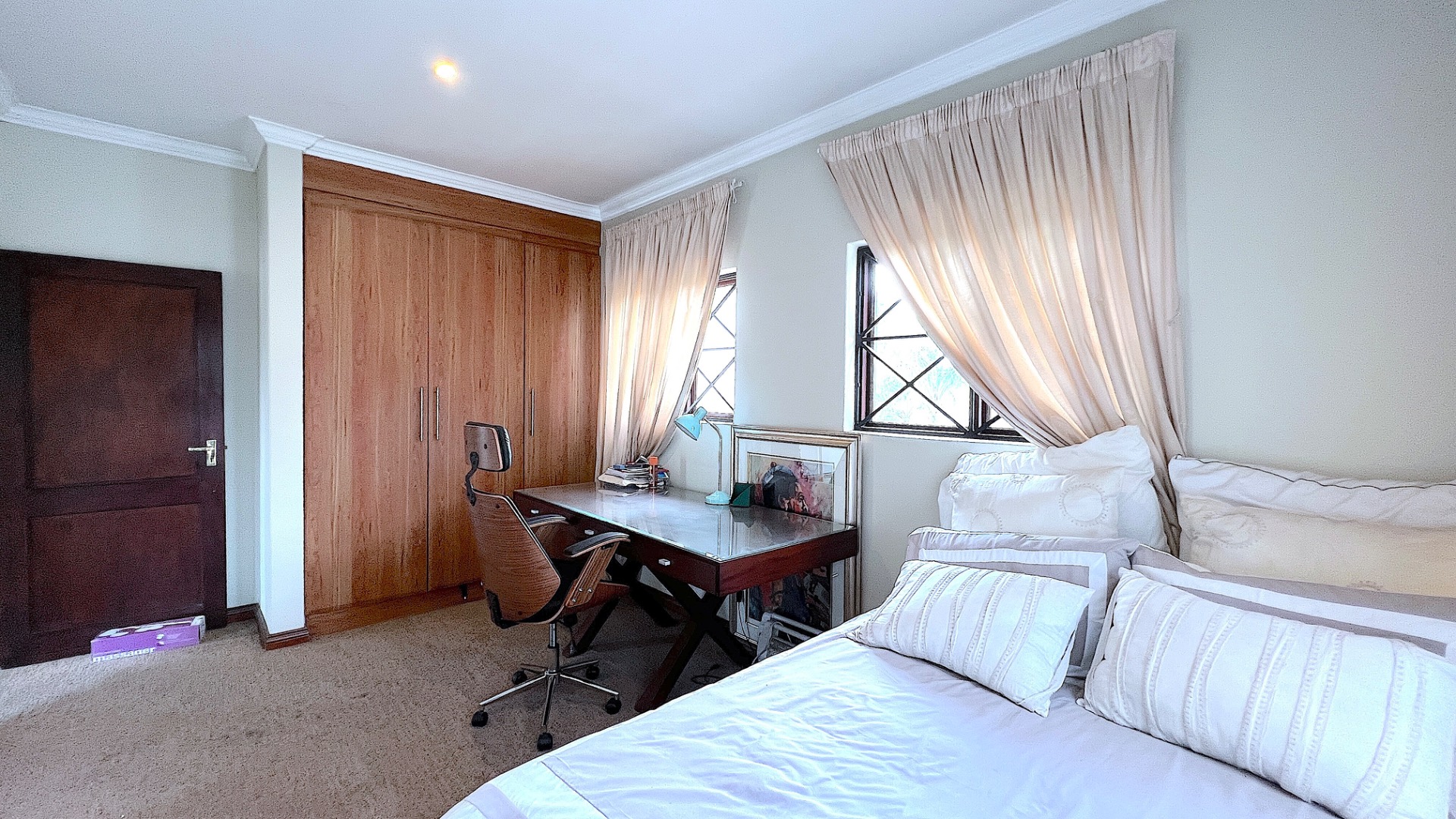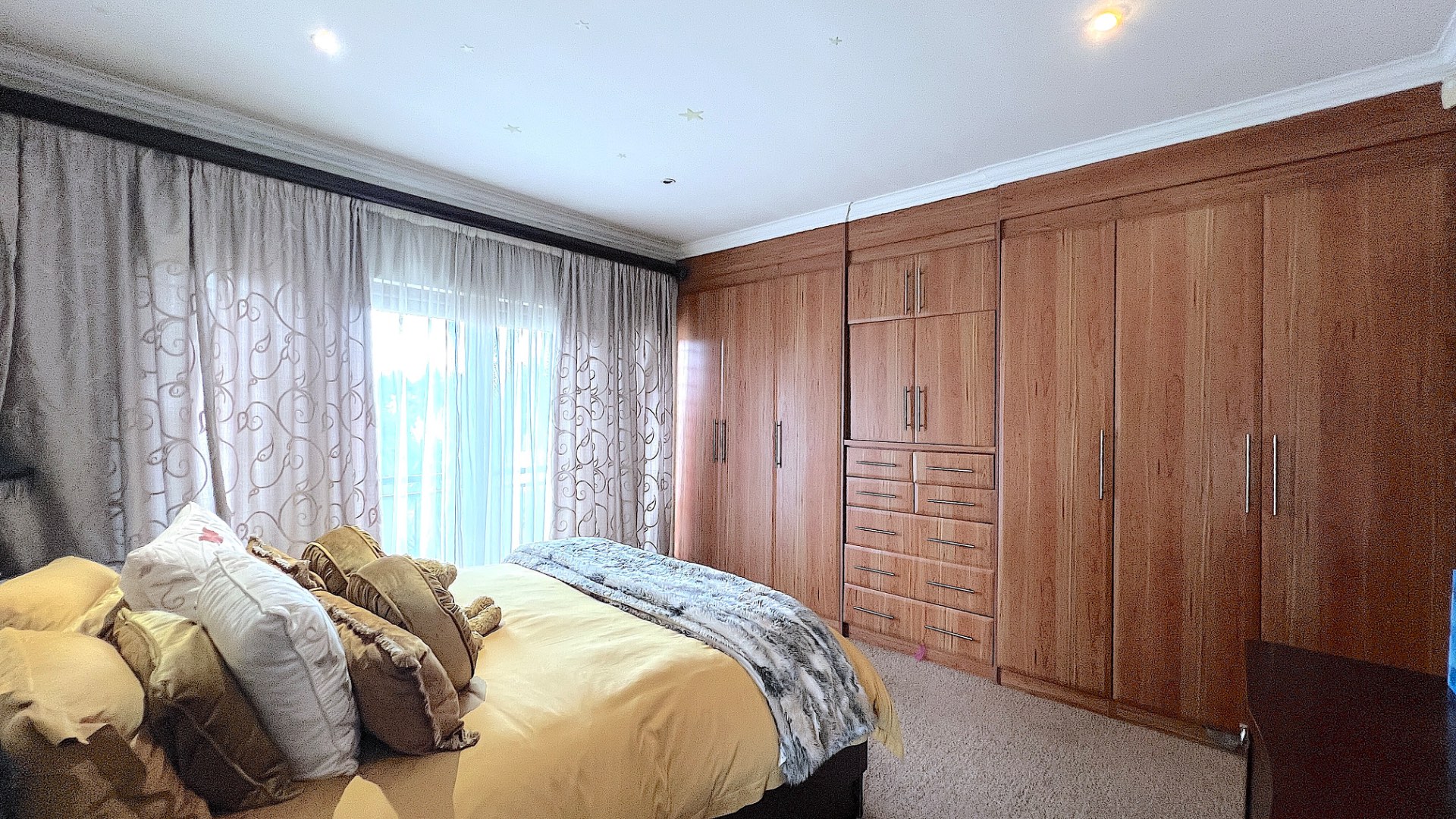Outdoor living is catered for with a private patio and a well-kept garden, providing a tranquil space for enjoyment. The property includes a double garage and five additional parking spaces, offering generous parking solutions. As part of a secure estate and gated community in a cul-de-sac, residents benefit from 24-hour security, security posts, access gates, and burglar bars, ensuring peace of mind. Fibre connectivity is also available.