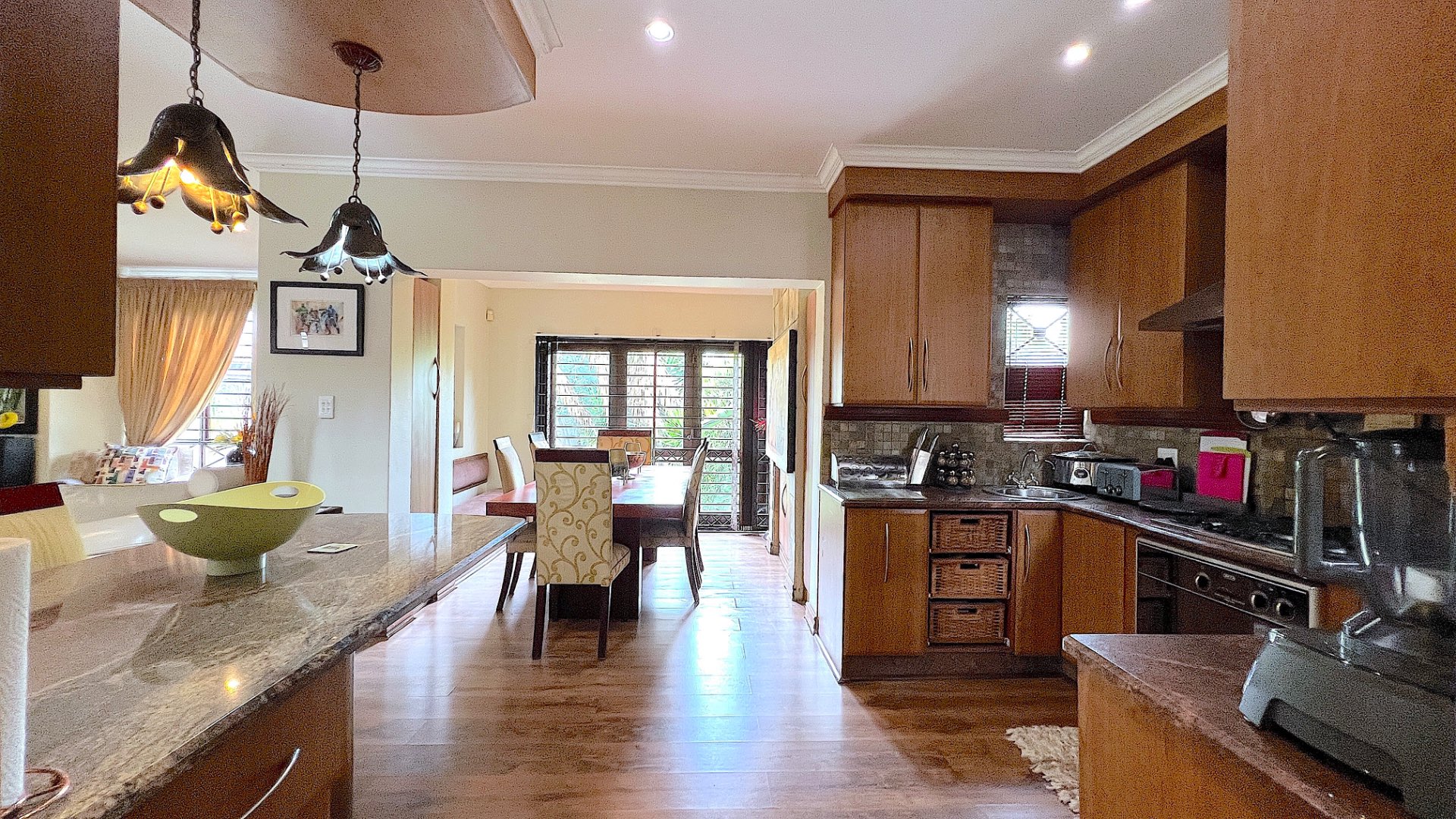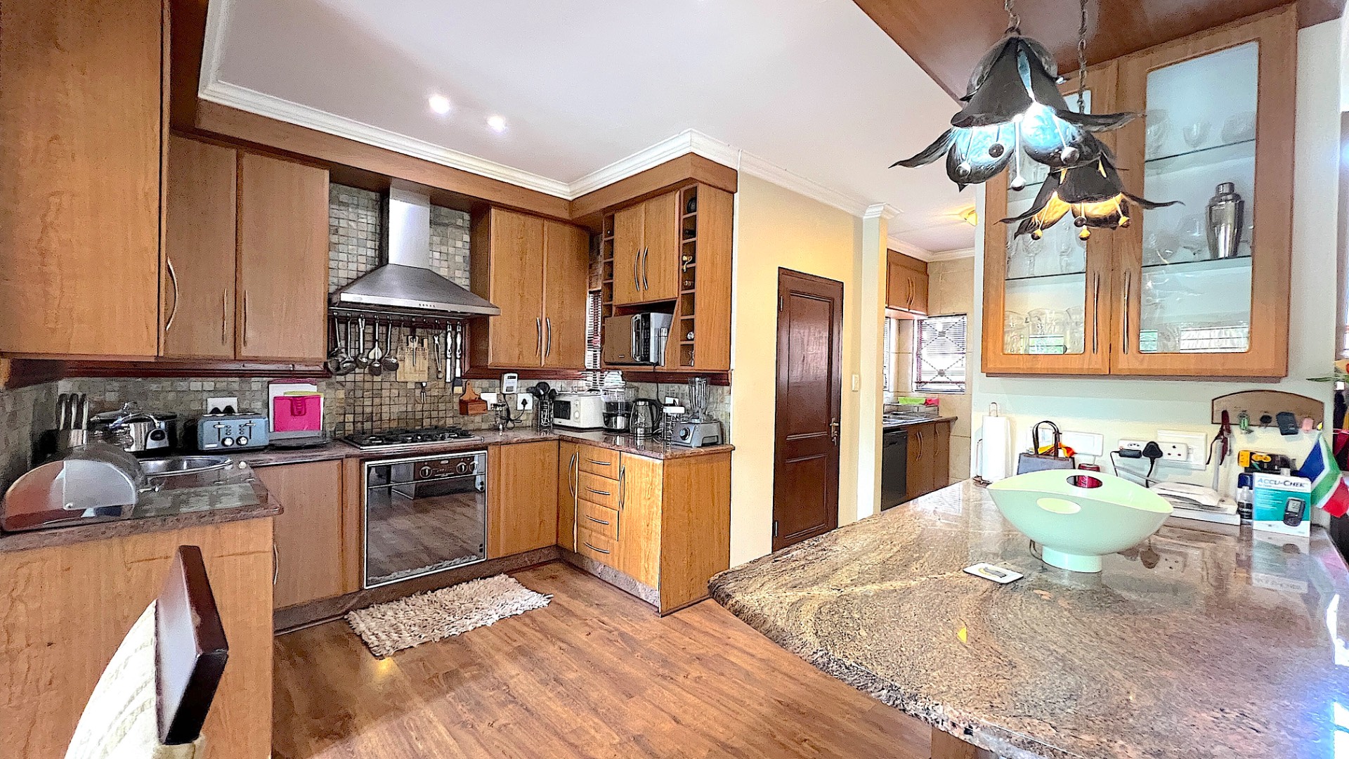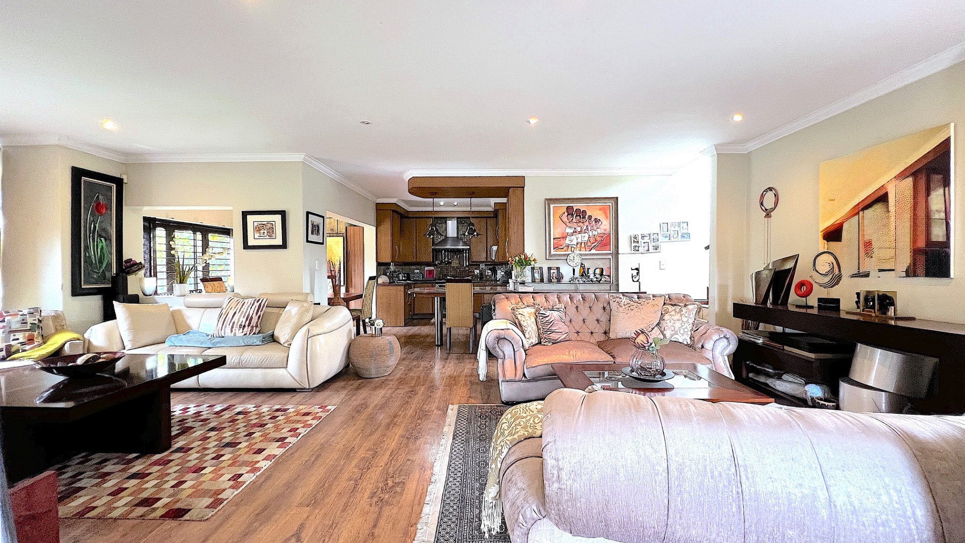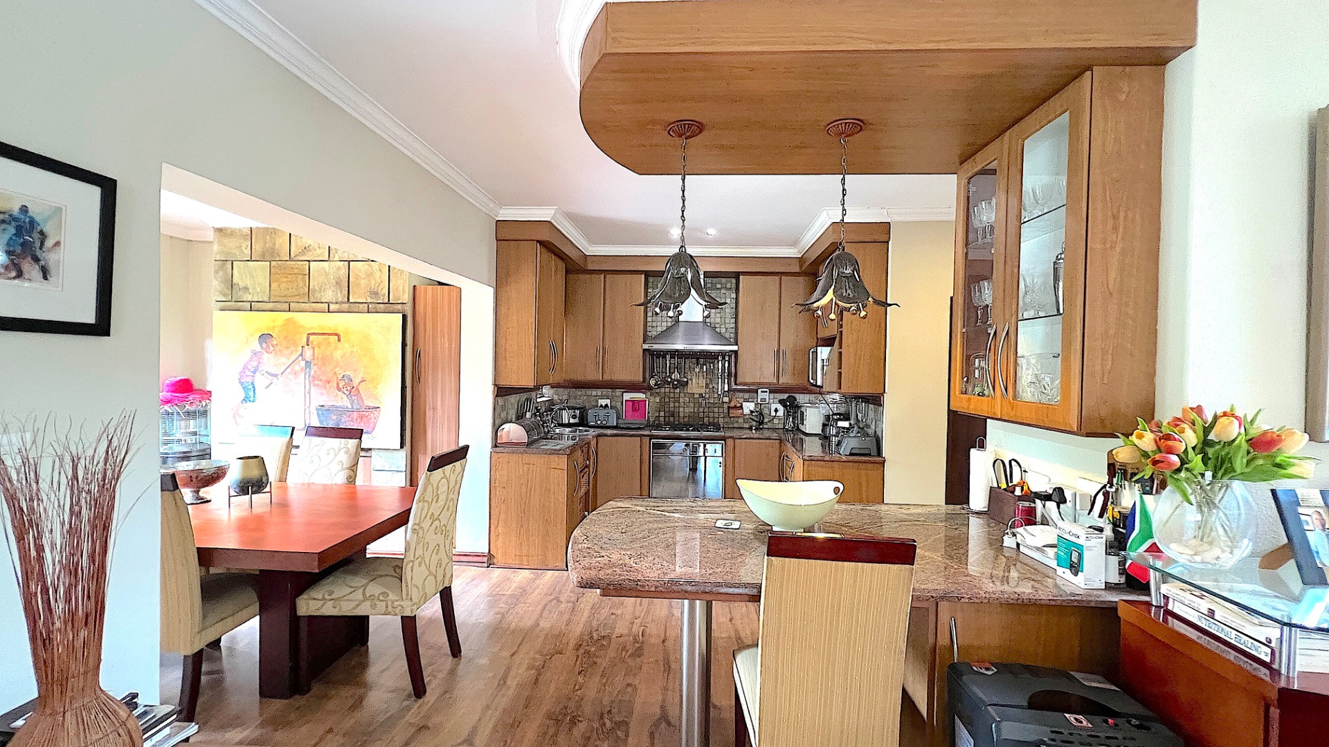 Step inside to discover a spacious open-plan layout featuring warm wood flooring, crown molding, and ample recessed lighting. The versatile living areas provide multiple seating zones, perfect for both relaxation and entertaining. The modern kitchen boasts extensive wooden cabinetry, granite countertops, a gas hob, built-in oven, and a practical island, complemented by a pantry for additional storage.