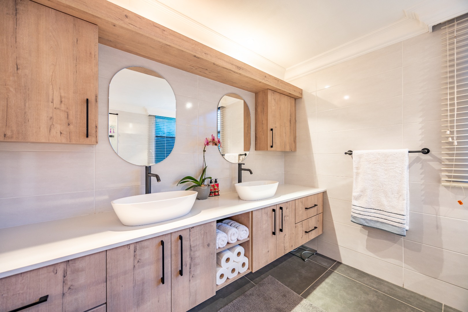 Aluminium window frames, custom blinds, linen cupboard, 2 security gates, alarm system with beams