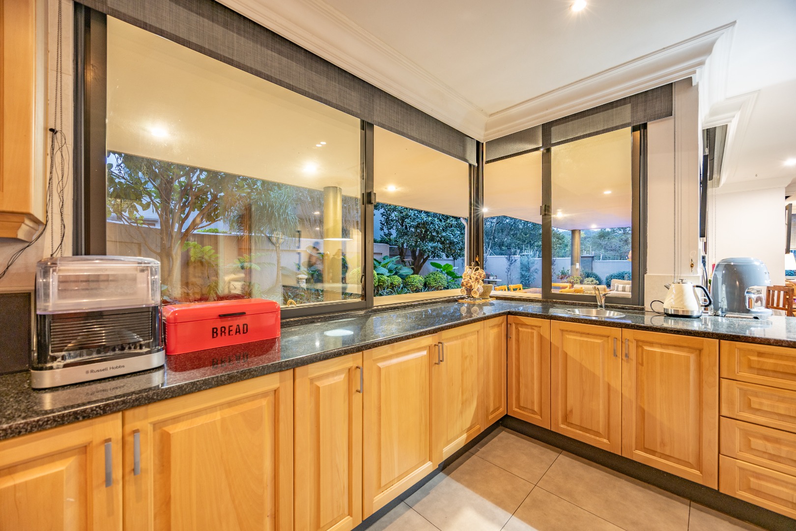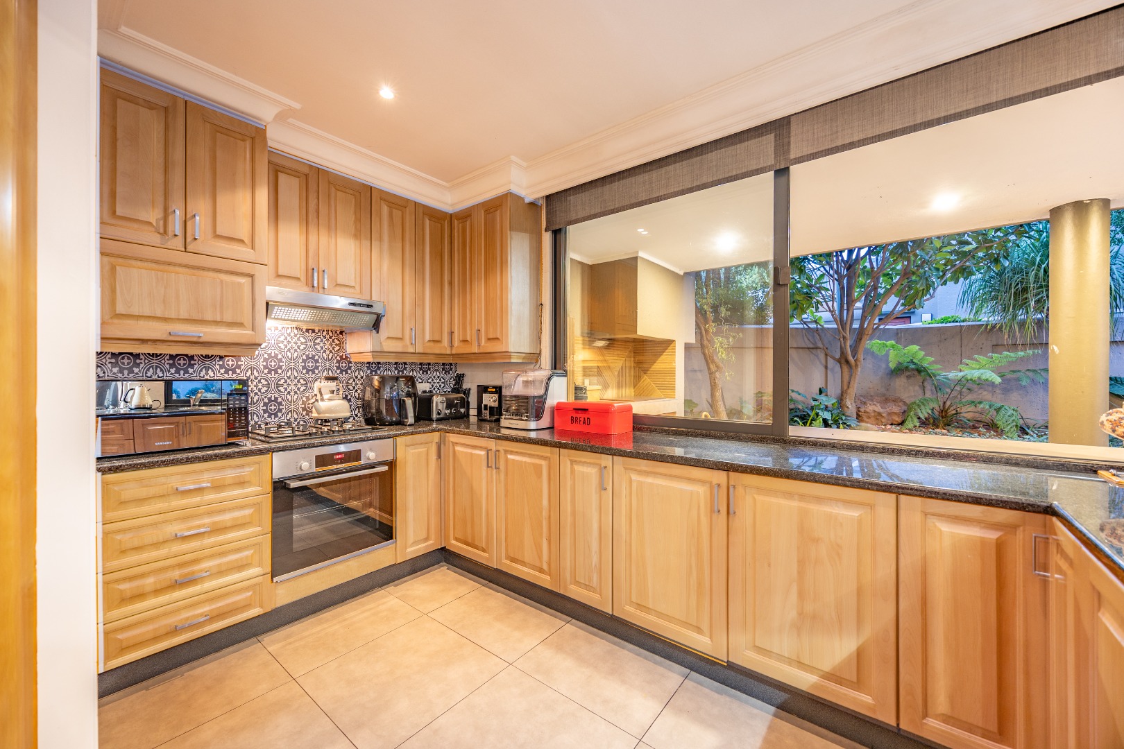 Designer kitchen with Bosch Gas Stove and Electric Oven, granite tops, breakfast-nook, pantry, and separate scullery and laundry
