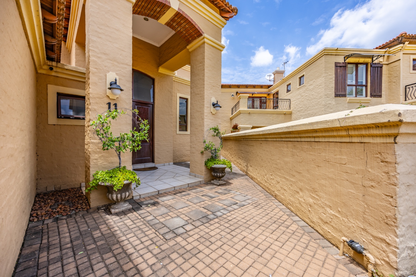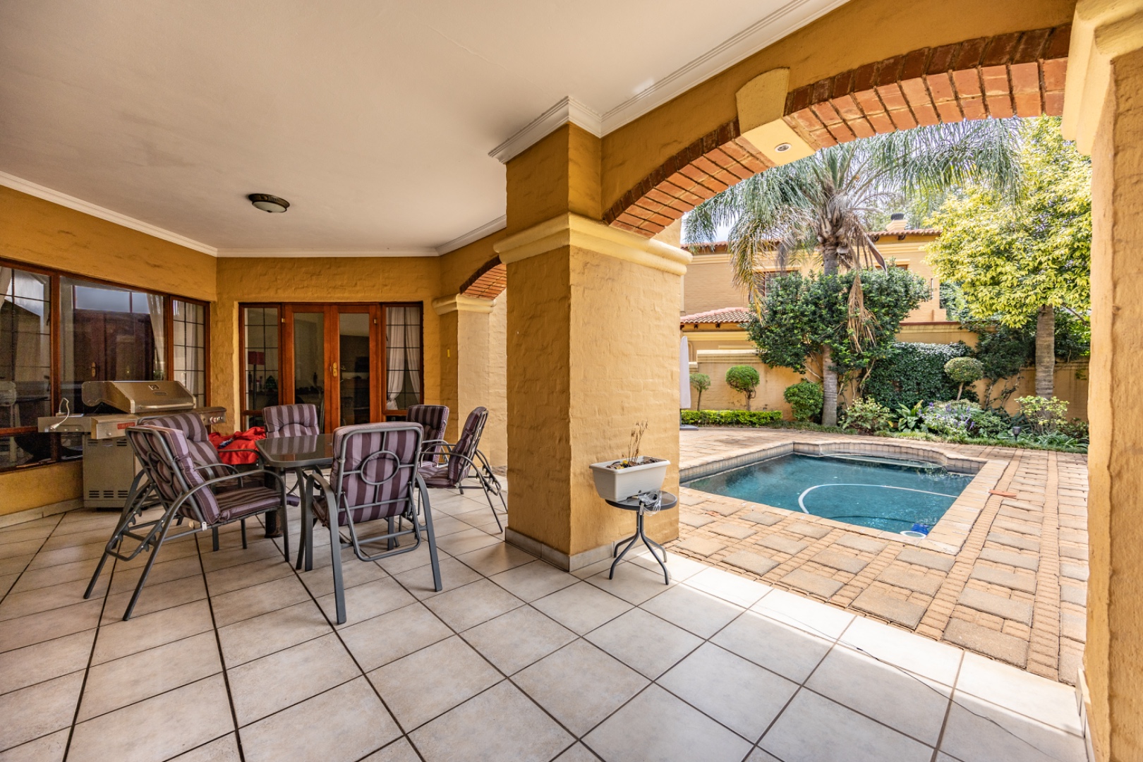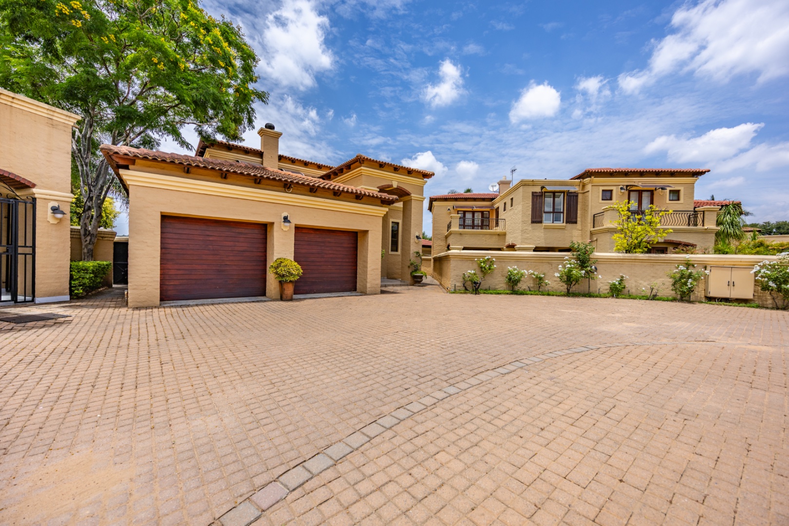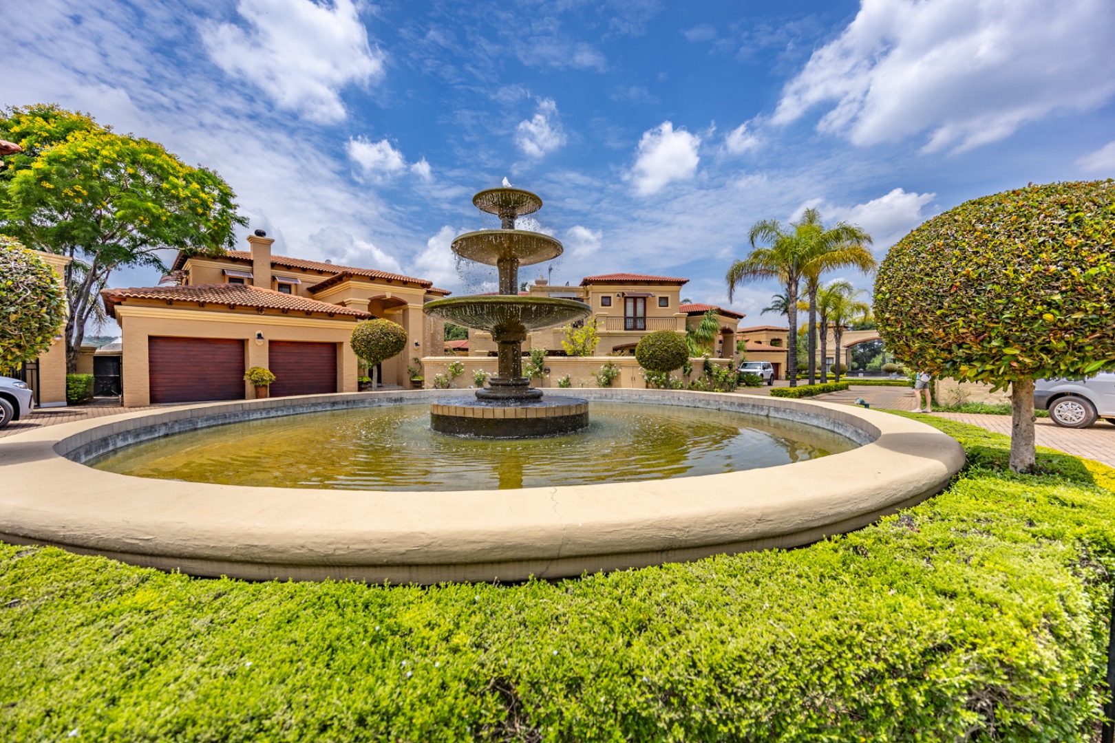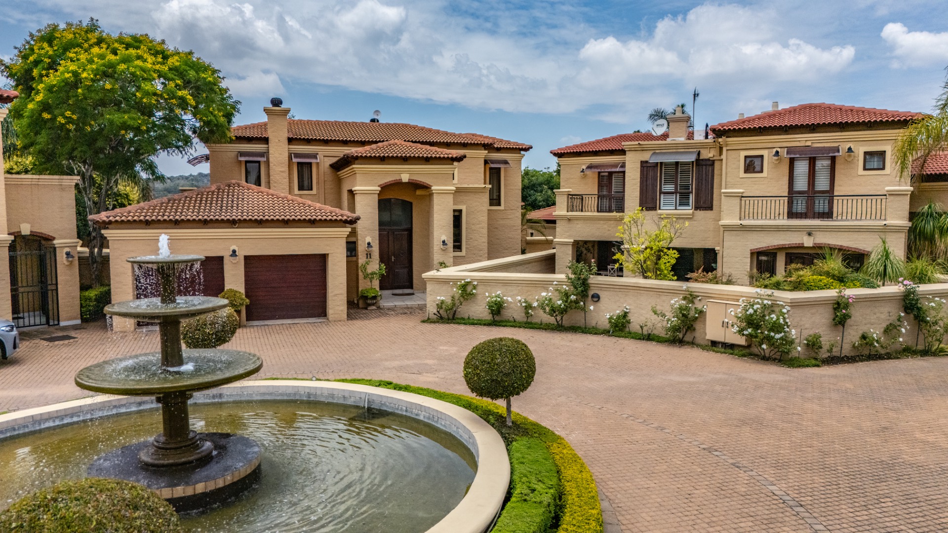 Discover this exquisite Mediterranean-style residence, a true gem nestled within a secure estate in the sought-after Lynnwood suburb of Pretoria. Boasting a generous 575 sqm under roof on a 632 sqm erf, this family home offers a blend of spacious living and elegant design, perfect for discerning buyers seeking a premium lifestyle. The property immediately impresses with its warm stucco exterior, terracotta roof tiles, and a welcoming paved driveway leading to a charming courtyard with a fountain, enhancing its kerb appeal. Step inside to an inviting entrance hall featuring elegant double wooden doors, durable tiled flooring with a decorative pattern, and an elegant staircase with a wrought iron railing. The interior layout includes three spacious lounges, a dedicated dining room, and a family TV room, providing ample space for relaxation and entertaining. Modern comforts such as air conditioning, a cozy fireplace, and a well-appointed pantry are integrated throughout, complemented by special doors and an open-plan design. This residence offers four comfortable bedrooms and three and a half bathrooms, including a luxurious en-suite bathroom, ensuring privacy and convenience for all residents. The thoughtful design extends to practical amenities, including staff quarters with outside toilets, adding to the home's functionality. Outdoor living is a highlight, with a private swimming pool set amidst a well-maintained garden and lush landscaping, complete with an irrigation system. Multiple balconies and a spacious patio provide ideal spots for alfresco dining or enjoying the South African sunshine. A built-in braai is perfect for entertaining, while two garages and additional parking ensure ample space for vehicles. Pets are allowed, making this a perfect family haven. Security is paramount within this gated community and security estate, featuring 24-hour security, a security post, and an alarm system, offering peace of mind. Lynnwood is a prestigious Pretoria suburb known for its leafy streets, excellent schools, and convenient access to amenities, making it an ideal location for family living. Key Features: * 4 Bedrooms, 3.5 Bathrooms (1 En-suite) * 3 Lounges, Dining Room, Family TV Room * Private Swimming Pool & Landscaped Garden * Multiple Balconies & Patio with Built-in Braai * 2 Garages & Additional Parking * Air Conditioning & Fireplace * Staff Quarters * 24-Hour Security Estate * Pet-Friendly