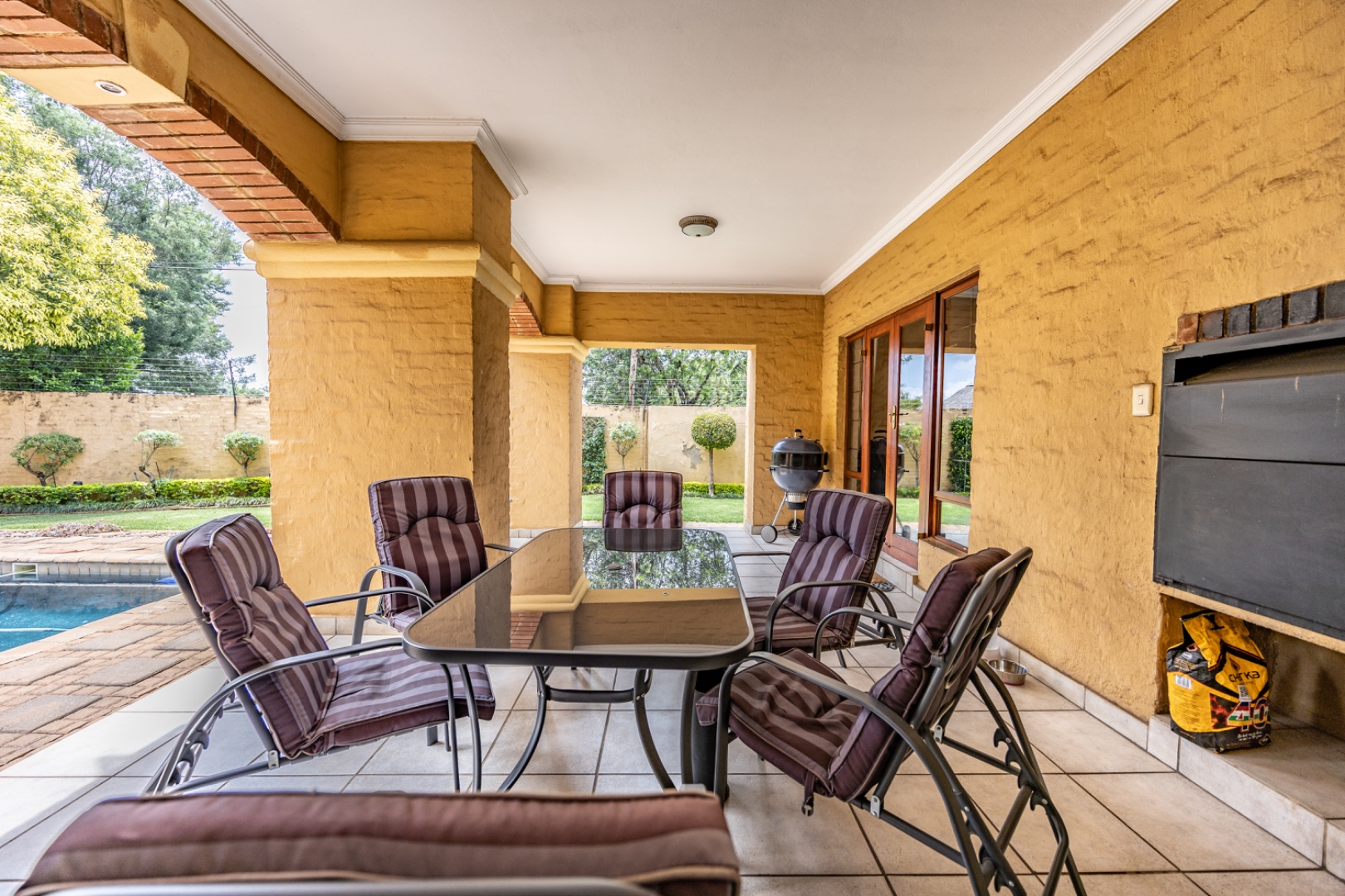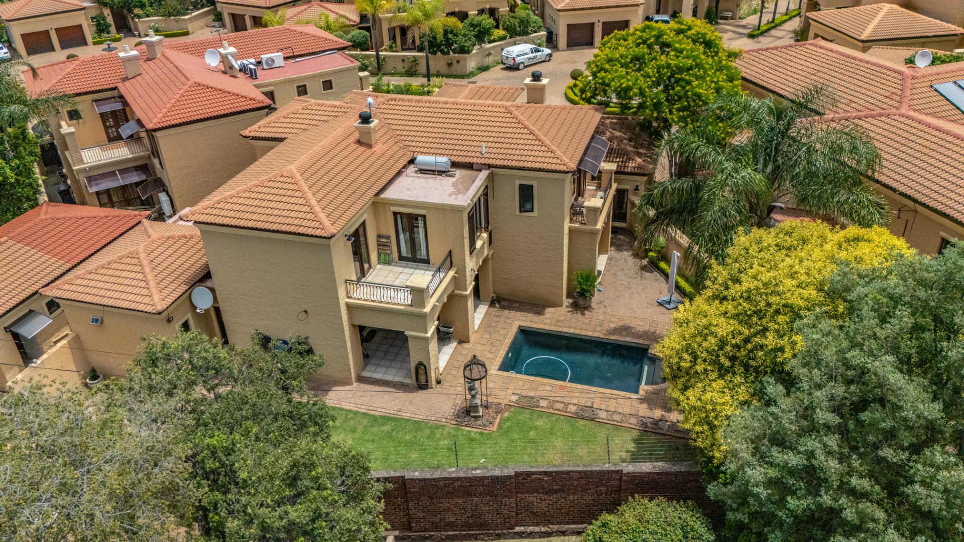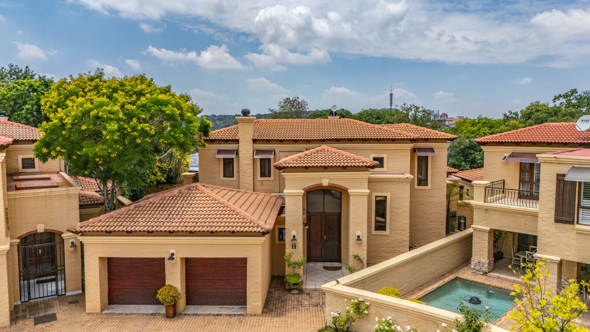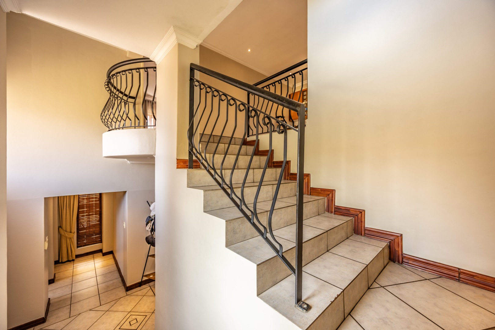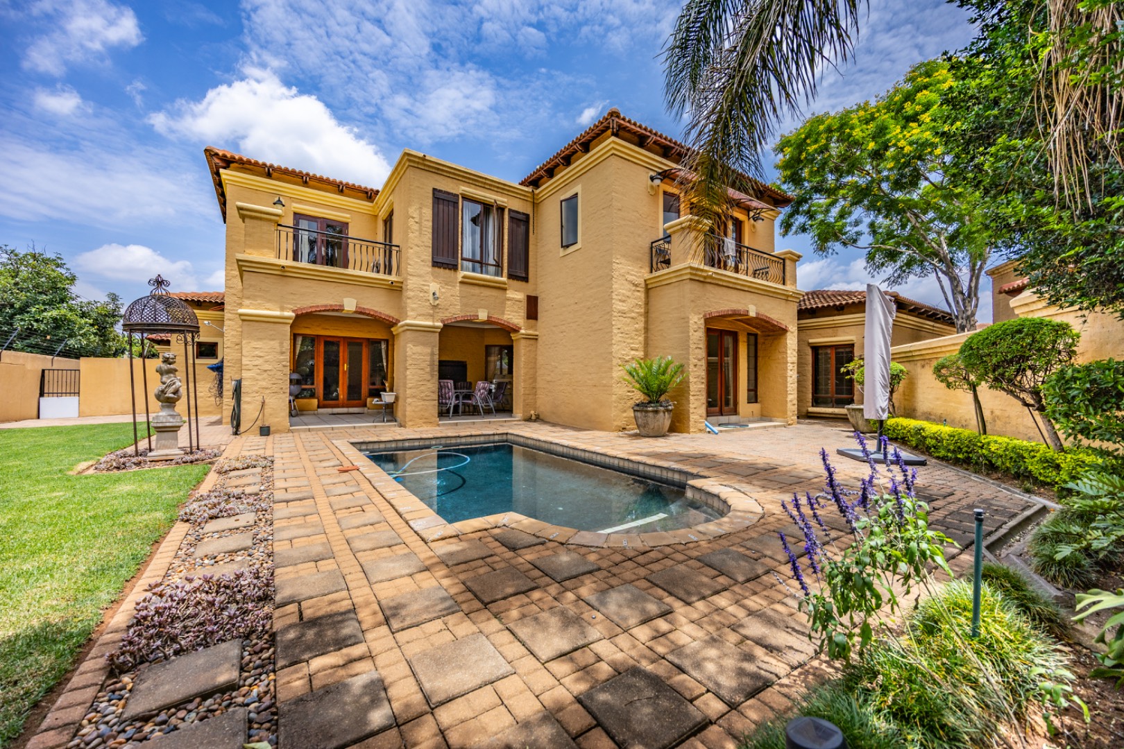 Discover this exquisite Mediterranean-style residence, a true gem nestled within a secure estate in the sought-after Lynnwood suburb of Pretoria. Boasting a generous 575 sqm under roof on a 632 sqm erf, this family home offers a blend of spacious living and elegant design, perfect for discerning buyers seeking a premium lifestyle. The property immediately impresses with its warm stucco exterior, terracotta roof tiles, and a welcoming paved driveway leading to a charming courtyard with a fountain, enhancing its kerb appeal. Step inside to an inviting entrance hall featuring elegant double wooden doors, durable tiled flooring with a decorative pattern, and an elegant staircase with a wrought iron railing. The interior layout includes three spacious lounges, a dedicated dining room, and a family TV room, providing ample space for relaxation and entertaining. Modern comforts such as air conditioning, a cozy fireplace, and a well-appointed pantry are integrated throughout, complemented by special doors and an open-plan design. This residence offers four comfortable bedrooms and three and a half bathrooms, including a luxurious en-suite bathroom, ensuring privacy and convenience for all residents. The thoughtful design extends to practical amenities, including staff quarters with outside toilets, adding to the home's functionality. Outdoor living is a highlight, with a private swimming pool set amidst a well-maintained garden and lush landscaping, complete with an irrigation system. Multiple balconies and a spacious patio provide ideal spots for alfresco dining or enjoying the South African sunshine. A built-in braai is perfect for entertaining, while two garages and additional parking ensure ample space for vehicles. Pets are allowed, making this a perfect family haven. Security is paramount within this gated community and security estate, featuring 24-hour security, a security post, and an alarm system, offering peace of mind. Lynnwood is a prestigious Pretoria suburb known for its leafy streets, excellent schools, and convenient access to amenities, making it an ideal location for family living. Key Features: * 4 Bedrooms, 3.5 Bathrooms (1 En-suite) * 3 Lounges, Dining Room, Family TV Room * Private Swimming Pool & Landscaped Garden * Multiple Balconies & Patio with Built-in Braai * 2 Garages & Additional Parking * Air Conditioning & Fireplace * Staff Quarters * 24-Hour Security Estate * Pet-Friendly
