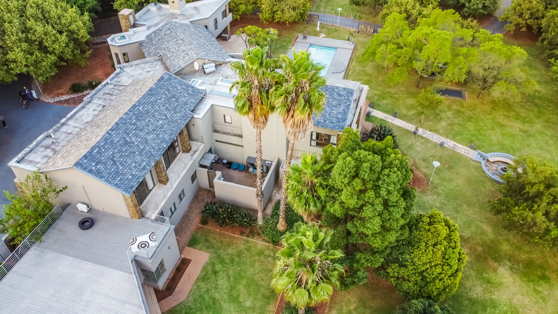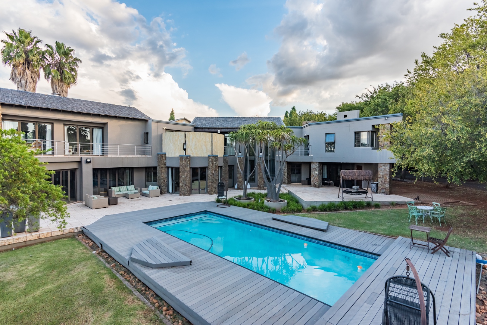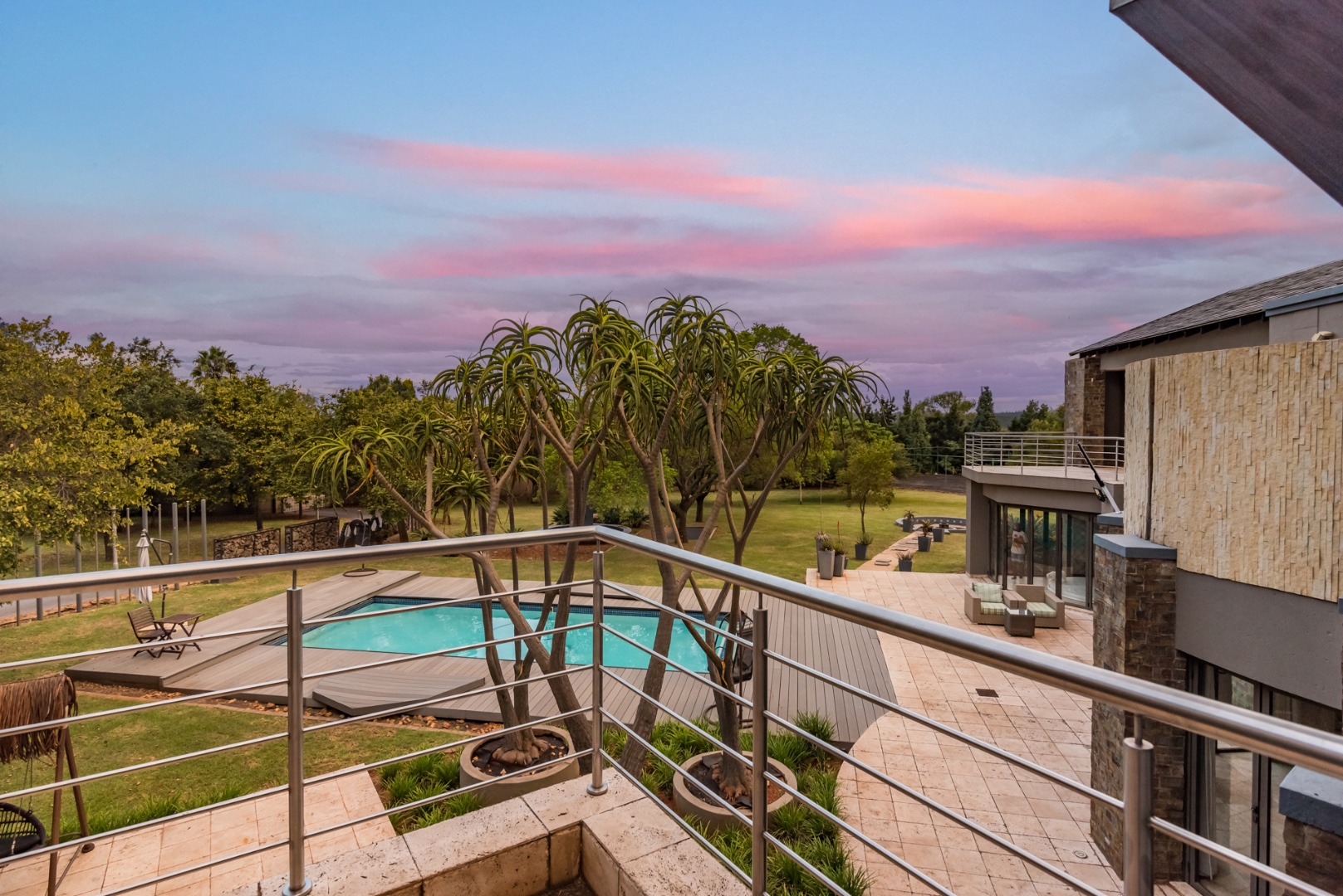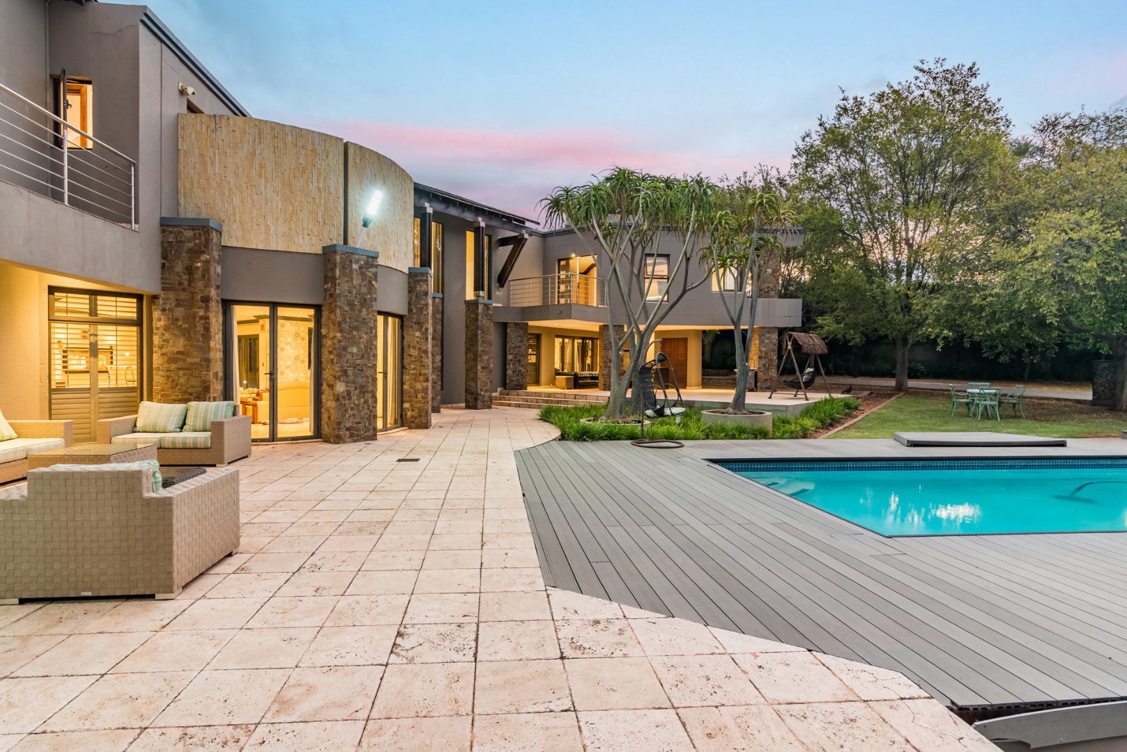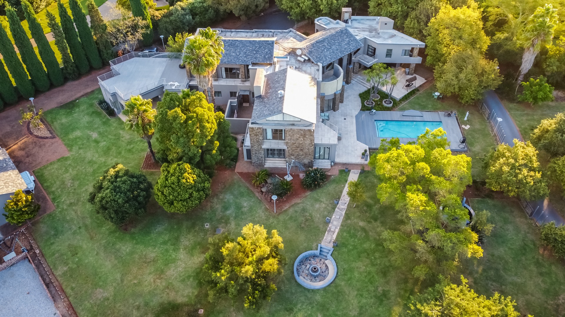 When you walk into this home you are immediately embraced by a sense of calm derived from the light and airy spaces. This home is a fine example of 21st century architecture evident in the usage of perfect symmetry with clean, straight lines and simplified yet elegant designs that add a classy ambience to the overall visually pleasing design. Situated on a very special stand inside Mooikloof Equestrian Estate it ensures privacy to the owners and unobstructed views. The comfortable modern style of the home lends itself to an abundance of natural light and sun in which the home owners relish. The magnificent open-plan Italian imported kitchen forms the heart of the house, from where the cook/s can be part of the socializing in the living rooms. Entertaining will be a real delight with all the living rooms (6) functioning on aluminum stack doors opening onto the huge patios overlooking the huge swimming pool. Entertaining can be done on a large scale with all the living rooms interlinked between each other but if you do prefer a cozy atmosphere between only a few friends you could close off some of the doors for more privacy. The bar, Jacuzzi and indoor braai add extra pleasure to the entertaining areas.