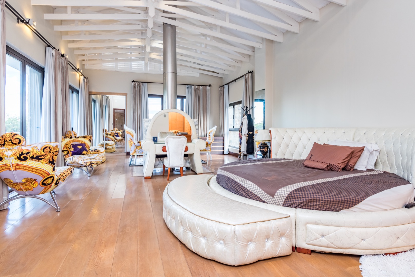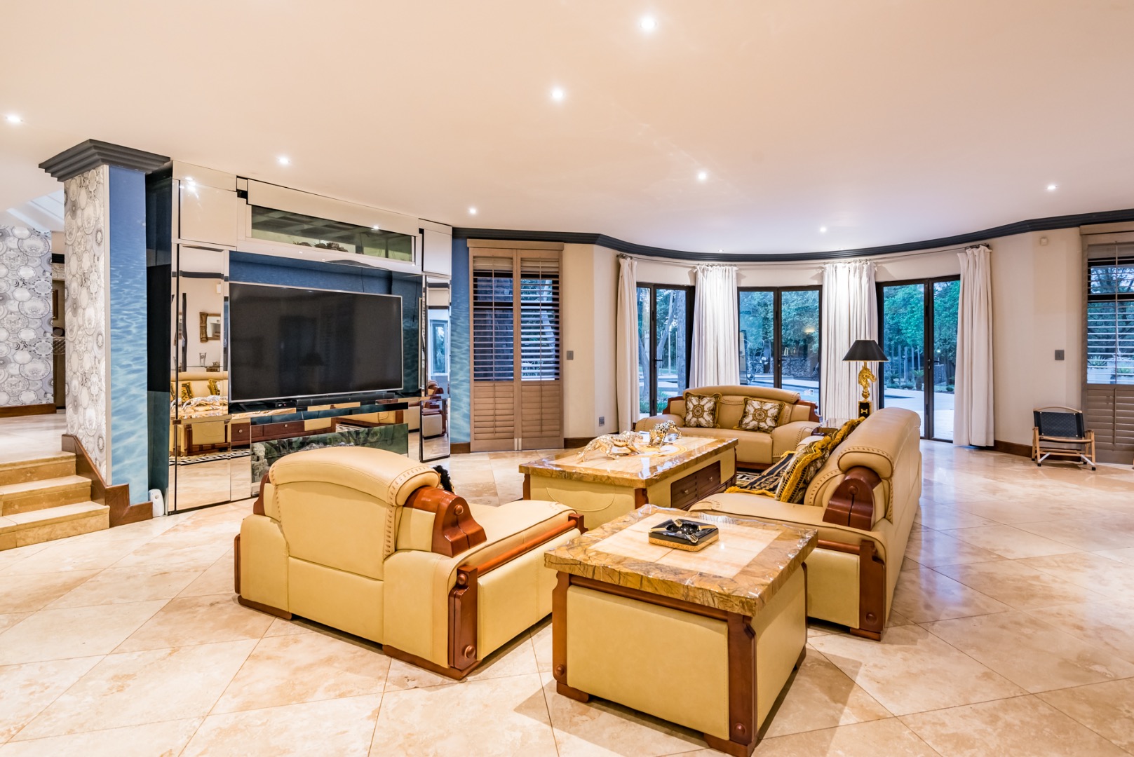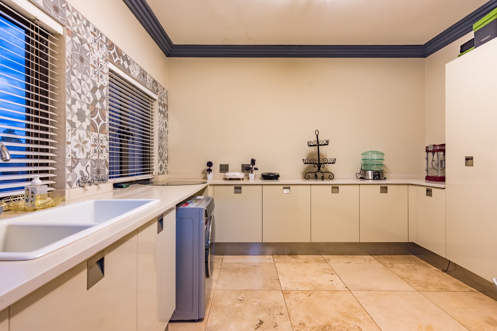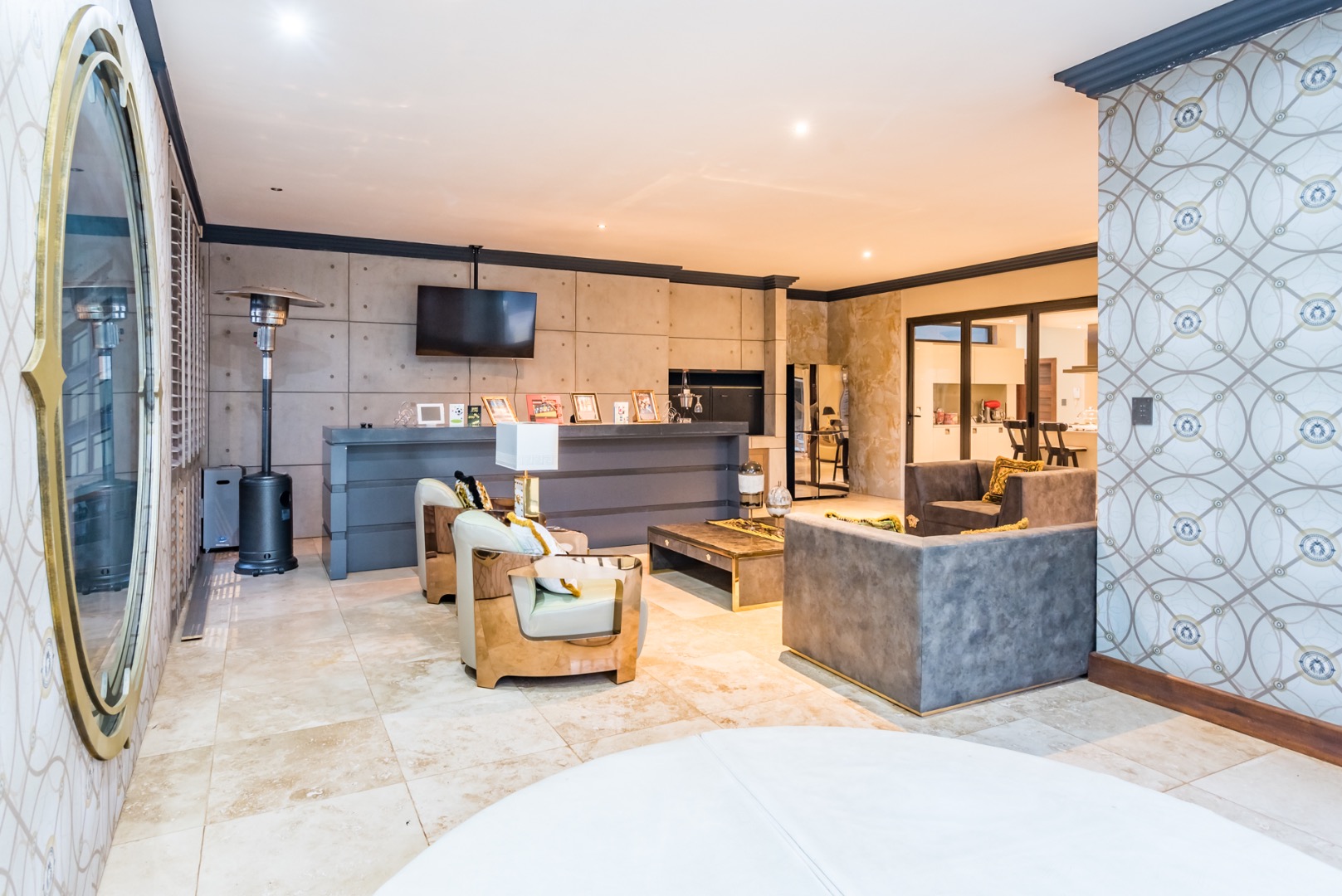 Furthermore the house offers: 5 bedrooms all with en-suite bathrooms; 5 living rooms; gym, flat with 2 en suite bedrooms, 2 living rooms and fully equipped kitchen with it’s own garden; 4 store rooms, 6 garages, 3 carports, 2 servants’ quarters. Extra features include: 3-phase electricity, air-conditioning, generator. Huge laundry and separate scullery. The garden all around the house is complementing this amazing, contemporary special home – a home that only could be appreciated by viewing it.